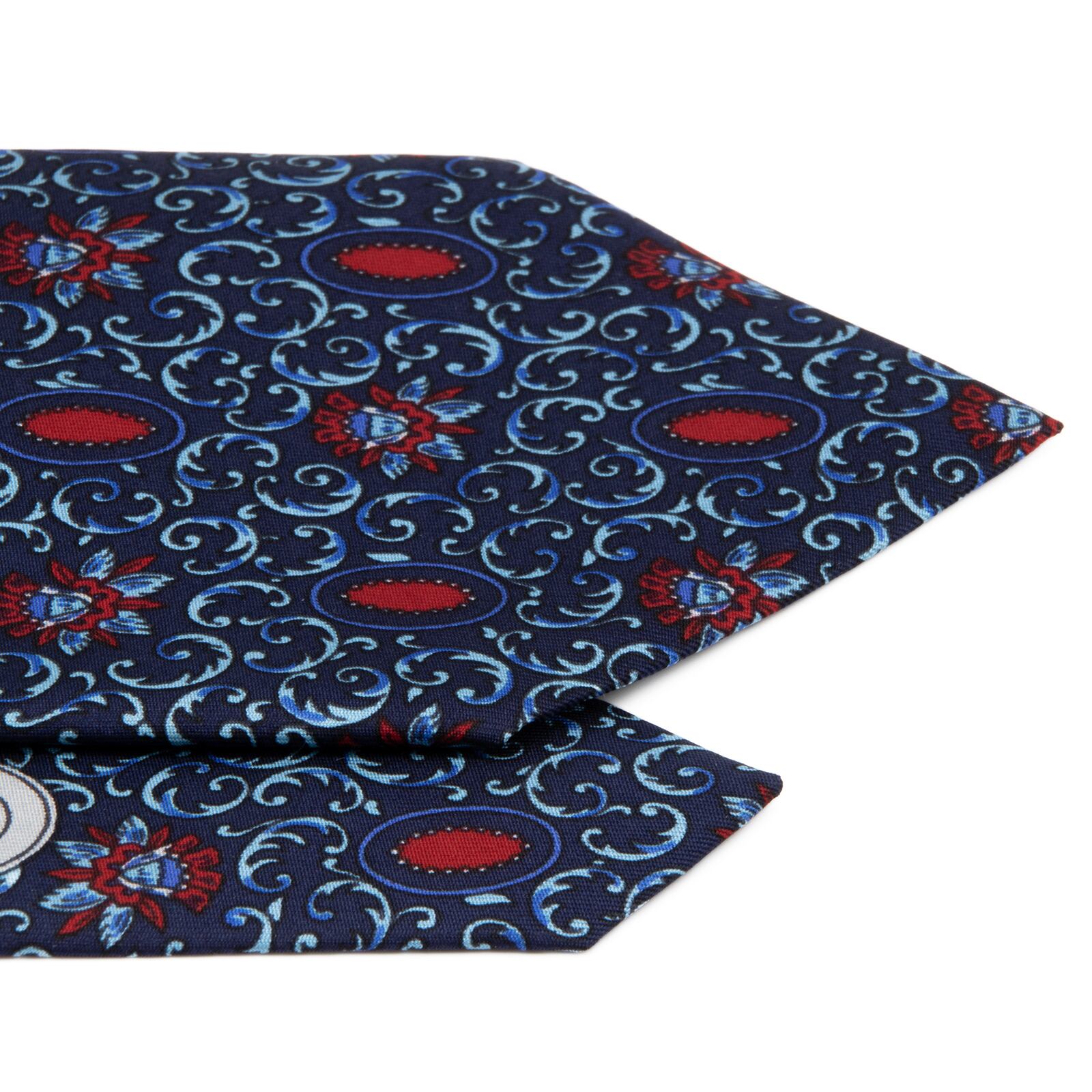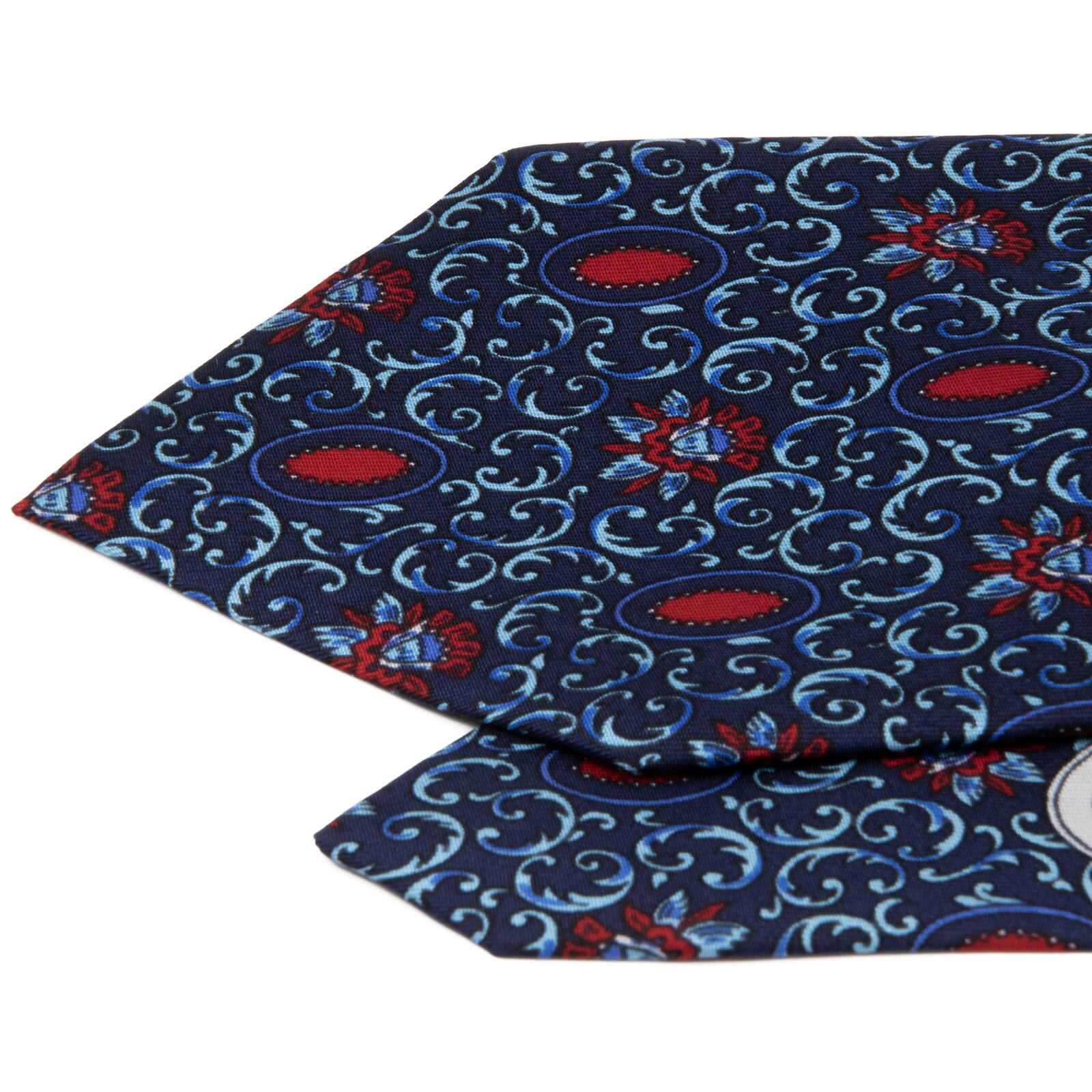 深みのあるネイビーブルーを基調に、水色とレッドのコントラストが効いた総柄デザインが、洗練された大人の余裕を演出いたします。