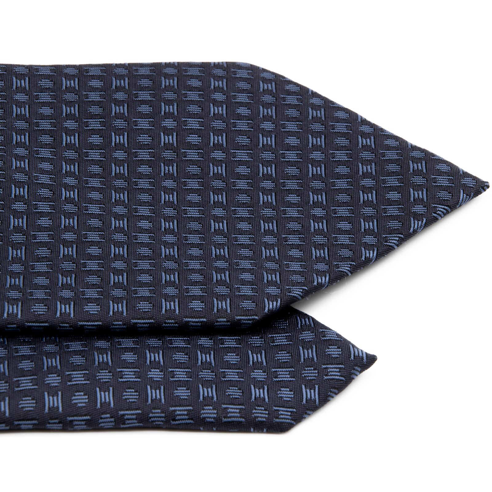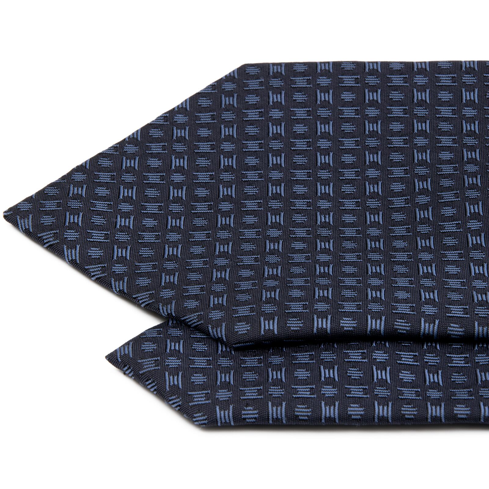 深みのあるネイビーブルーを基調とし、規則正しく配置された総柄デザインが、胸元に大人の余裕と確かな品格を演出いたします。