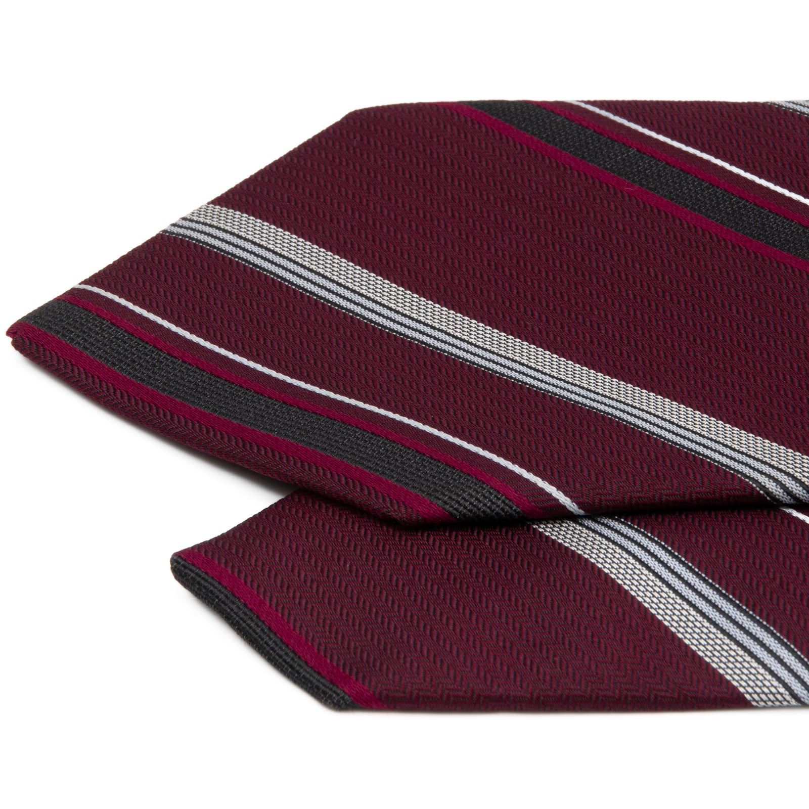 ワインレッドを基調とした落ち着いたストライプ柄が、胸元に洗練された都会的な印象を与えます。