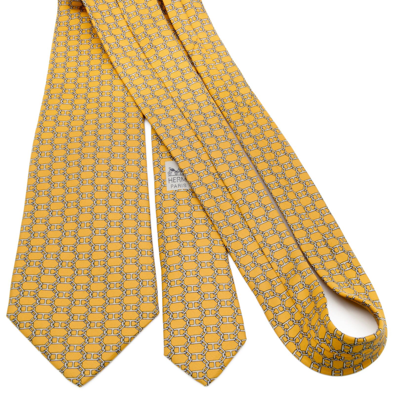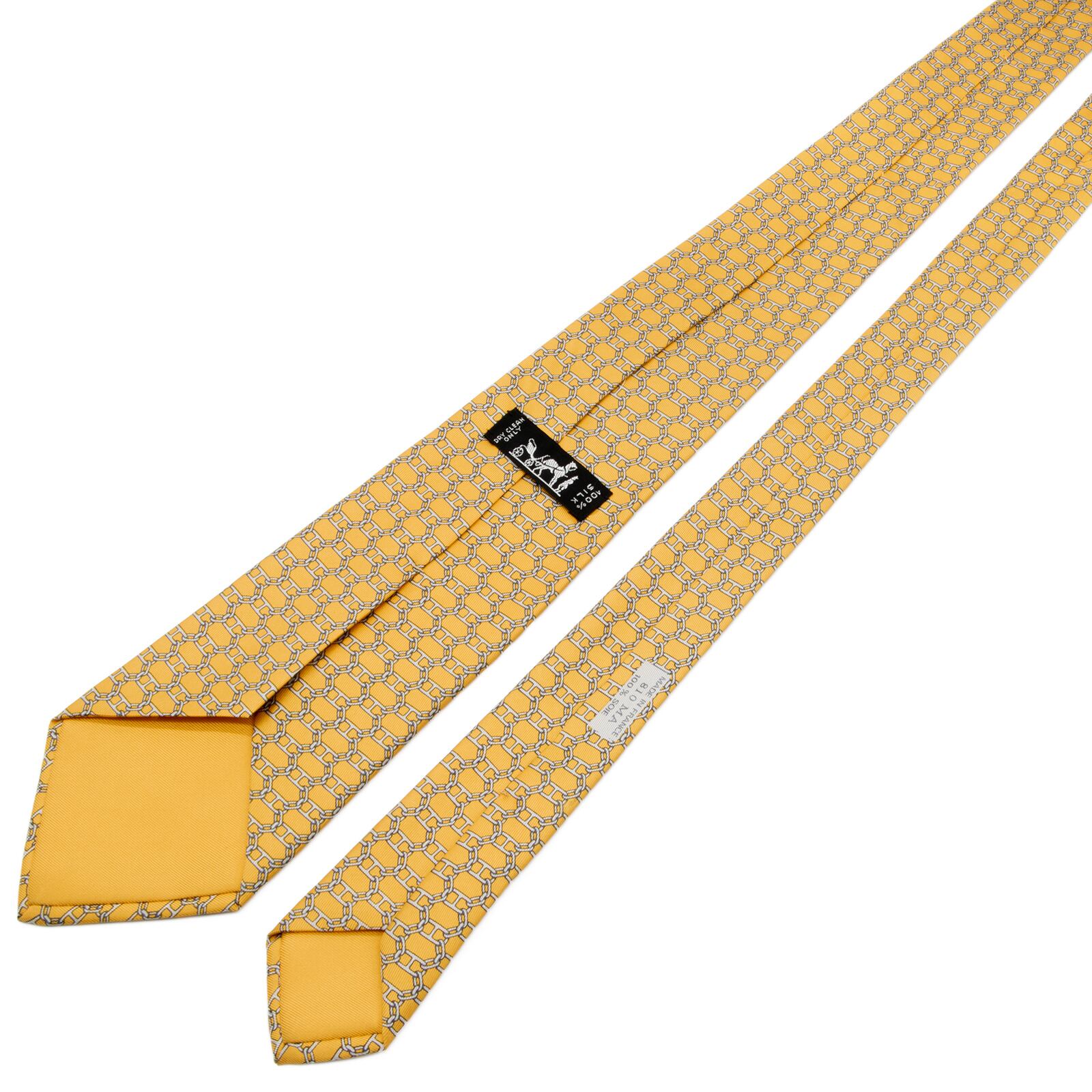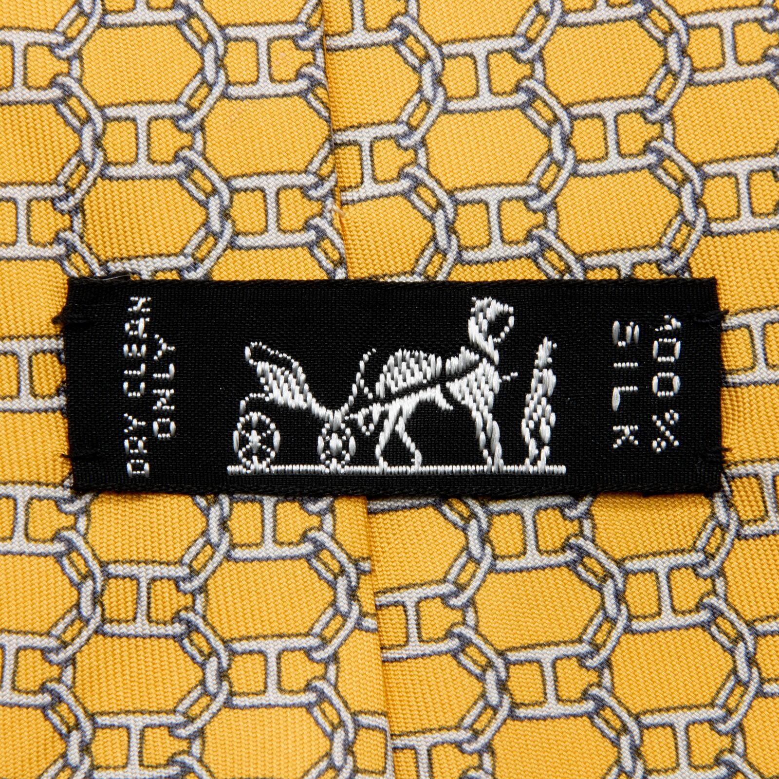 新品同様 送料無料 エルメス ネクタイ レギュラータイ 黄色 イエロー グレー ネイビーブルー 総柄 シェーヌダンクル 錨 チェーン 綺麗 P813