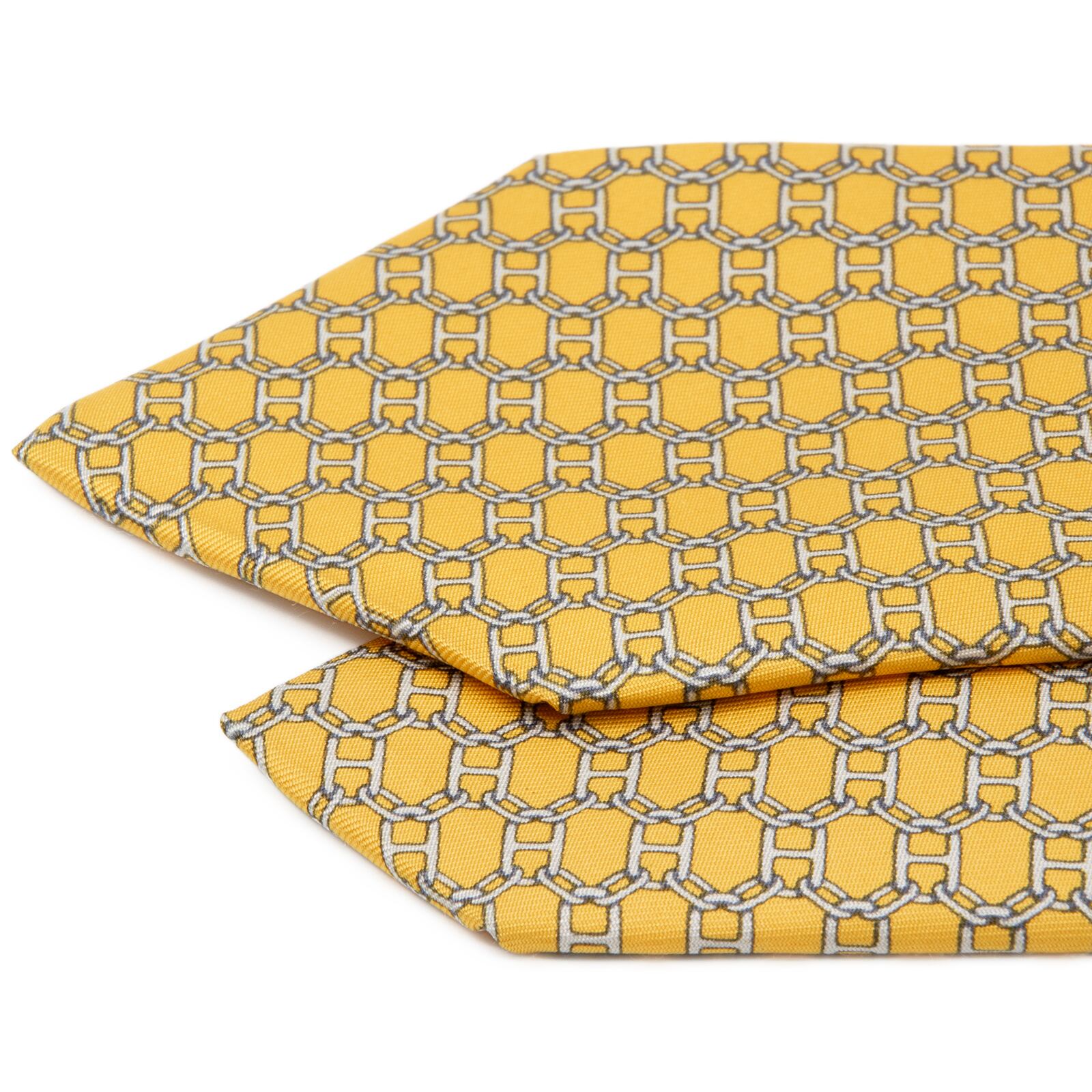 鮮やかなイエローを基調とした上質なシルク生地に、グレーとネイビーブルーで描かれたチェーン柄が美しく映えております。