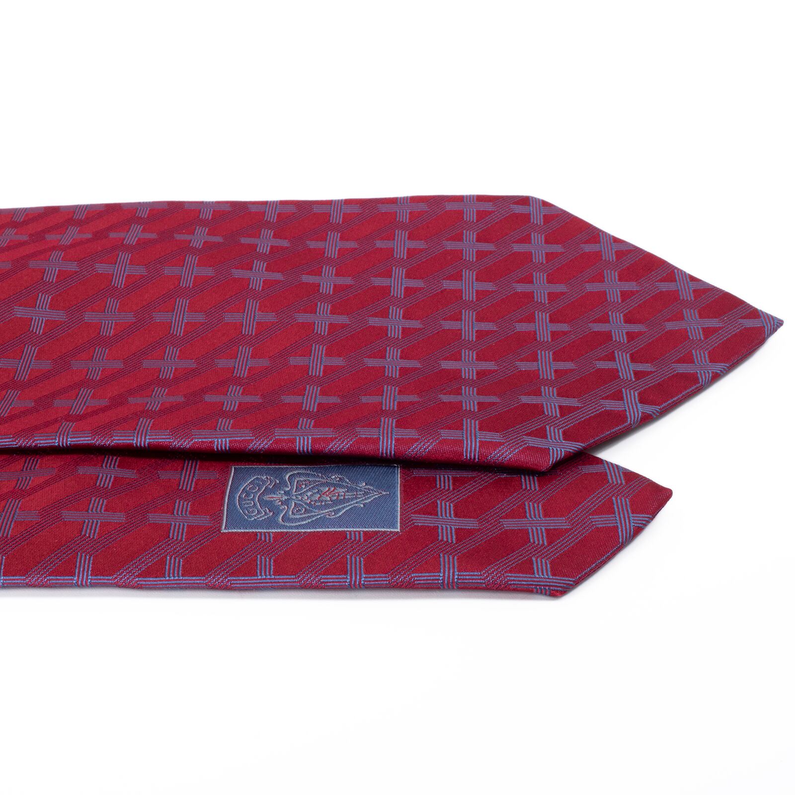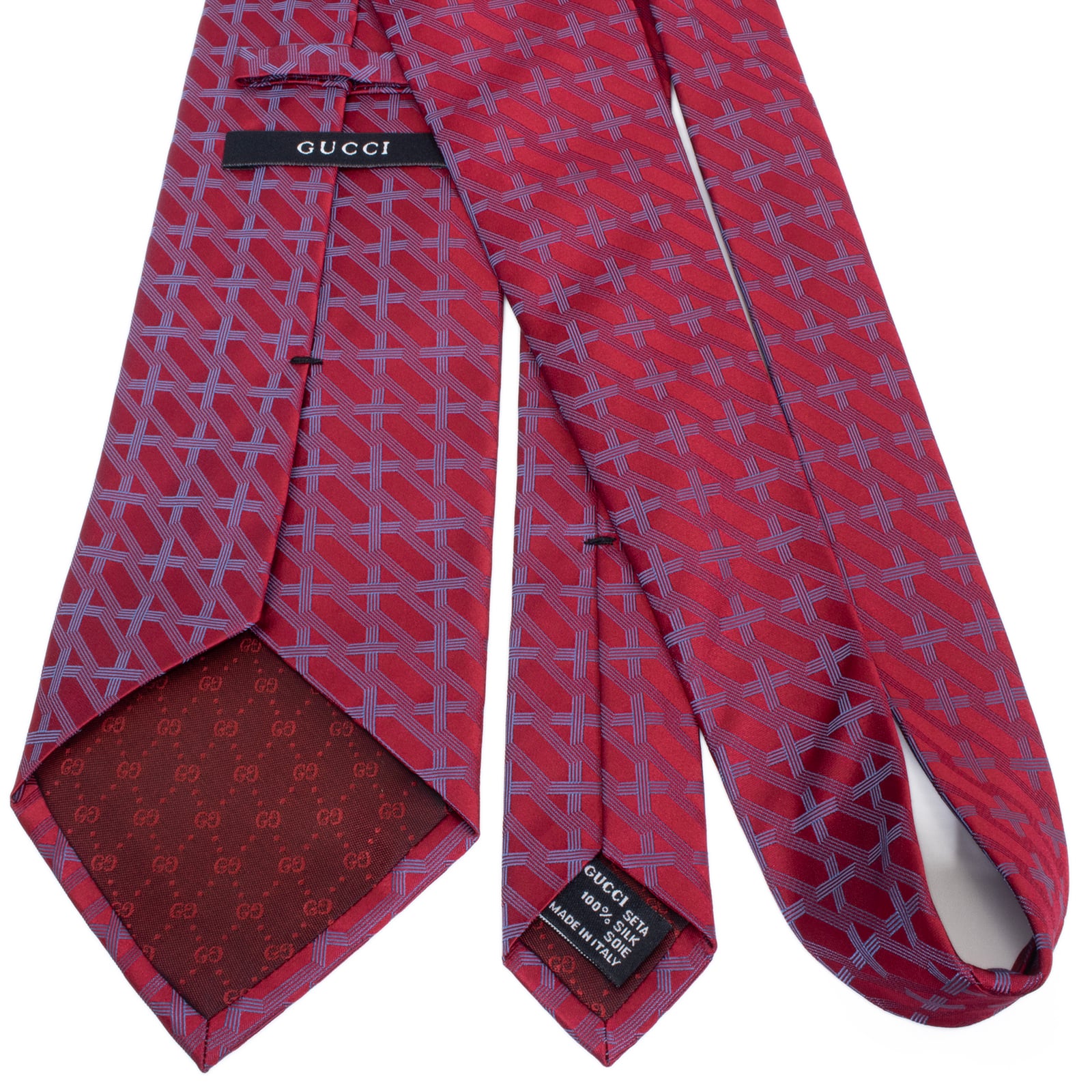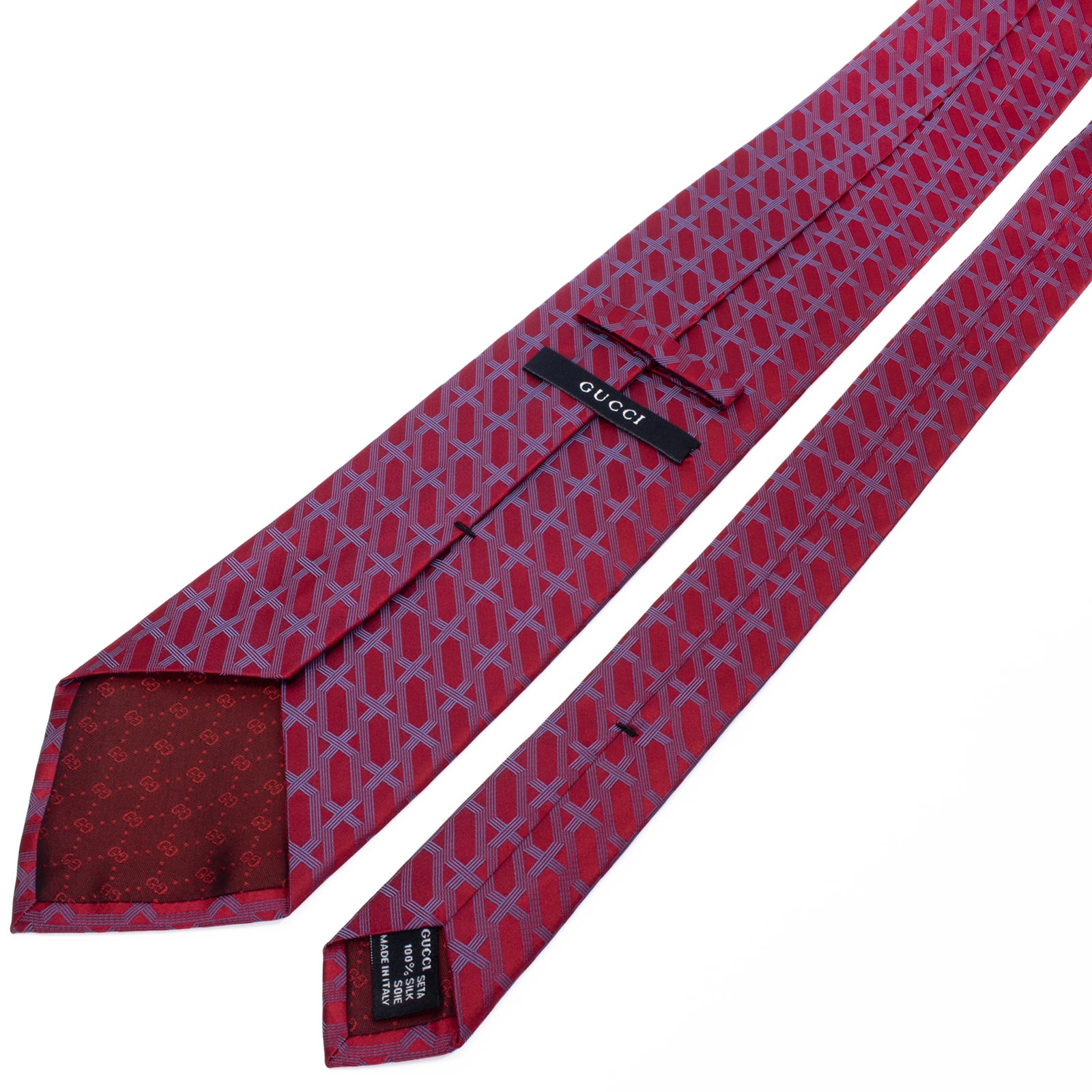 こちらは、情熱的なレッドに幾何学模様が整然と並ぶ、グッチのネクタイでございます。