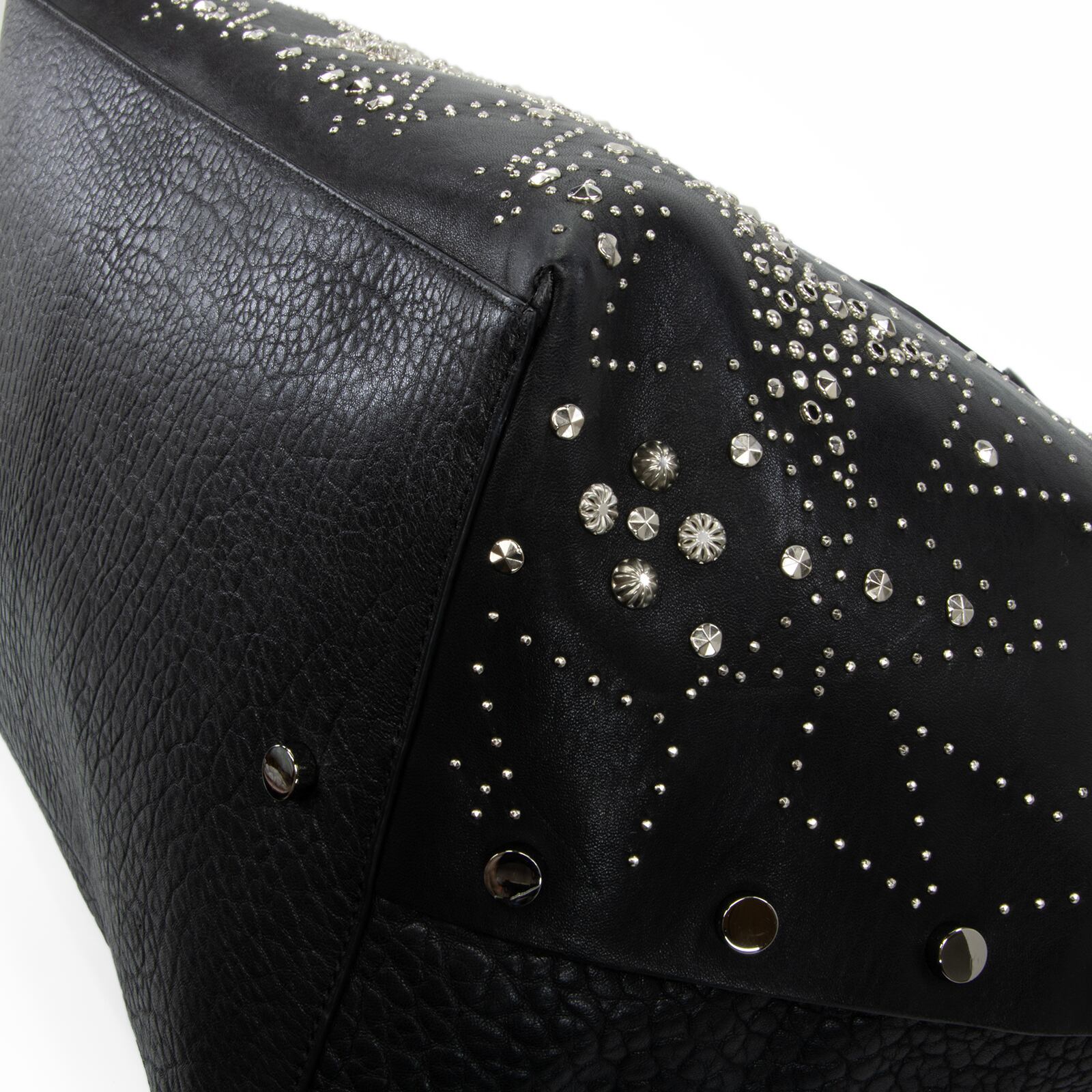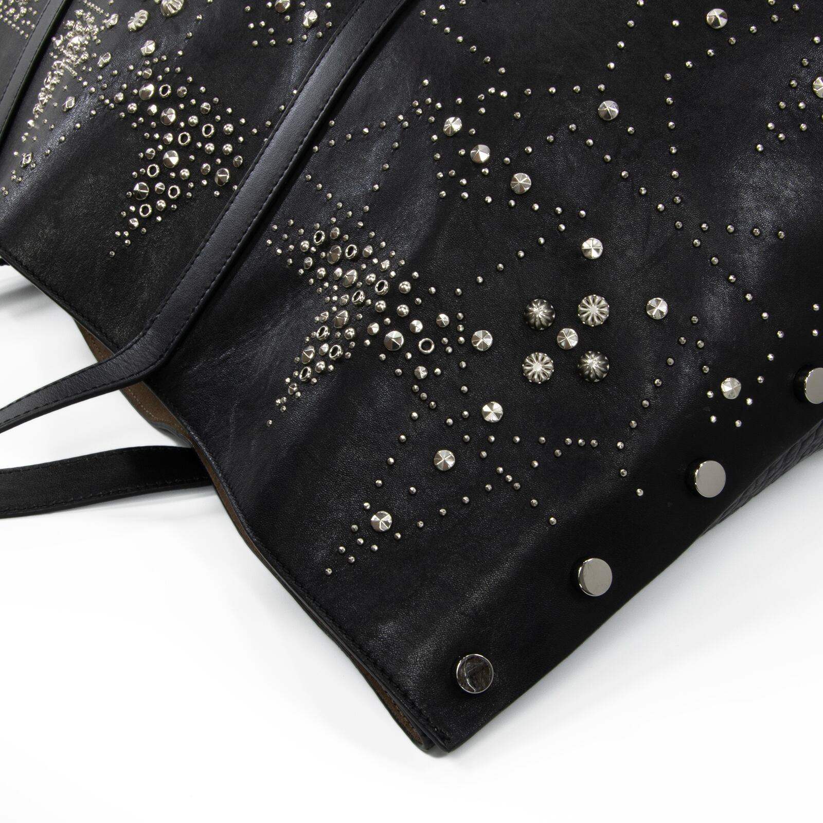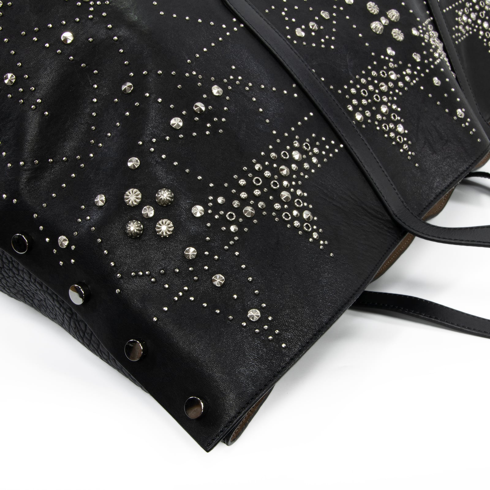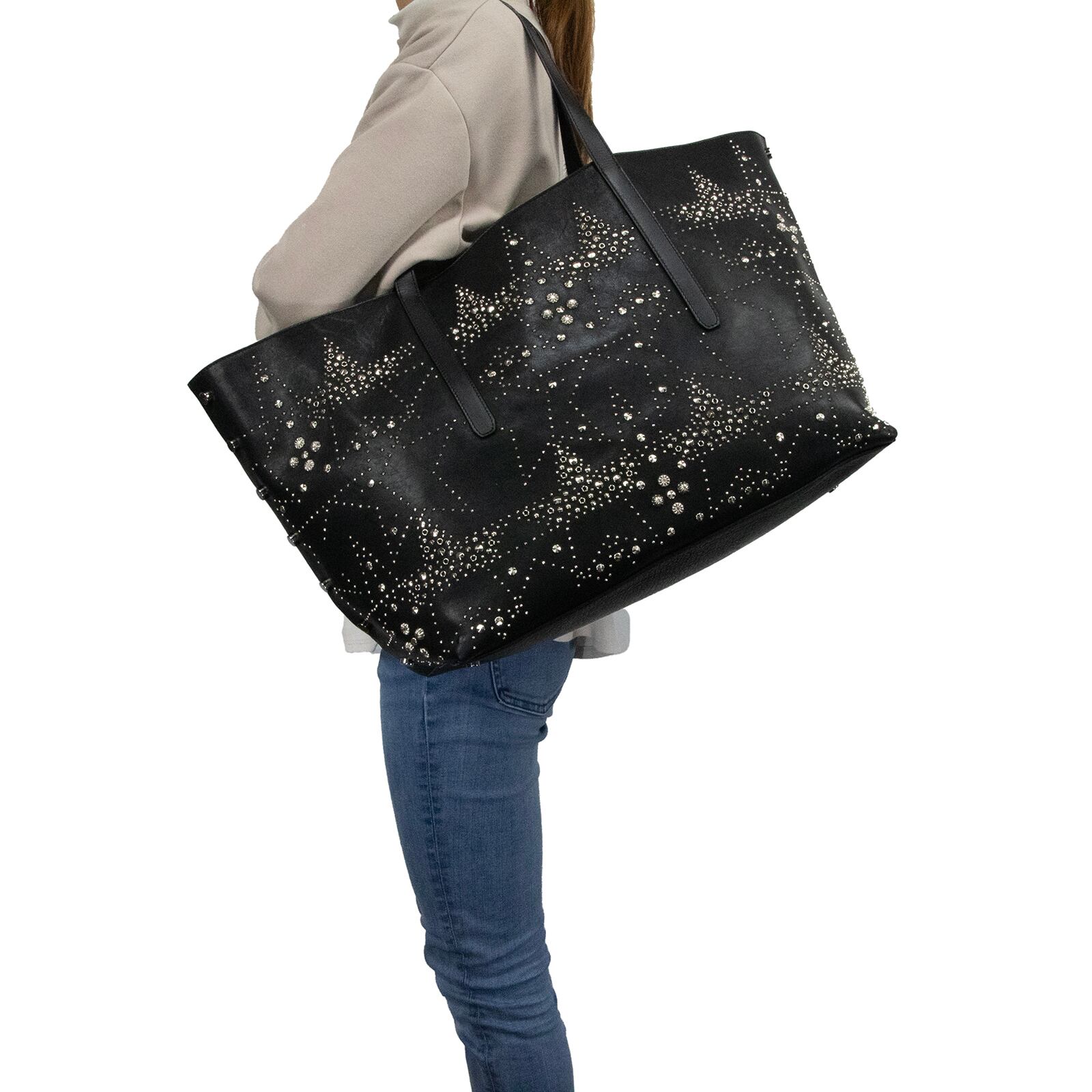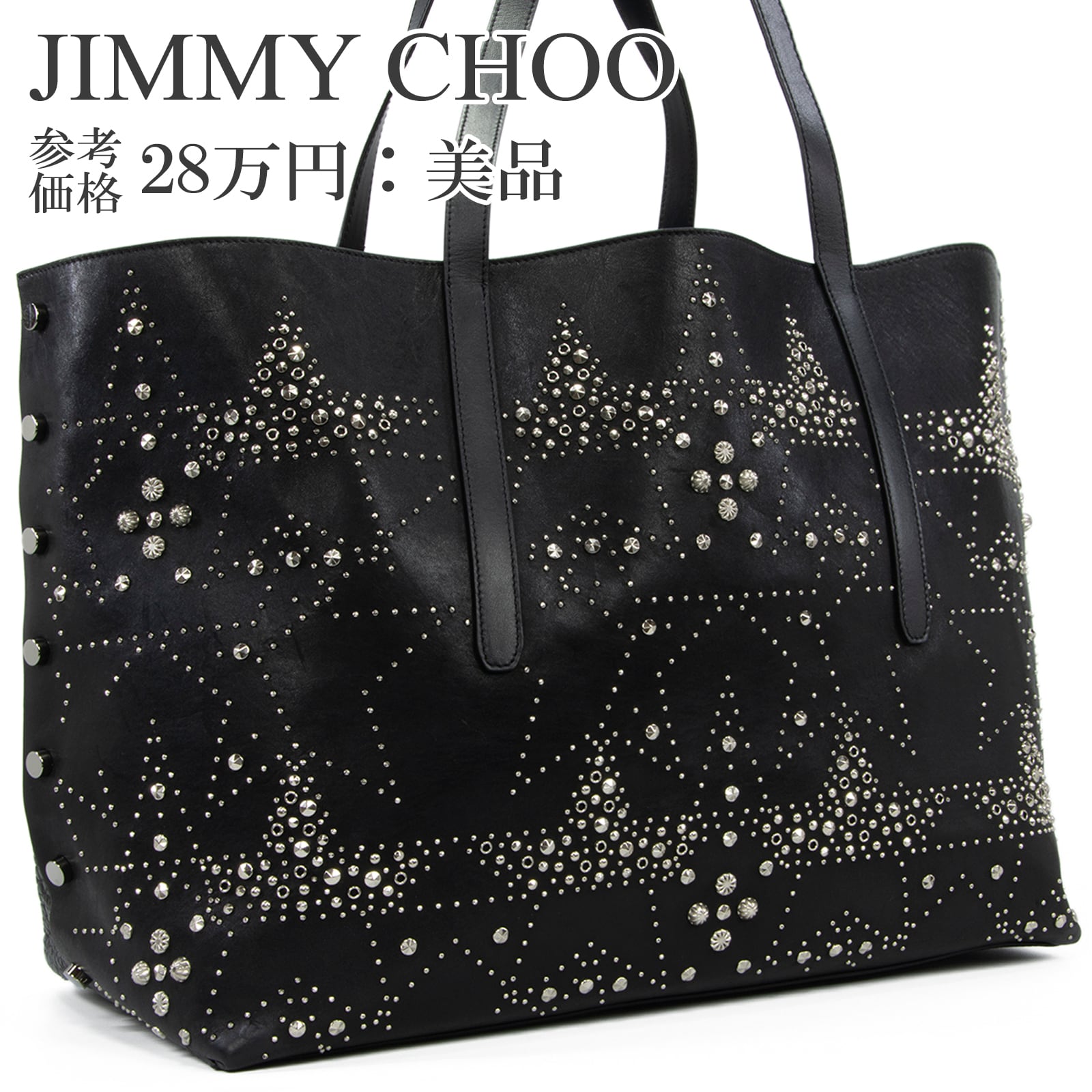 こちらは、満天の星空を思わせる繊細なスタッズが輝きを放つ、ジミーチュウの2017年プレフォールコレクション限定モデル・ツイスト イースト ウェスト・トートバッグでございます。