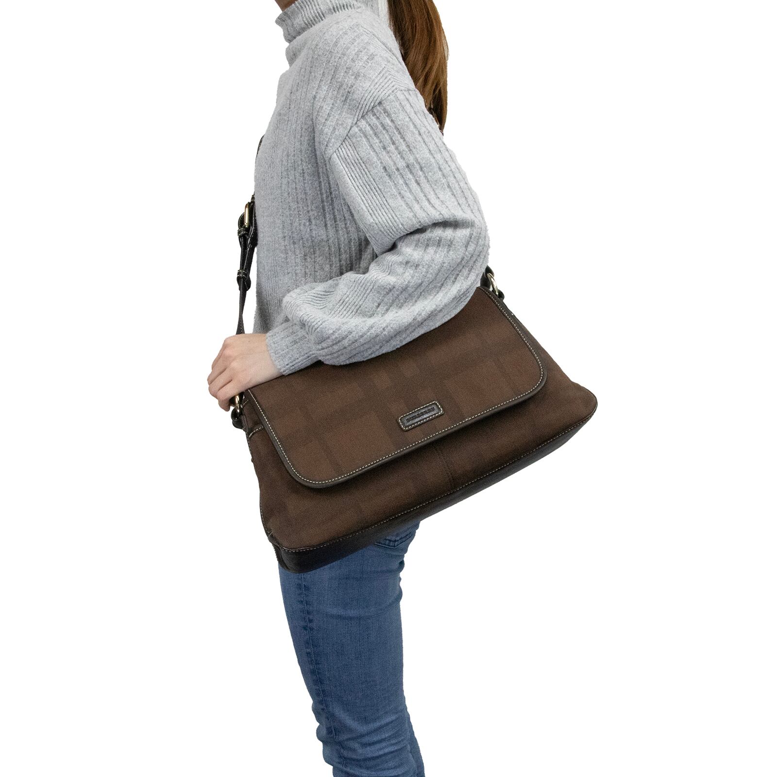 落ち着いたブラウンのキャンバス地が、お客様の装いに洗練された大人の余裕を添えてくれます。