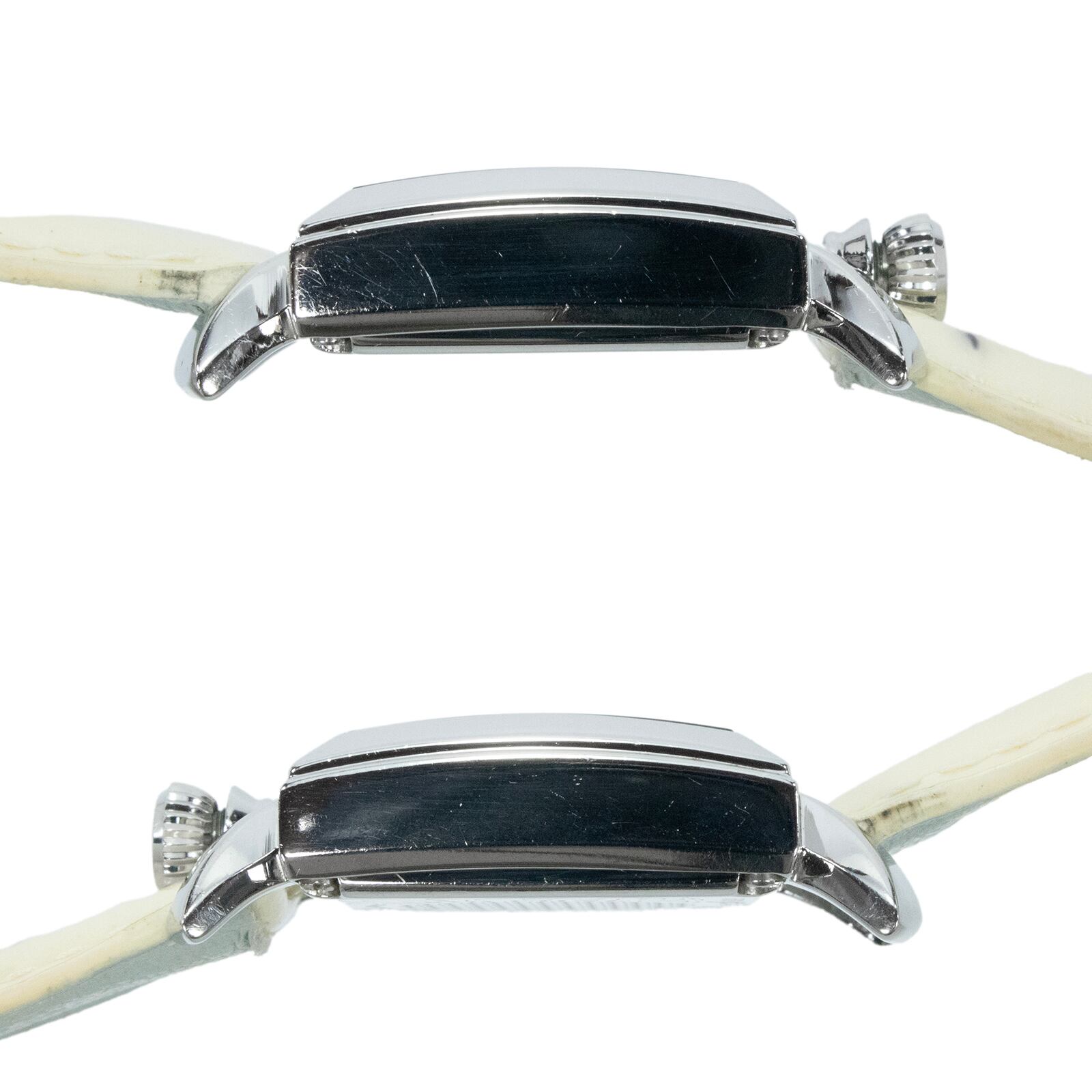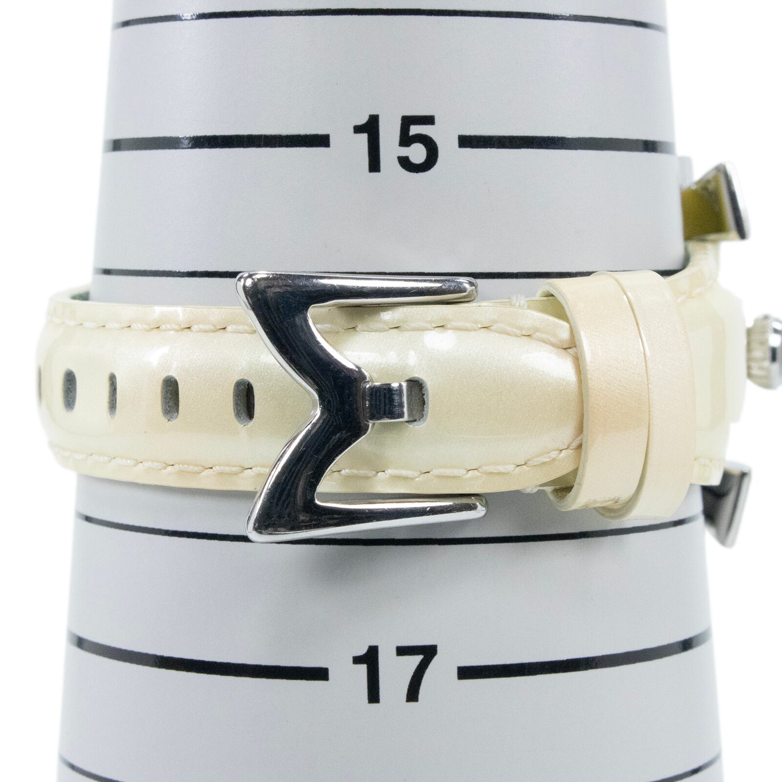 ピンクの輝きを放つシェル文字盤と、パールホワイトのパテントレザーベルトが、手首を動かすたびに優美な表情を見せてくれます。