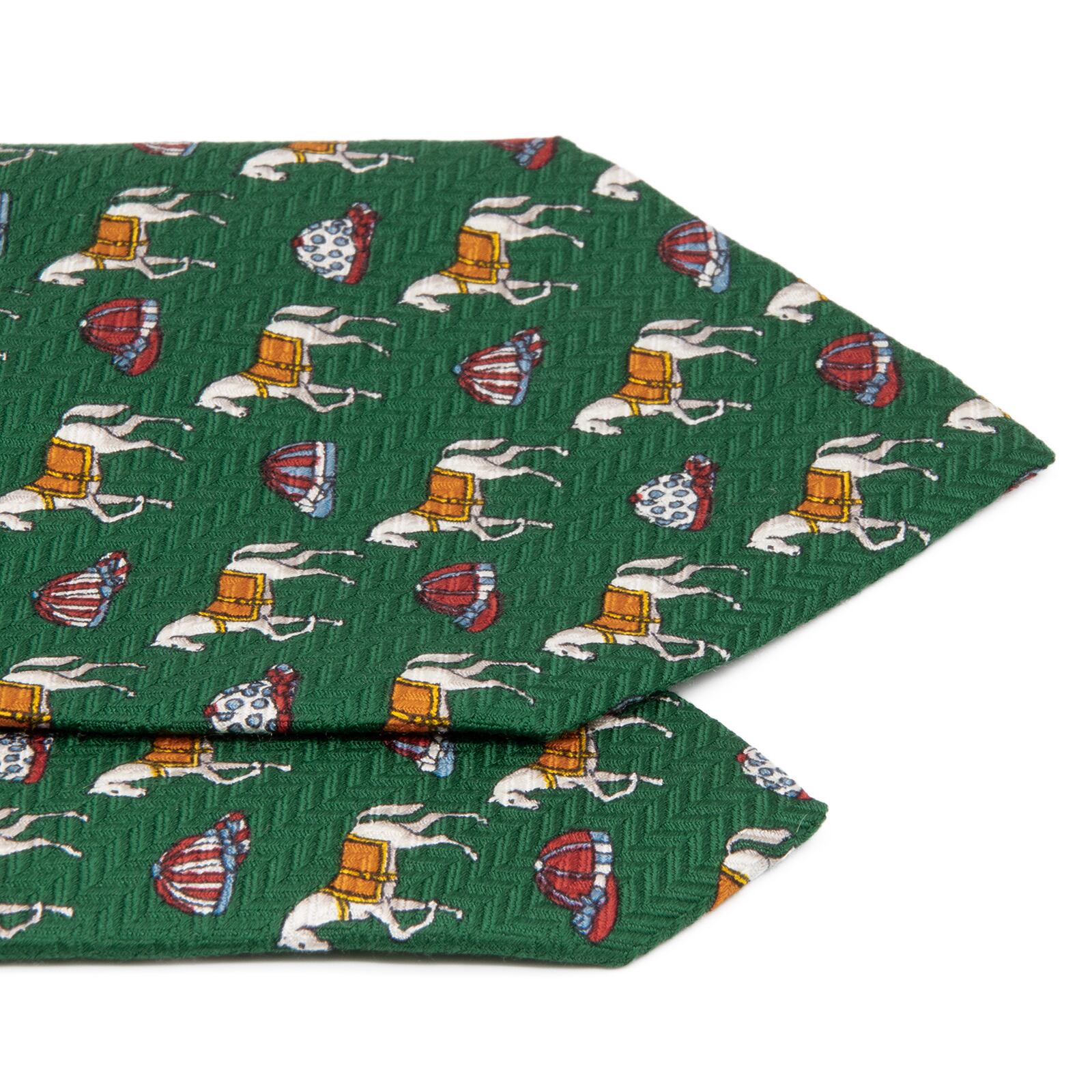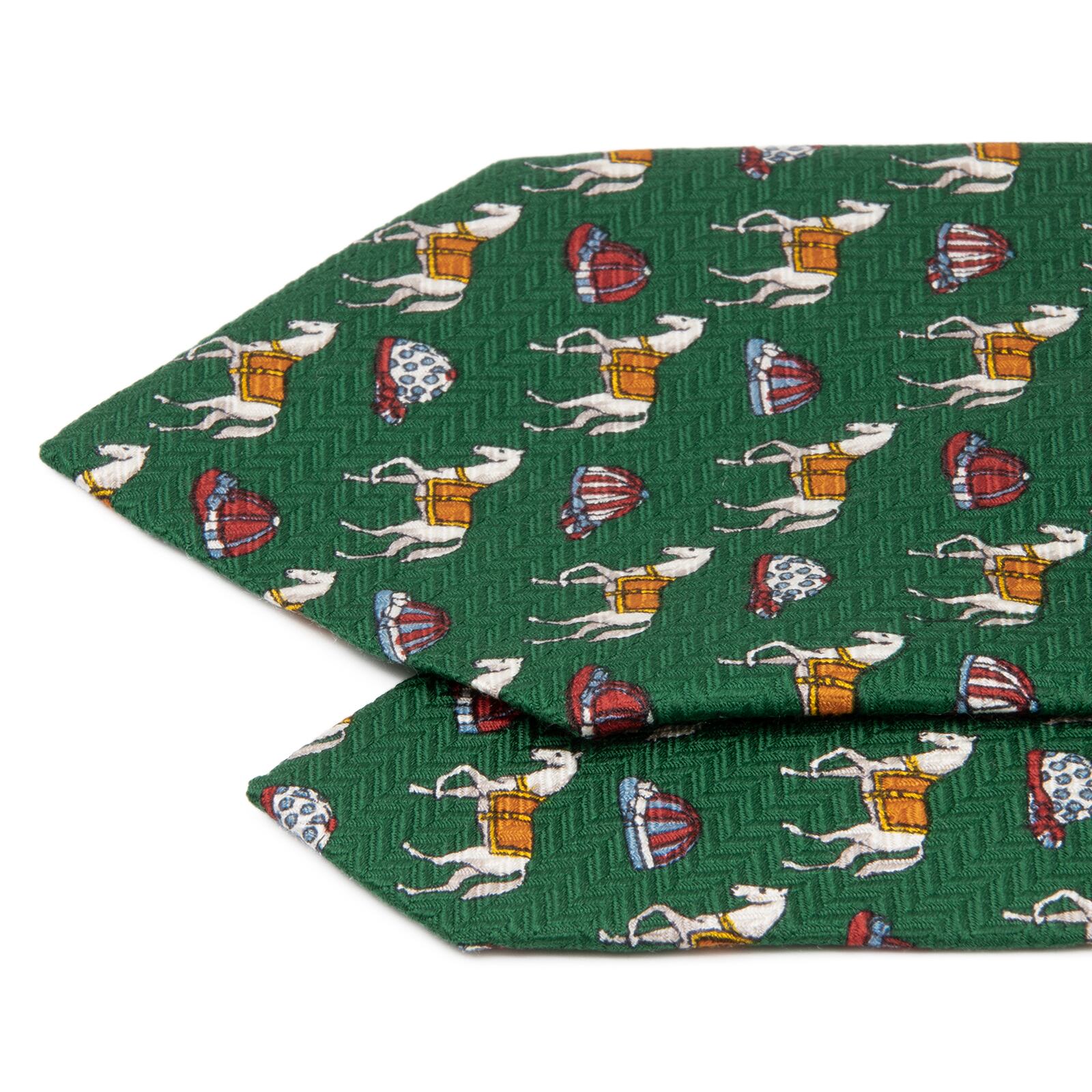 深いグリーンを基調とした生地に、馬や帽子のモチーフが美しく散りばめられております。