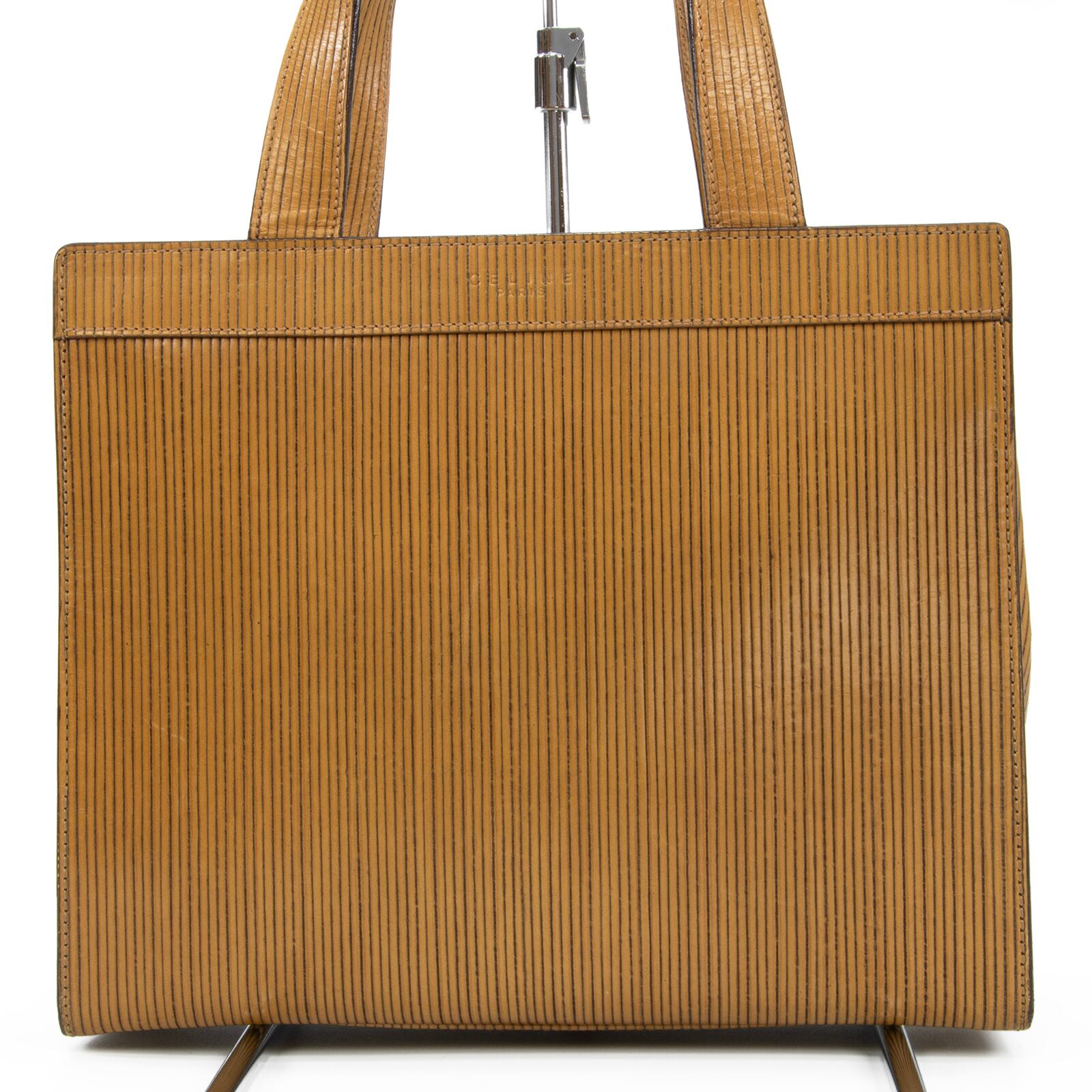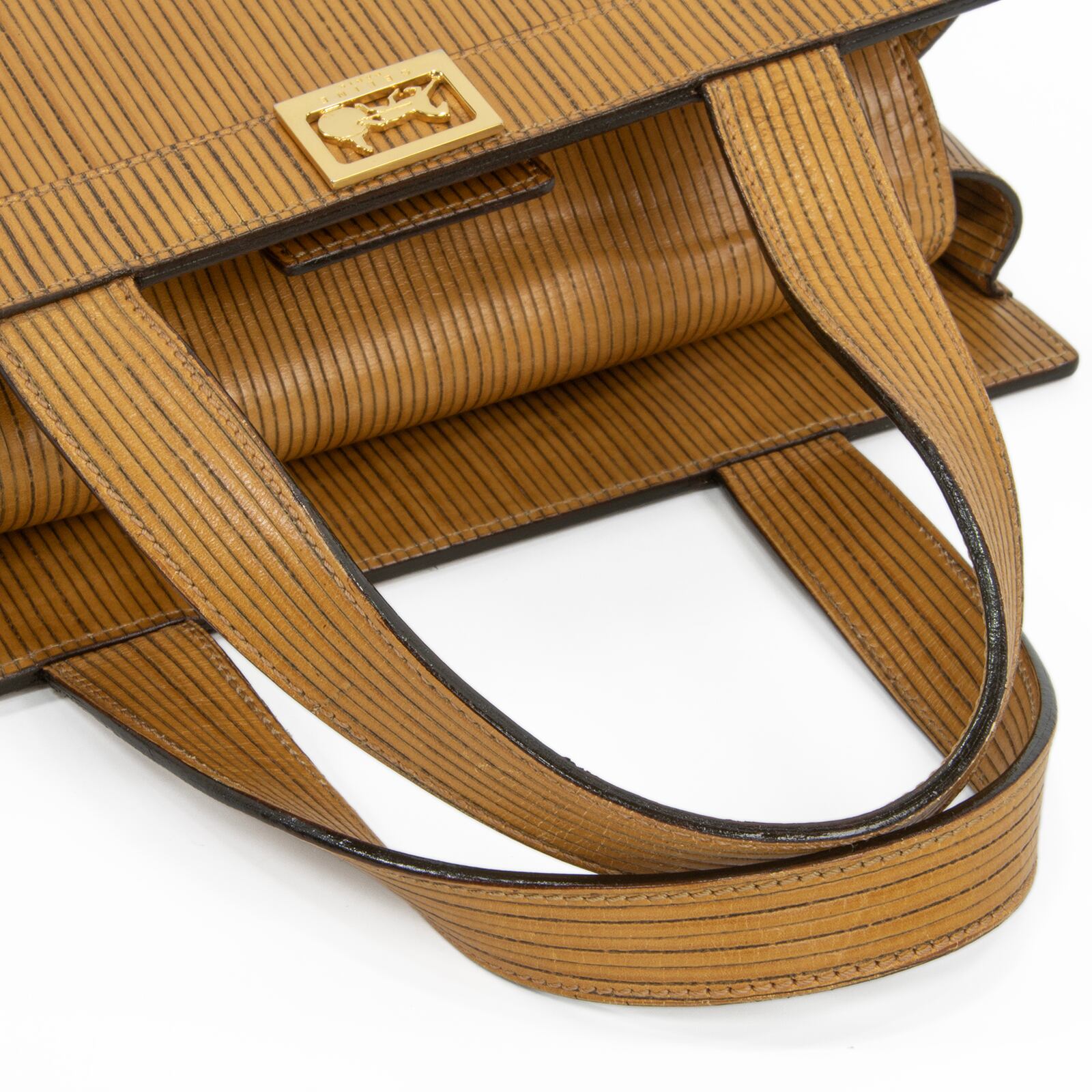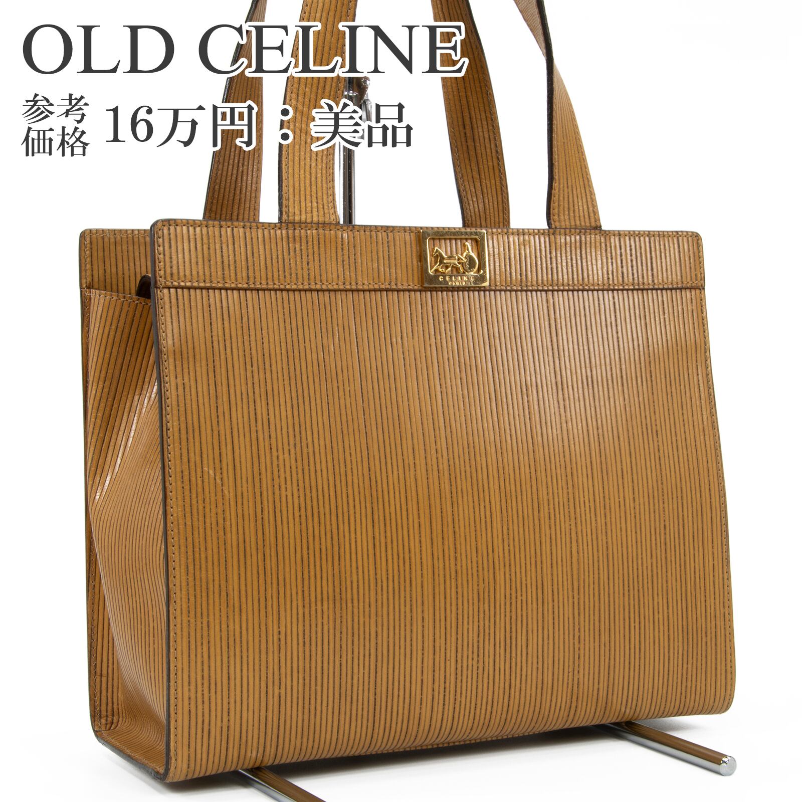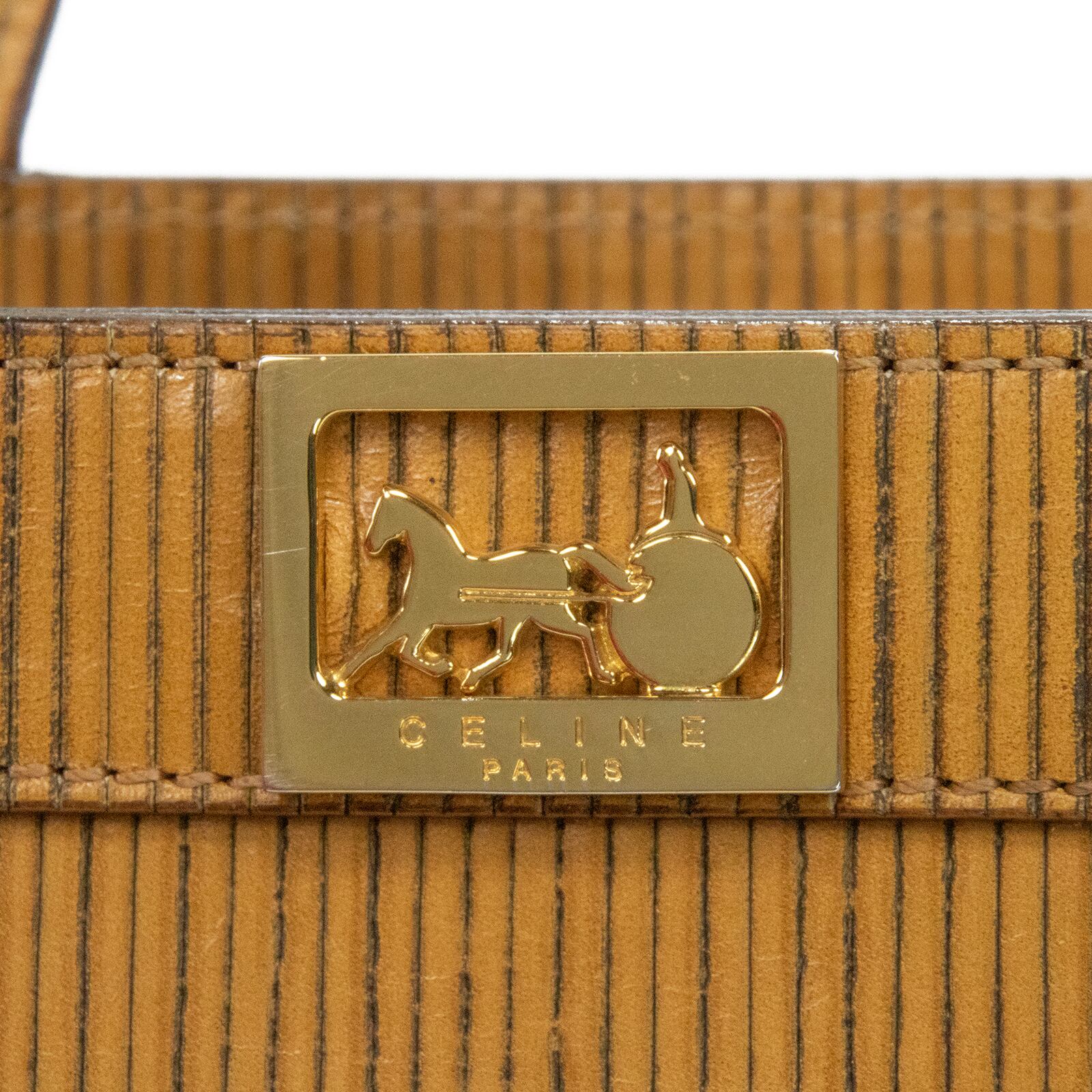 こちらは、繊細なストライプの型押しに黄金の馬車モチーフが輝く、オールドセリーヌのホースキャリッジ・ハンドバッグでございます。