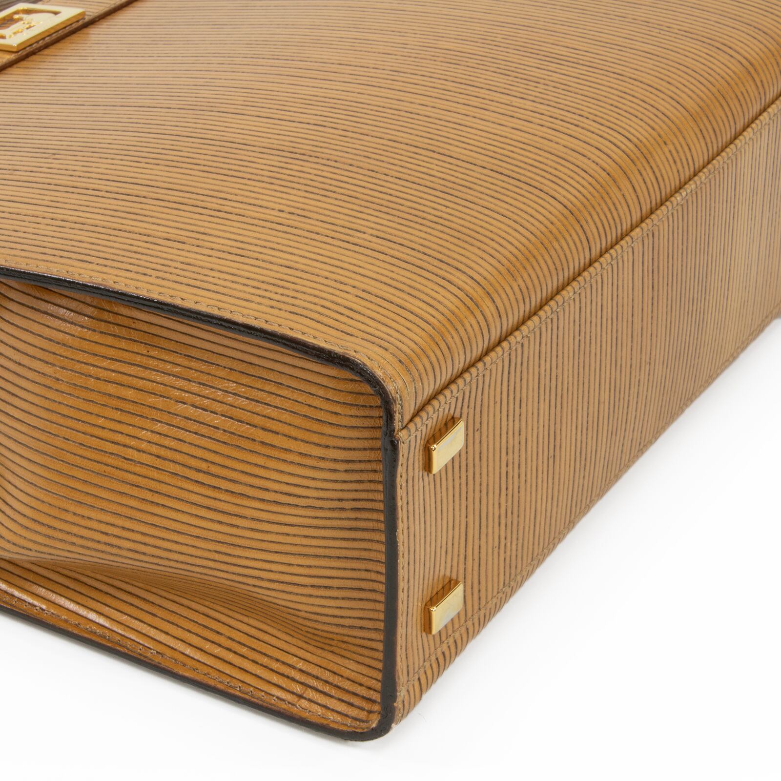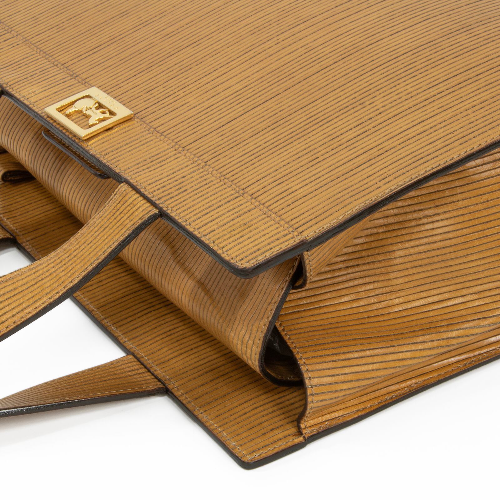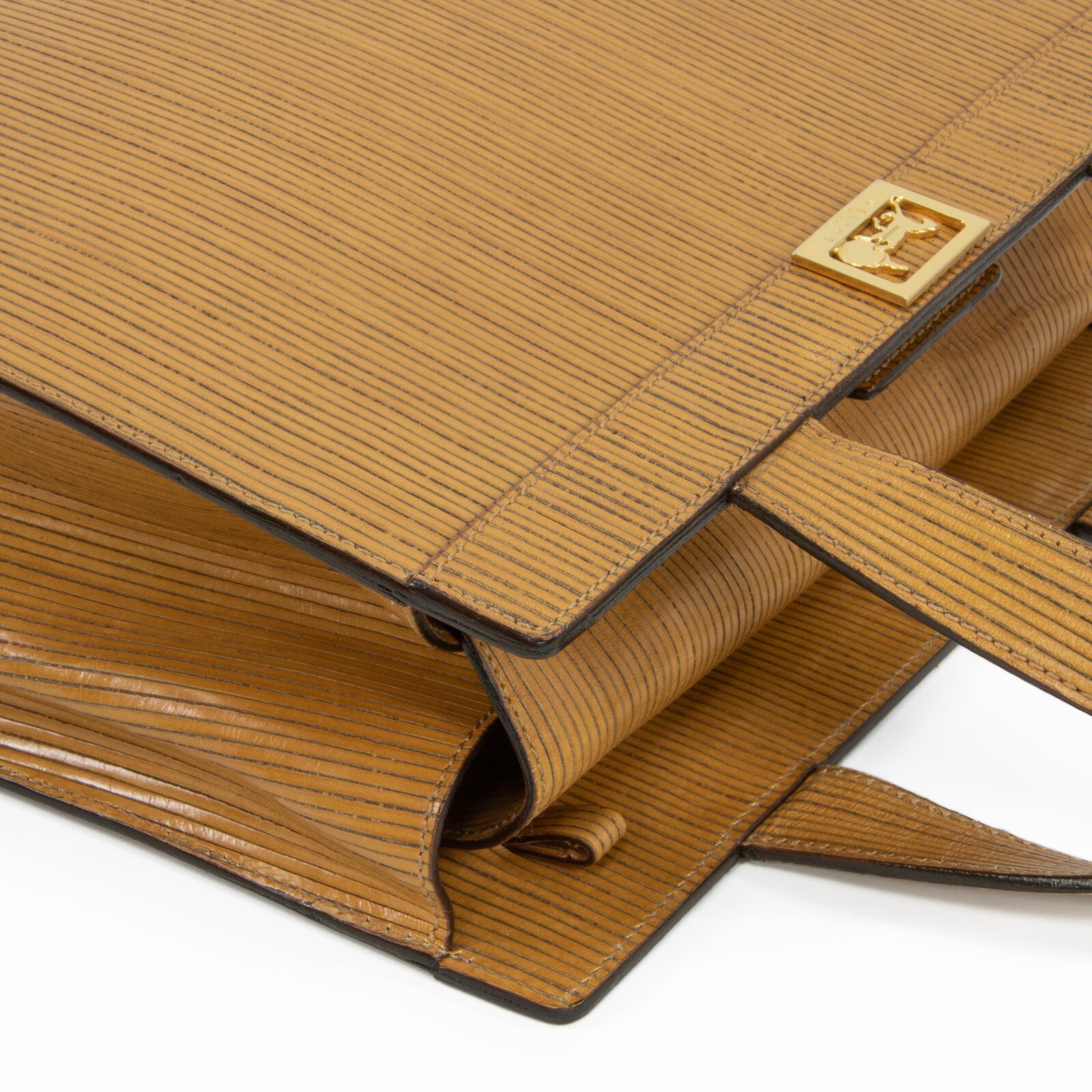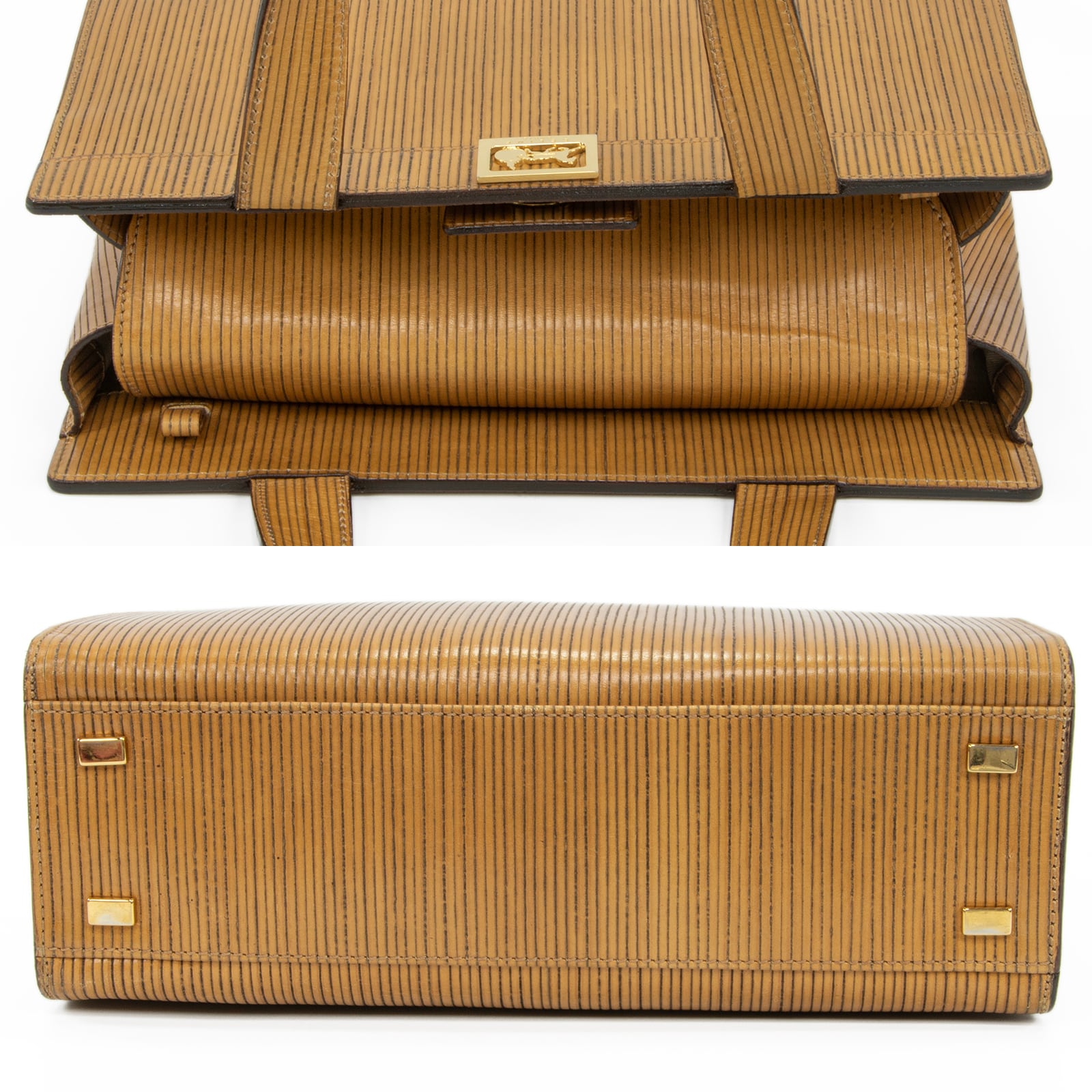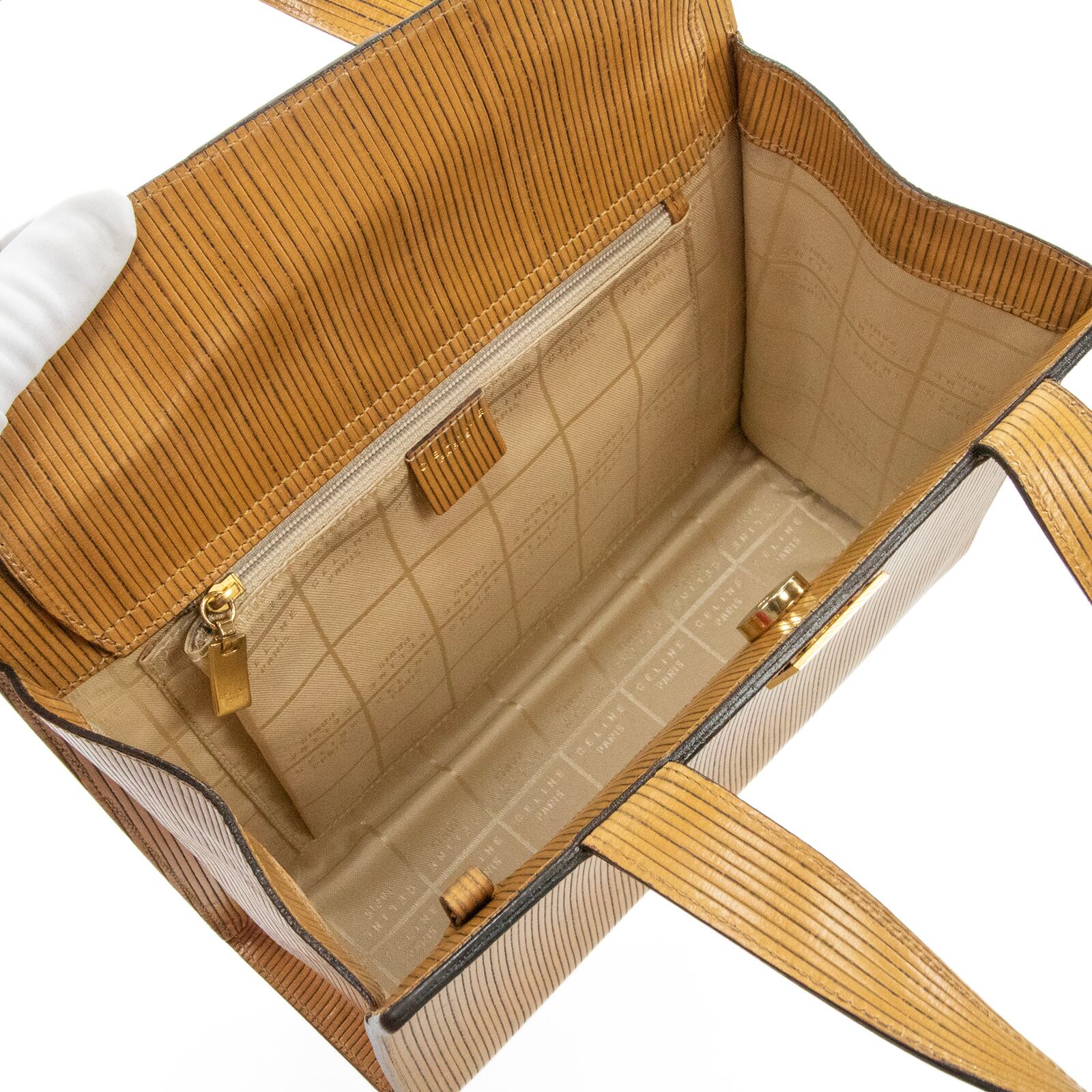 こちらは、繊細なストライプの型押しに黄金の馬車モチーフが輝く、オールドセリーヌのホースキャリッジ・ハンドバッグでございます。