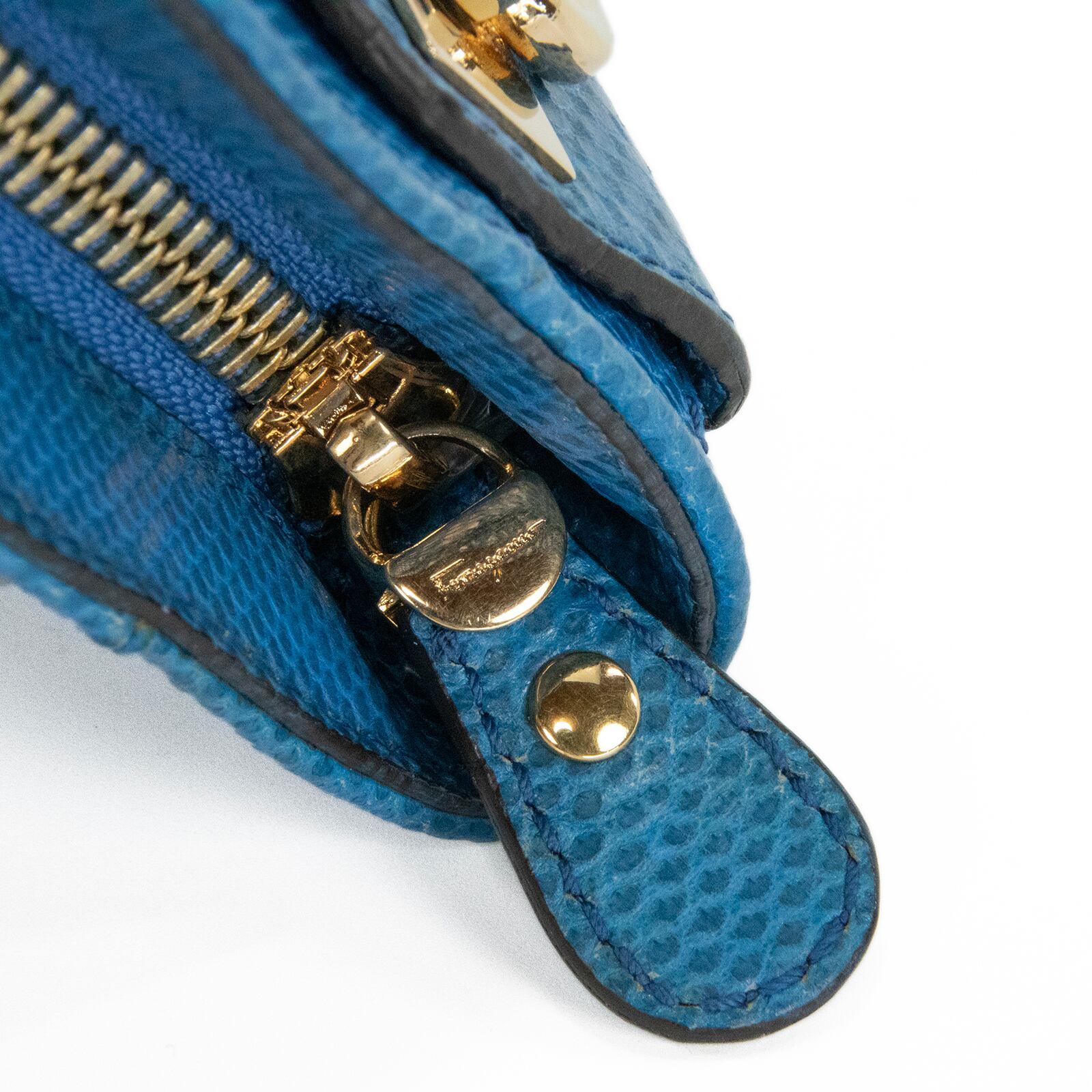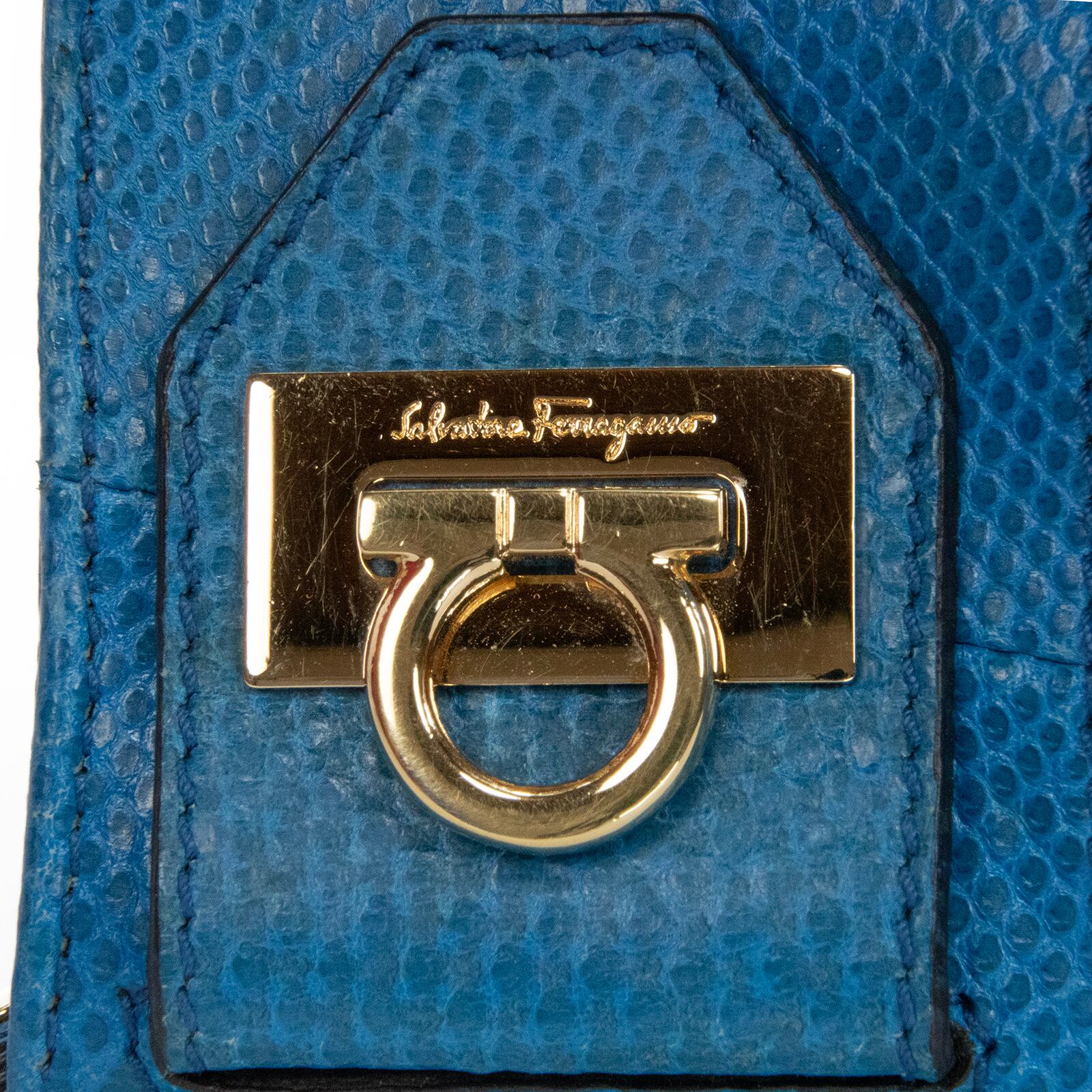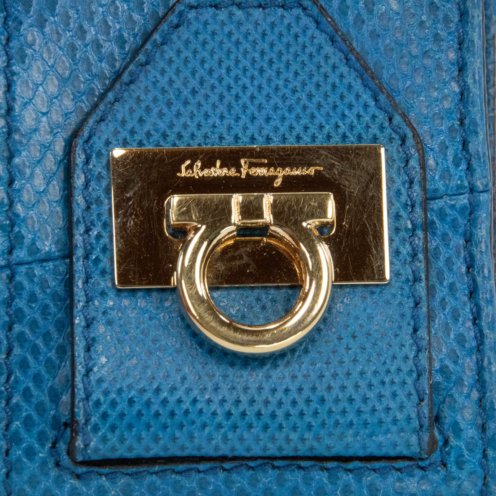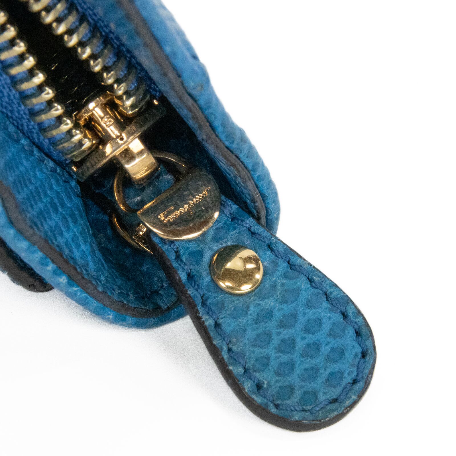 こちらは、爽やかで洗練されたブルーと繊細なリザード柄のレザーが絶妙に調和した、フェラガモのガンチーニ・ショルダーバッグでございます。