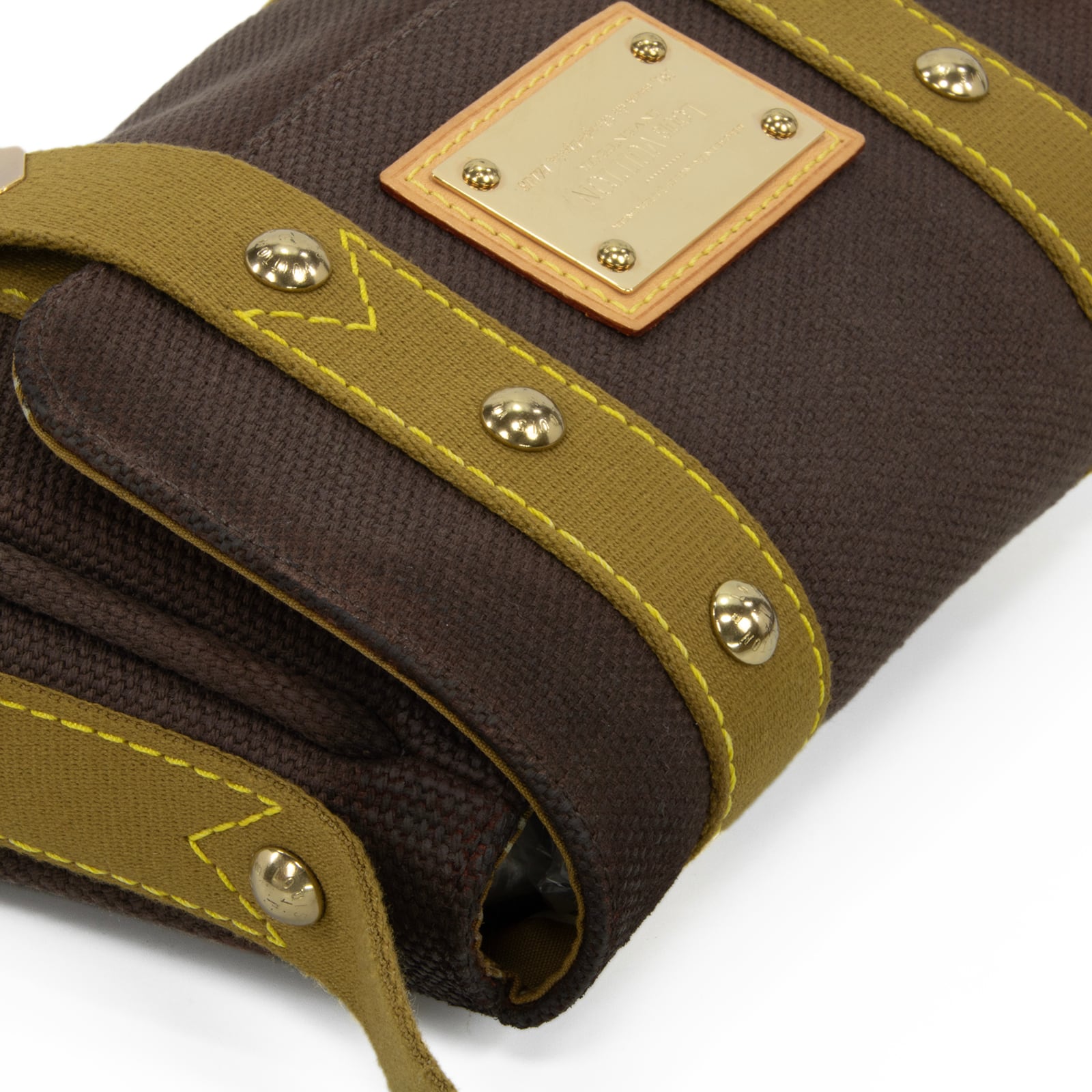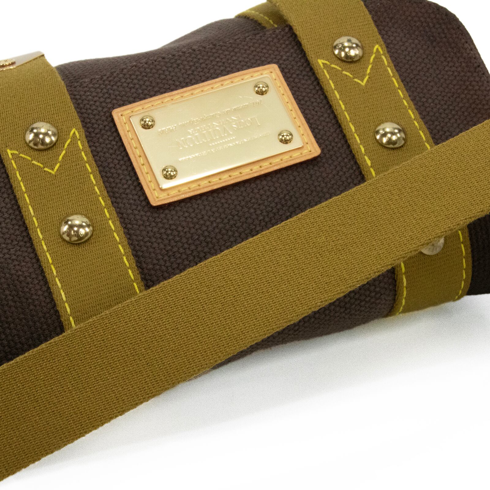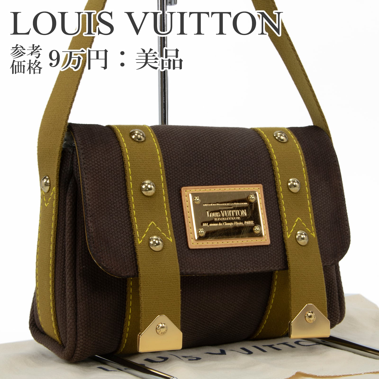 こちらは、キャンバス素材にゴールドのスタッズが都会的な輝きを放っている、ルイヴィトンのサックラバ・アンティグア・ショルダーバッグでございます。