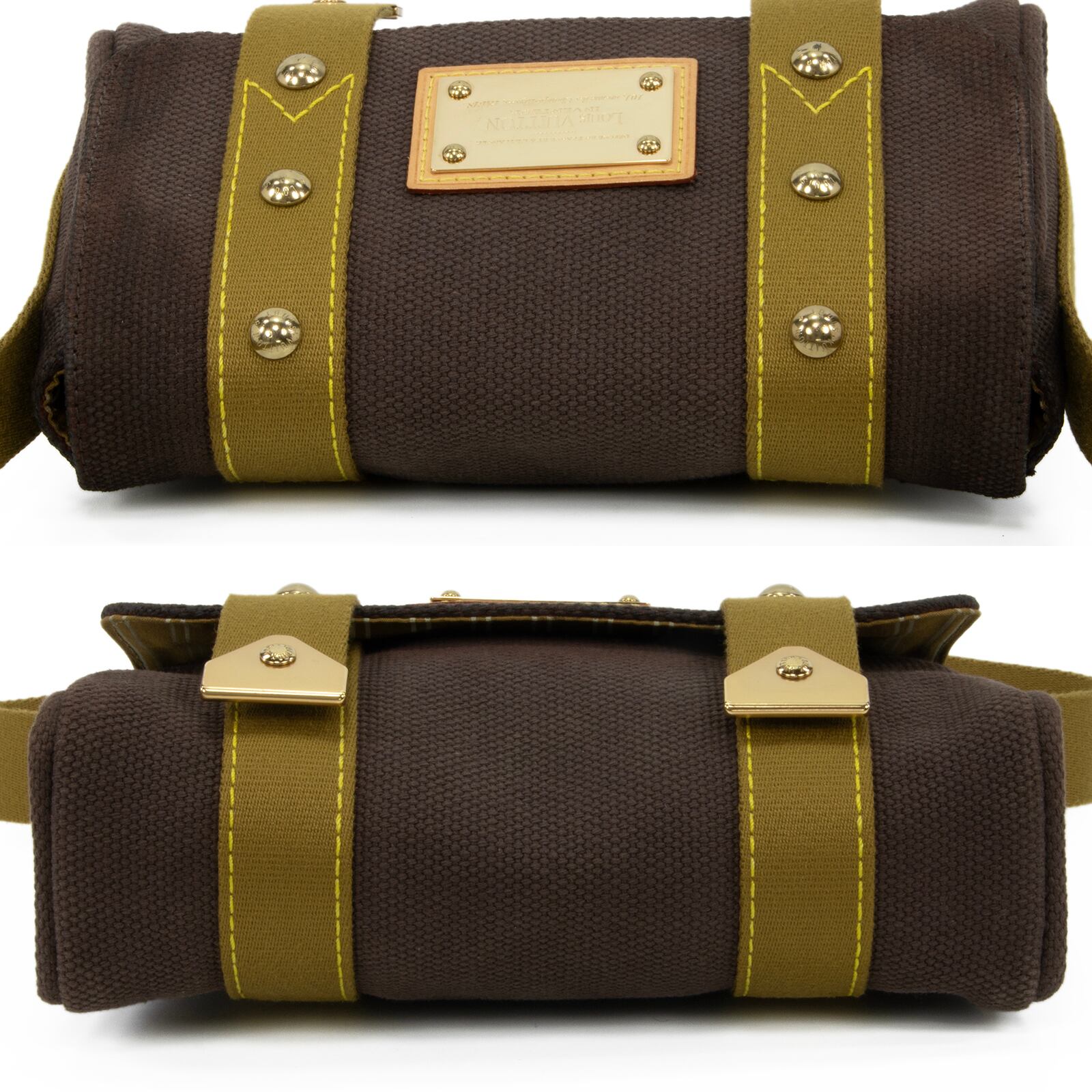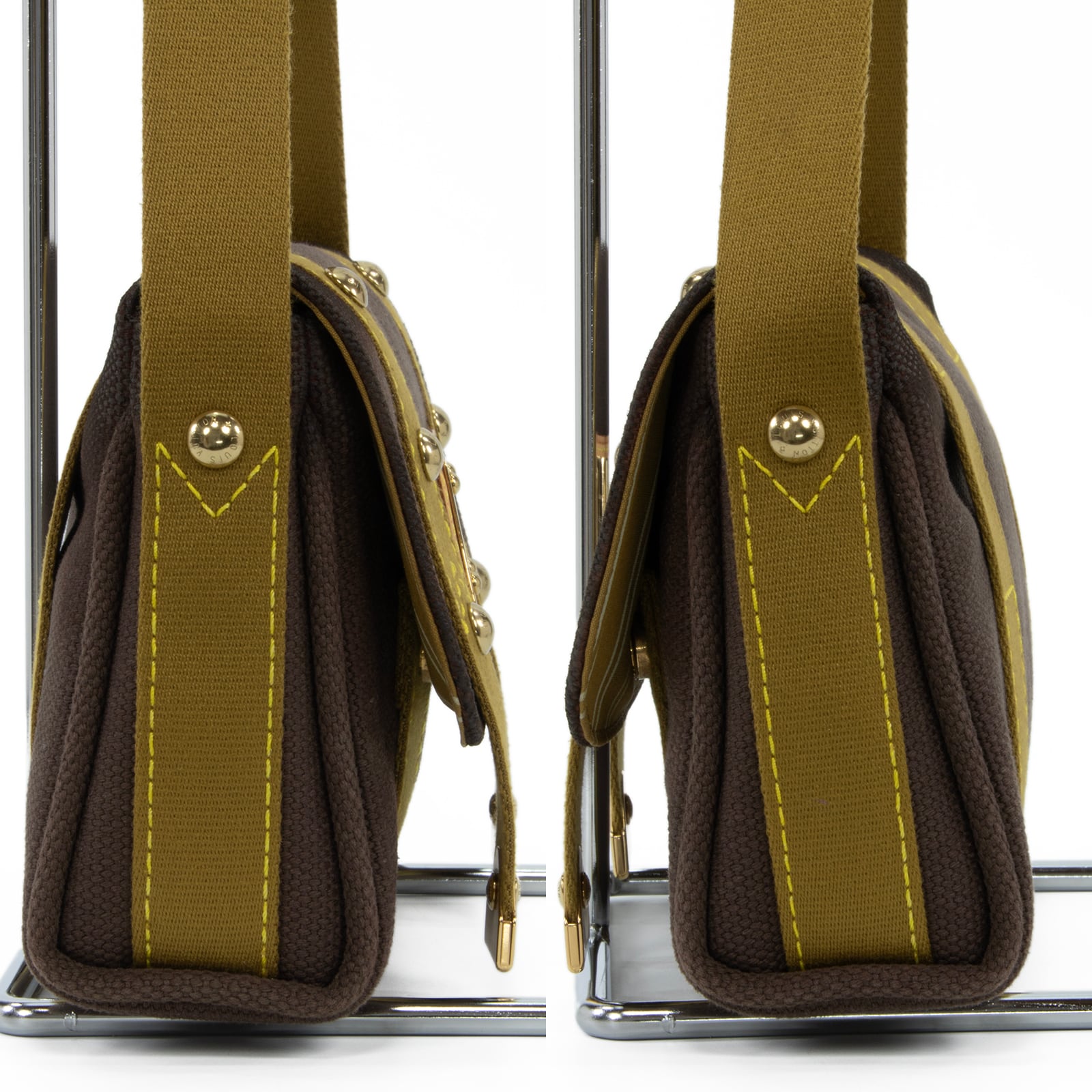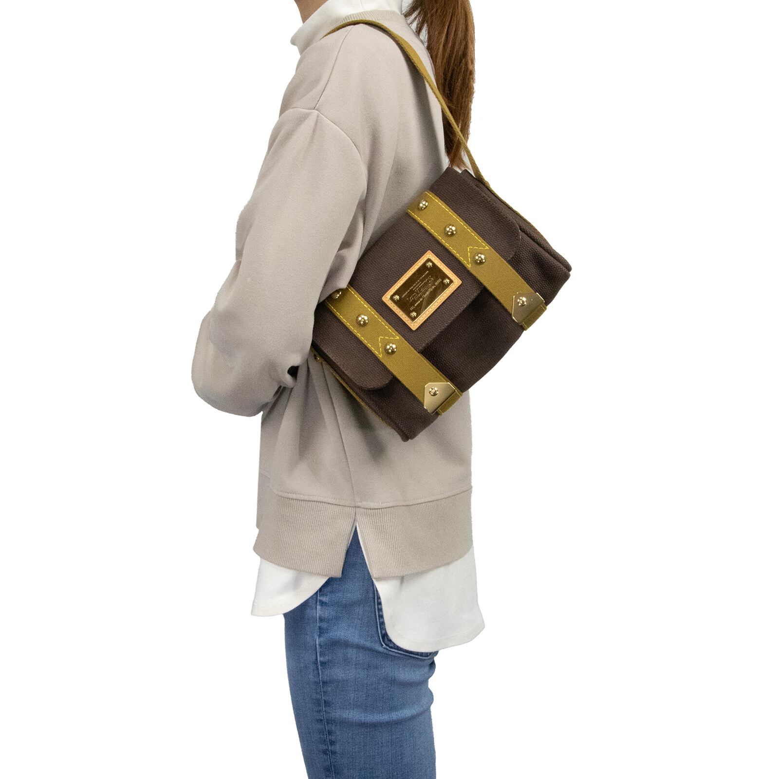 落ち着いたブラウン系の配色と、一目でヴィトンとわかる中央のゴールドロゴプレートが相まって、お客様の装いに洗練された美しさを添えます。