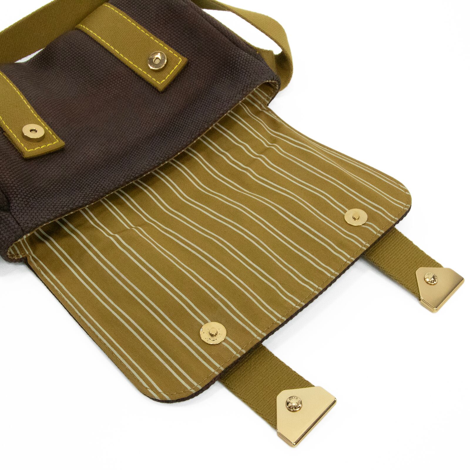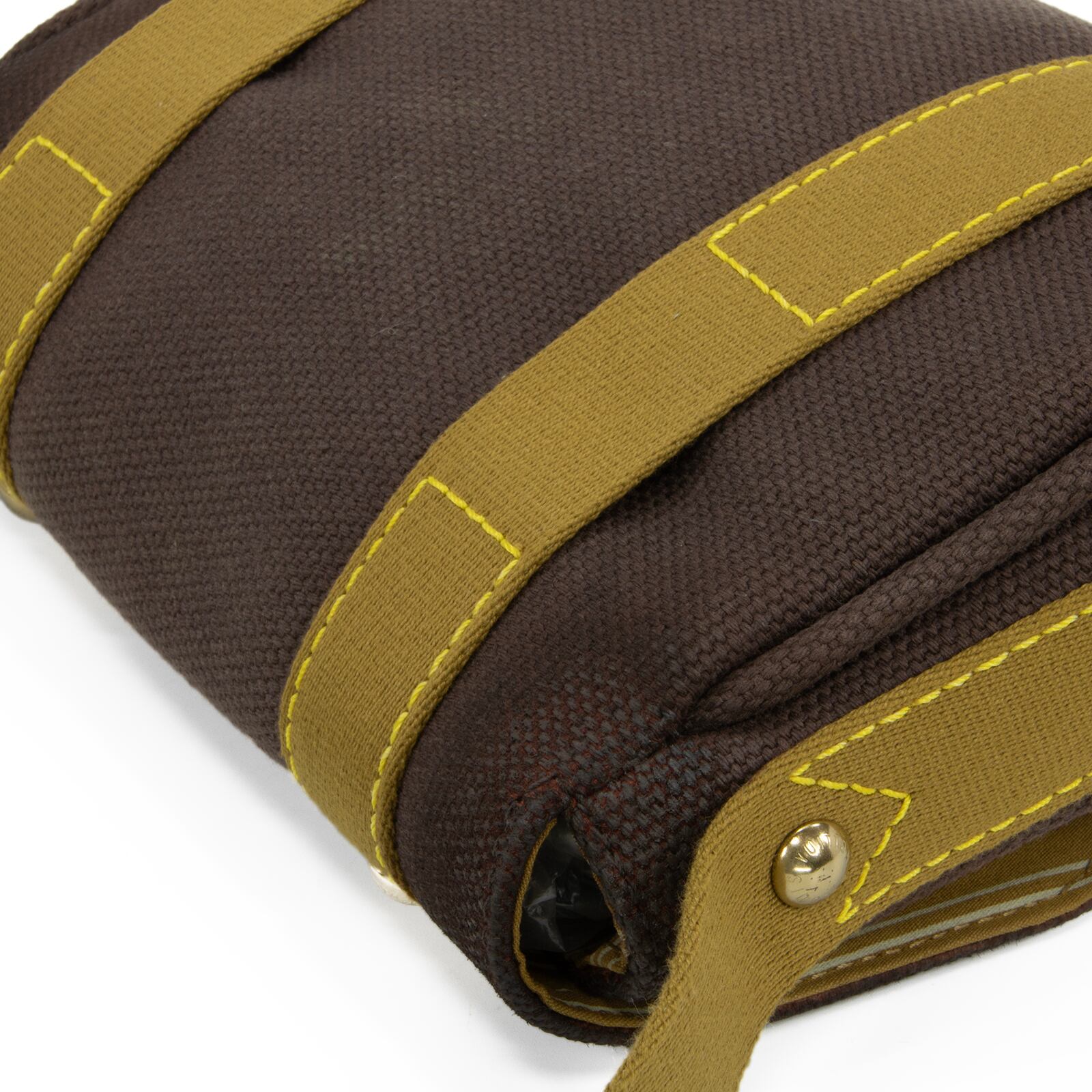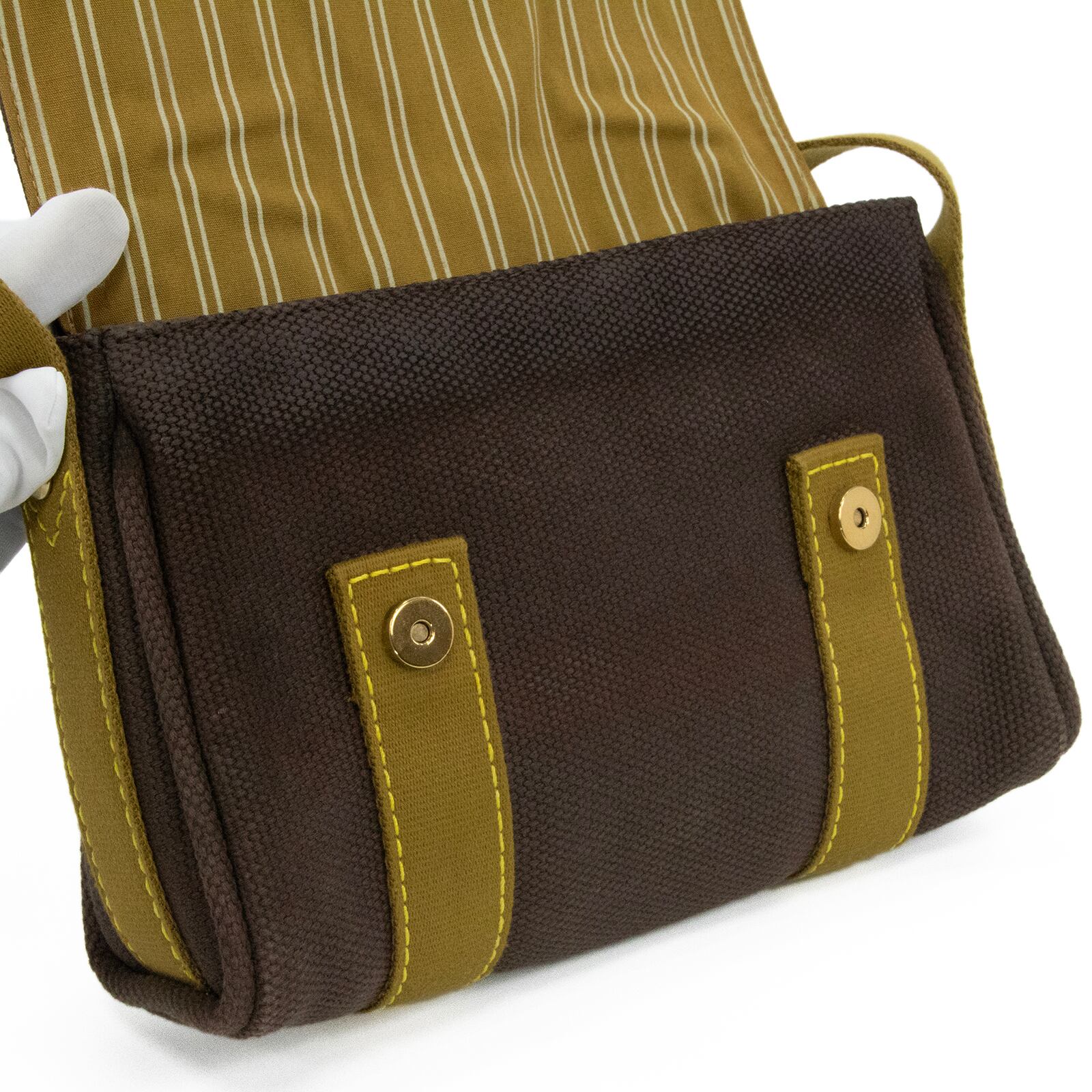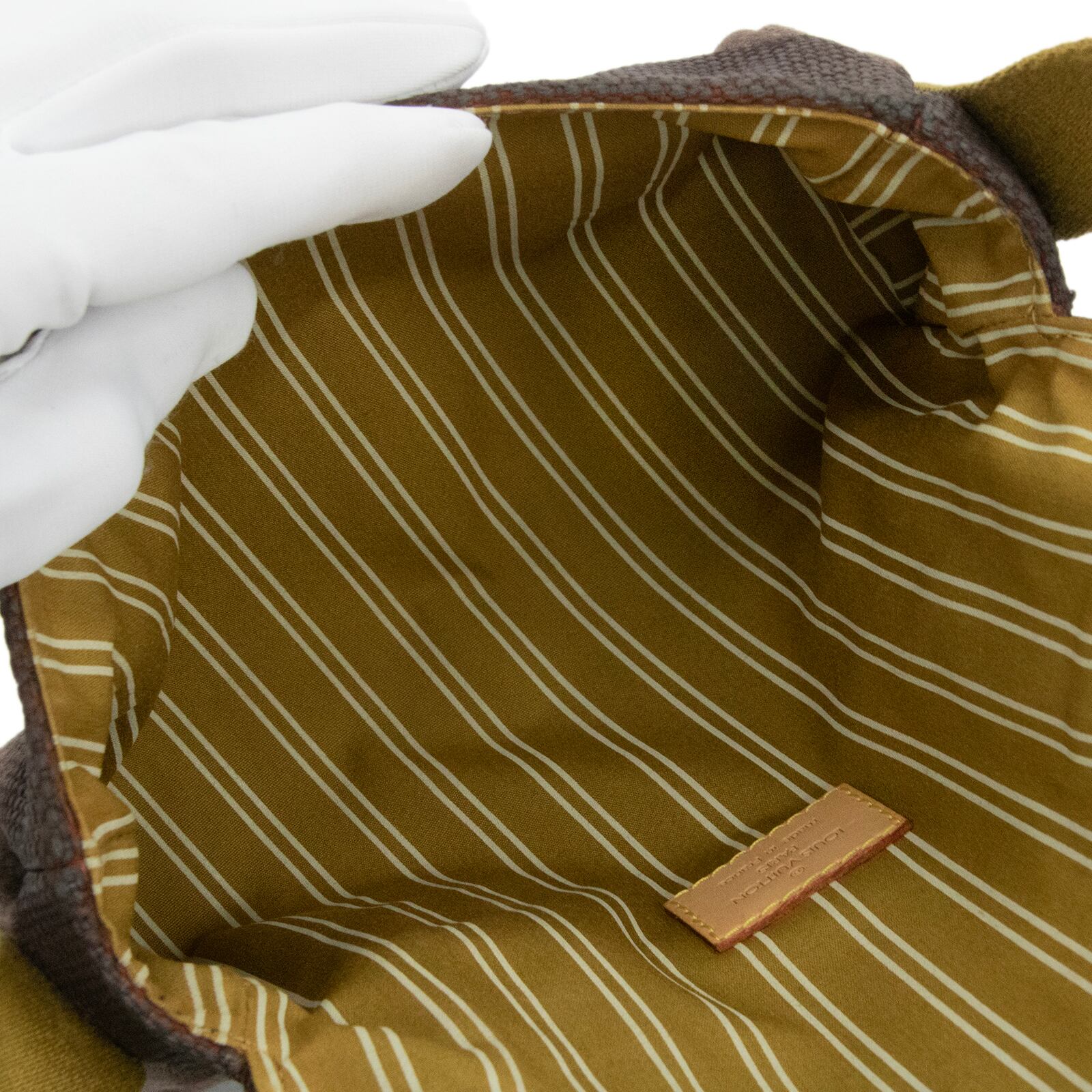 落ち着いたブラウン系の配色と、一目でヴィトンとわかる中央のゴールドロゴプレートが相まって、お客様の装いに洗練された美しさを添えます。