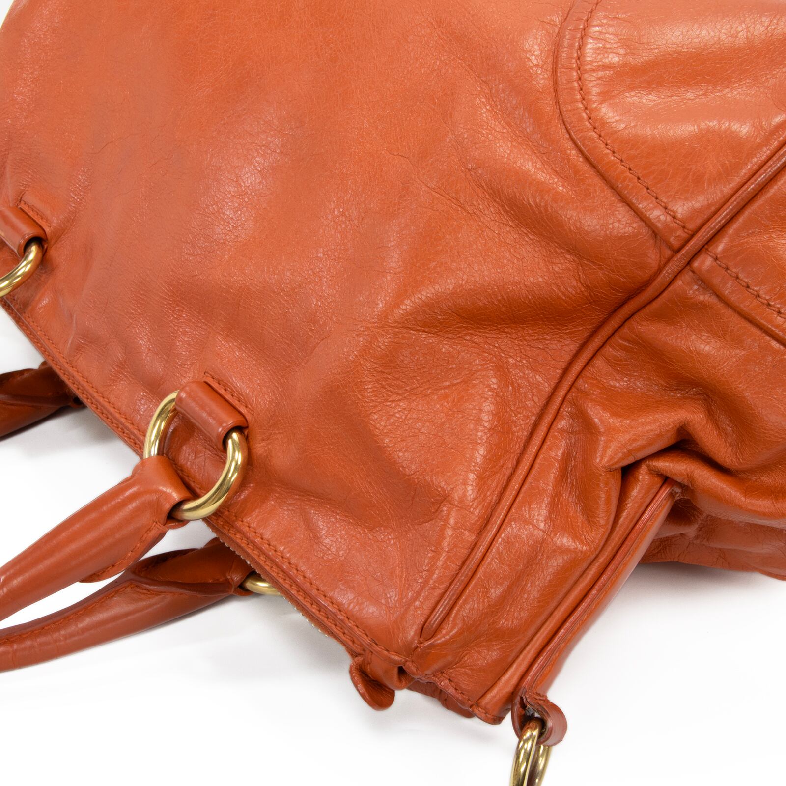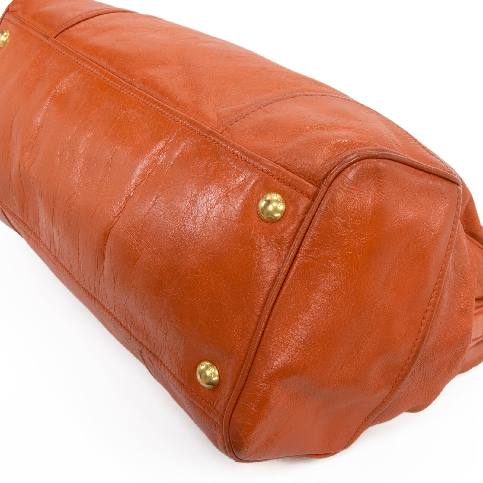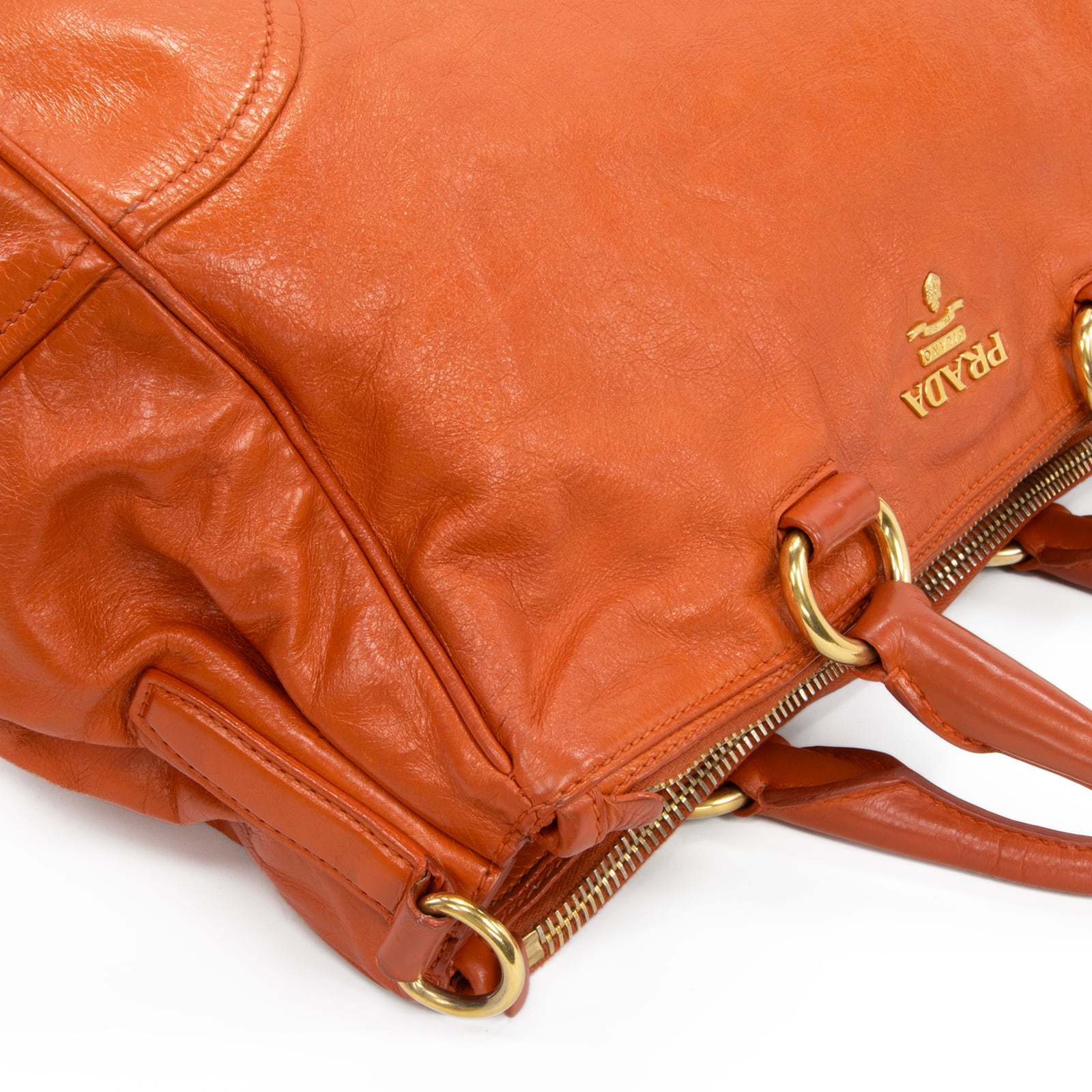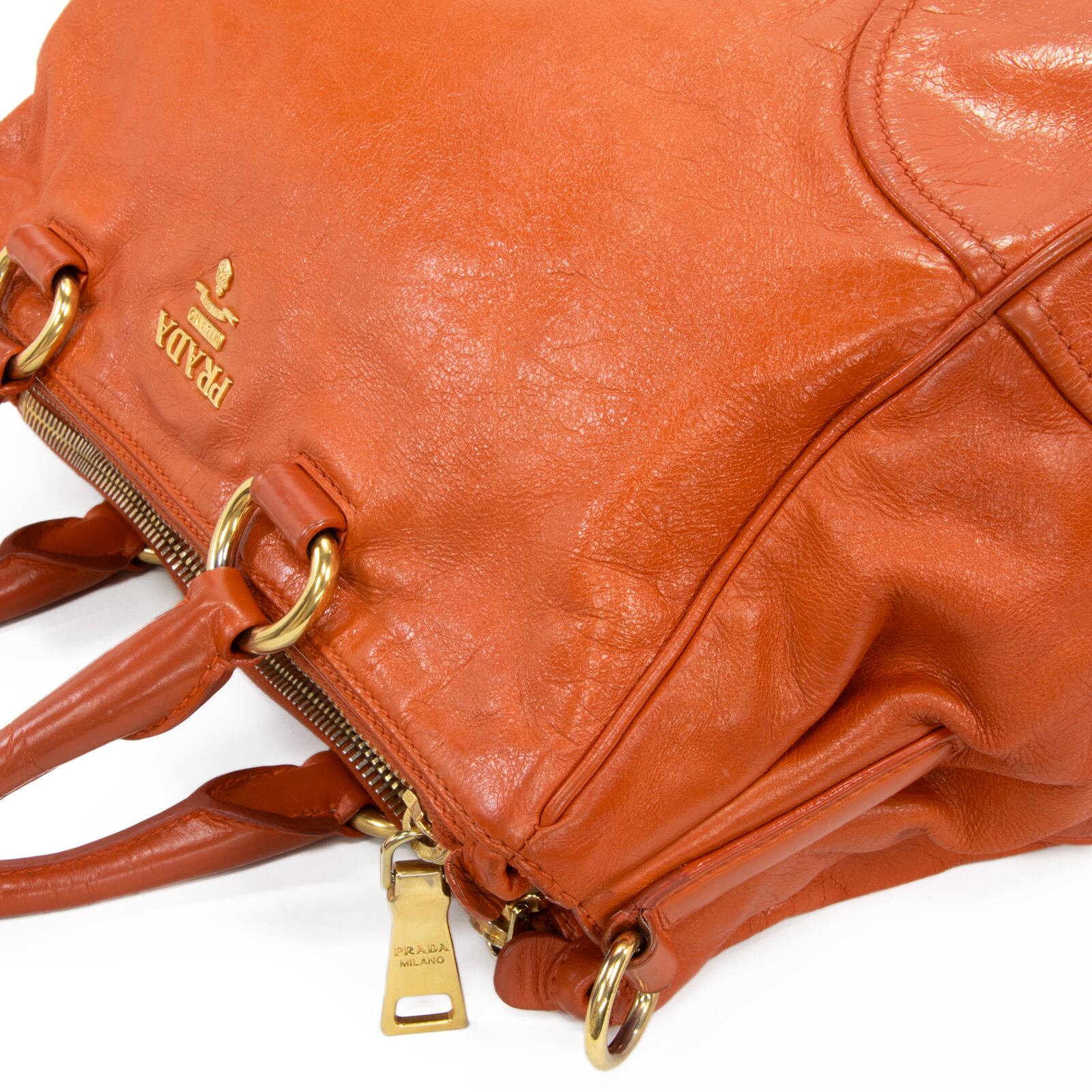 艶やかなレザーの質感とプラダのゴールドロゴが相まって、一目でプラダとわかる格別な存在感を放っております。