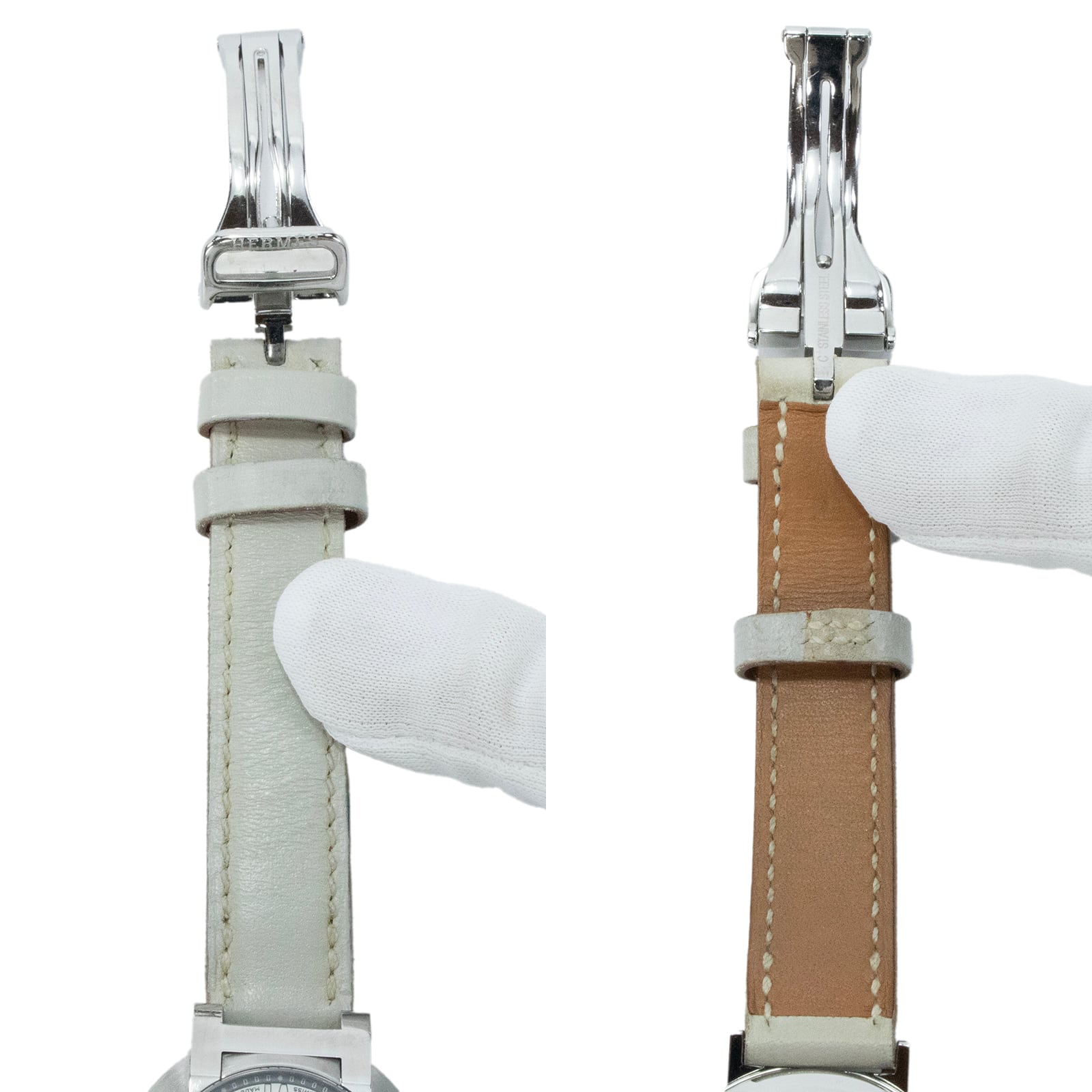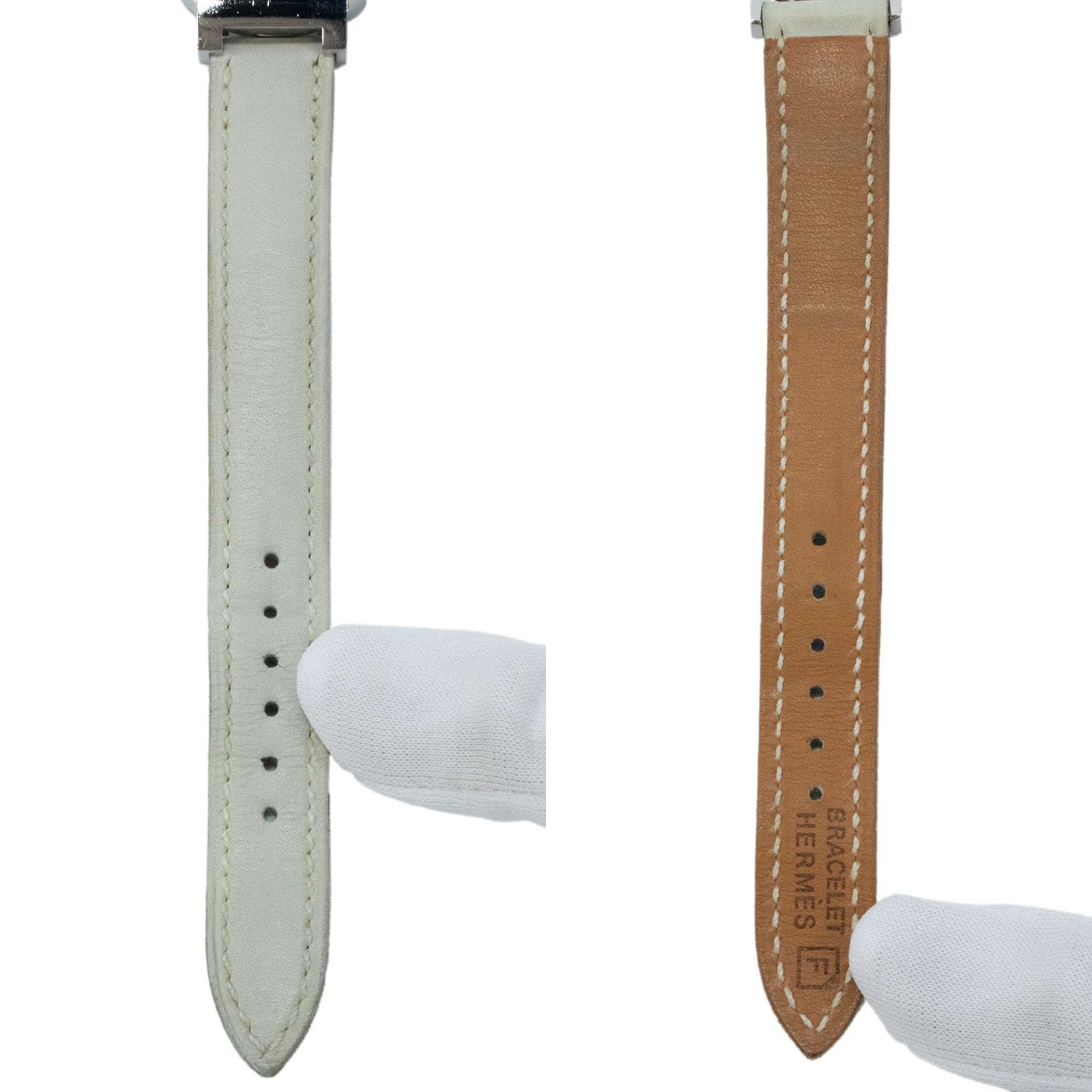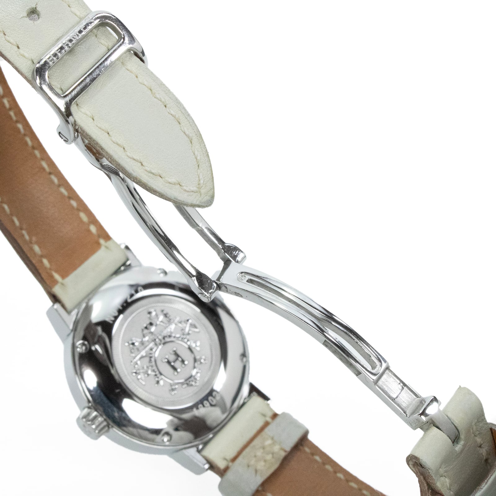 ホワイトの文字盤とエクリュ系のレザーベルトが、女性らしい柔らかな印象を演出いたします。