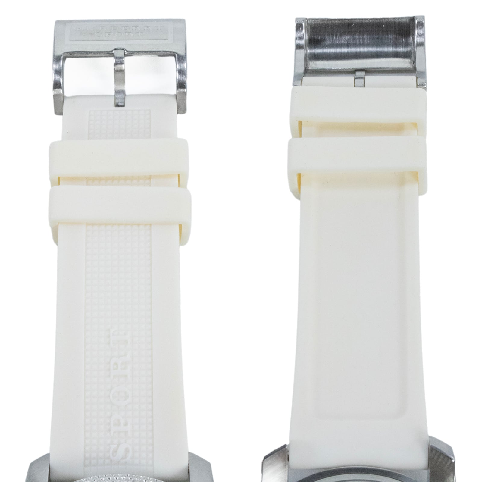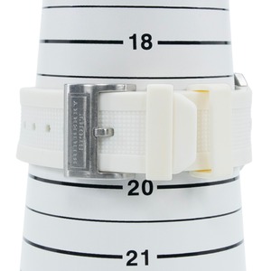腕に優しくフィットするホワイトの樹脂ベルトが、心地よい着用感と軽快な印象を同時にもたらしております。