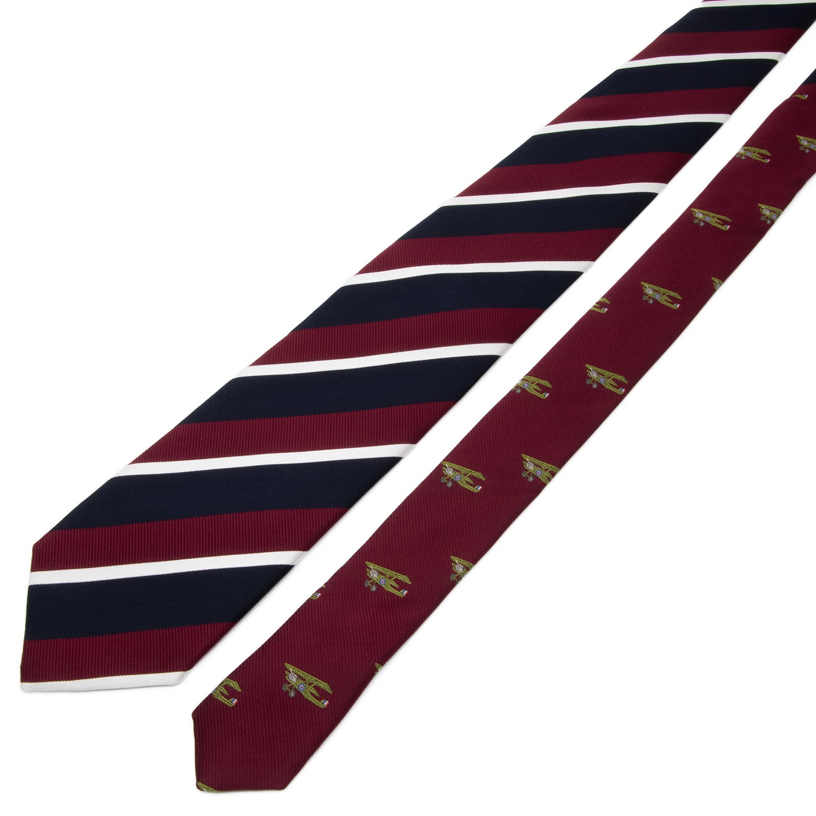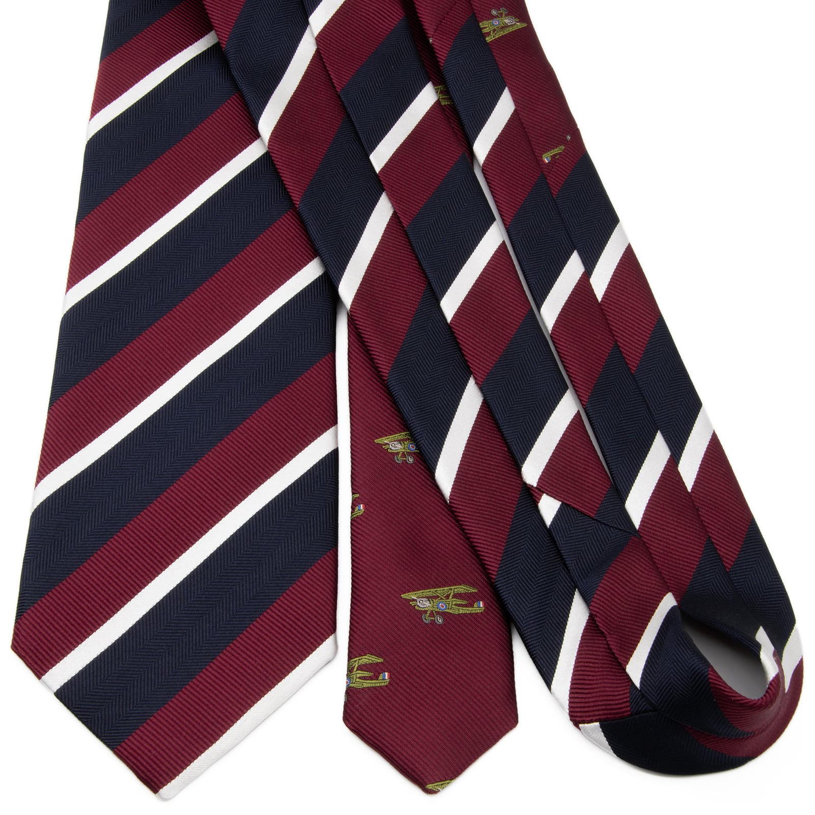 ボルドーやネイビーを基調としたストライプ柄に、小剣にあしらわれた飛行機のモチーフがさりげない遊び心を演出しております。