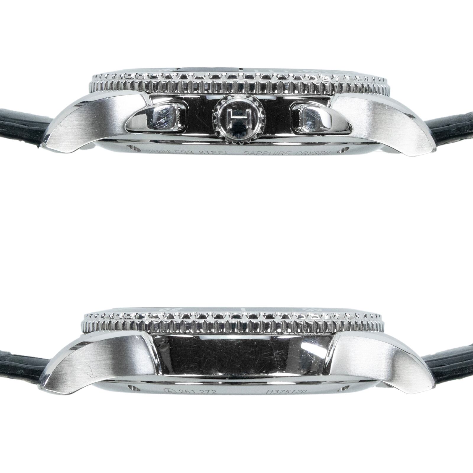 精悍なブラックの文字盤に配置されたクロノグラフと逆回転ベゼルが、ジャズマスターらしいエレガンスの中にもアクティブな印象を醸し出しております。