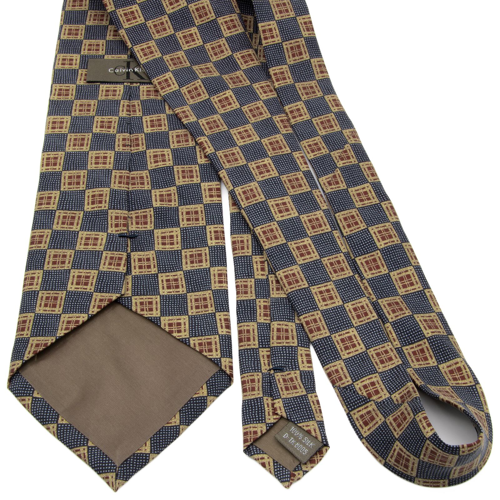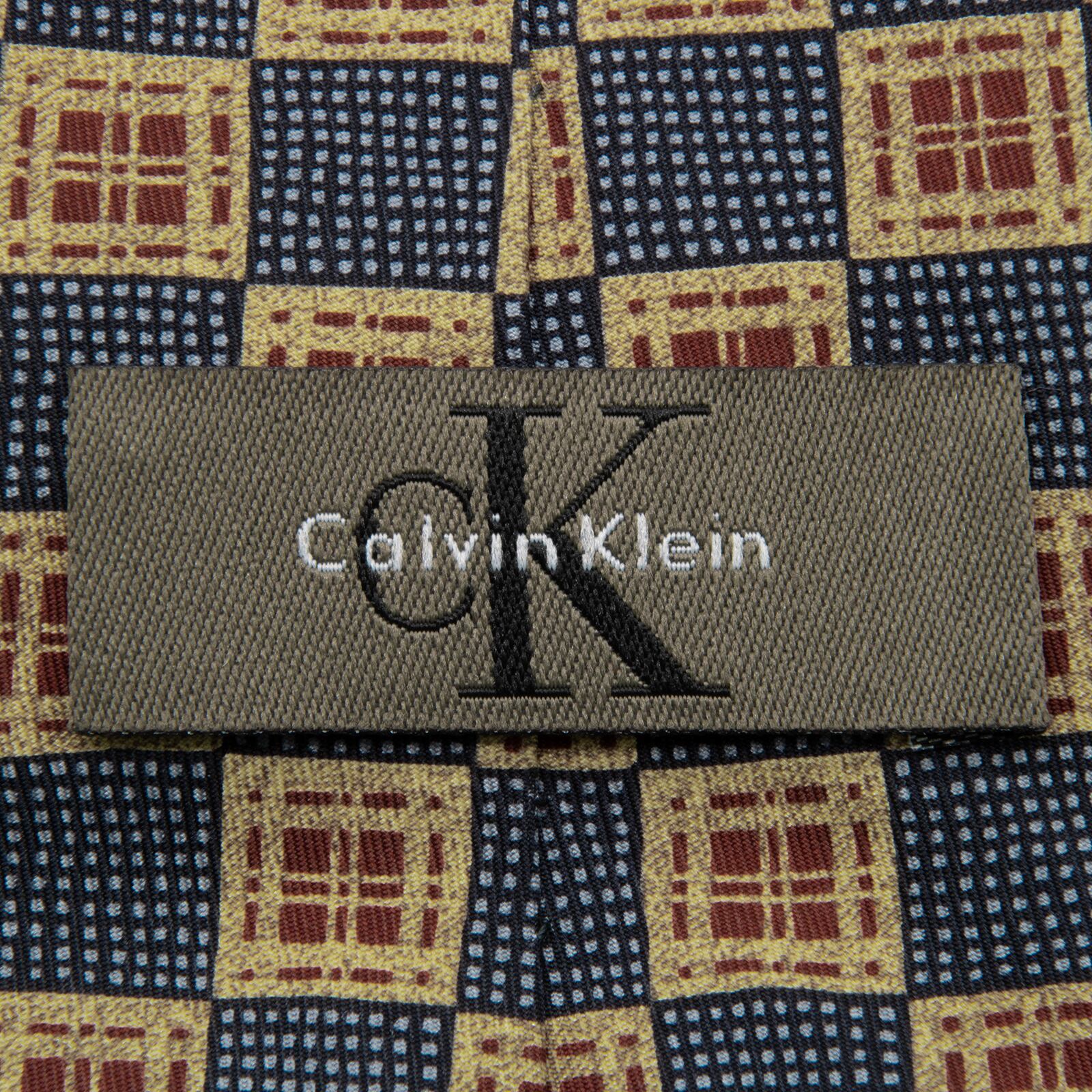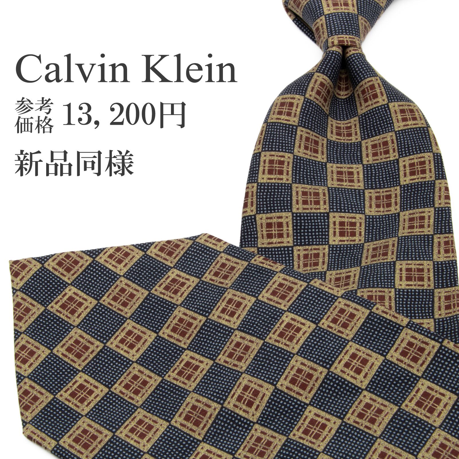 新品同様 送料無料 カルバンクライン ネクタイ シルク 青 ブルー 茶色 ブラウン ベージュ ビジネス 総柄 四角 スクエア ハイブランド P552
