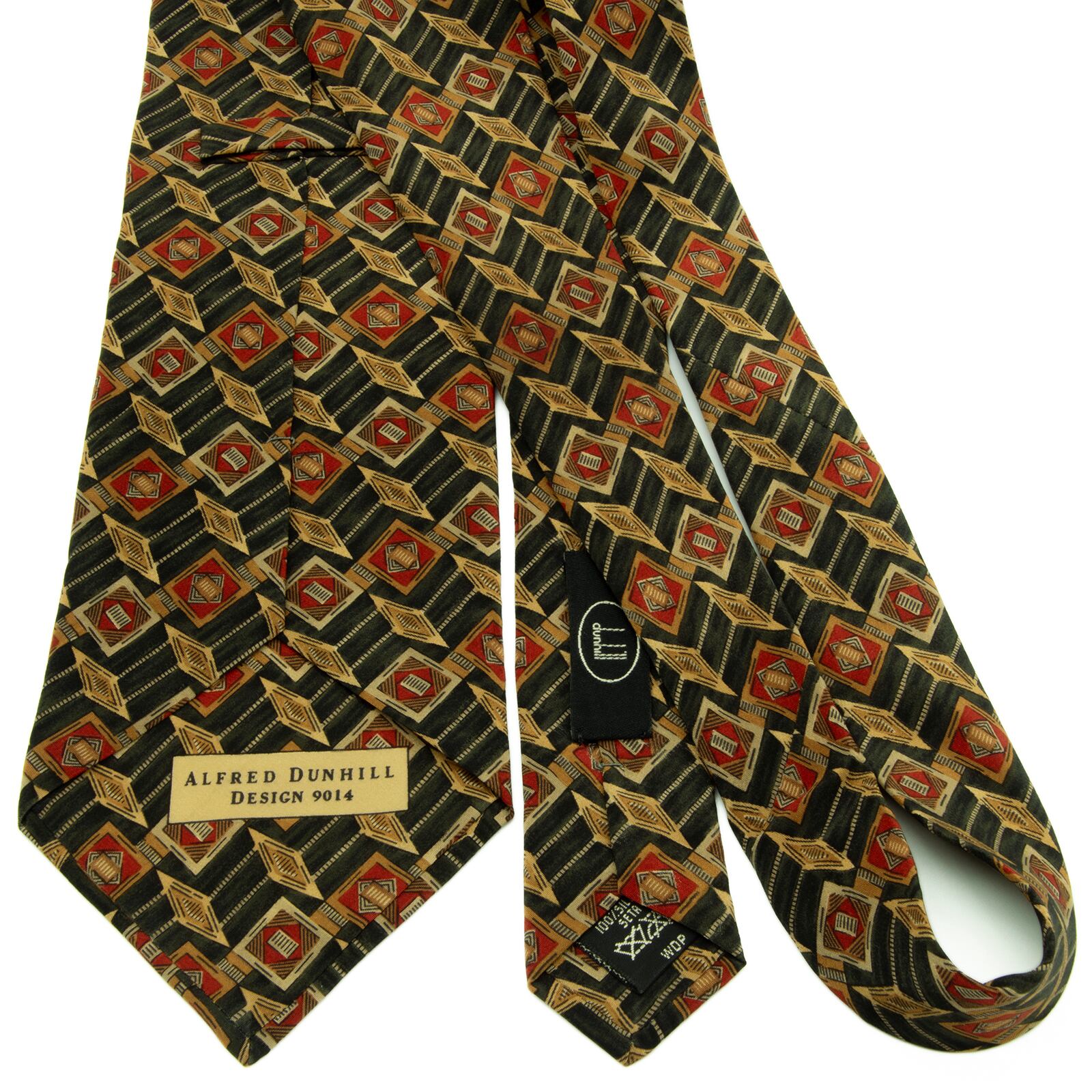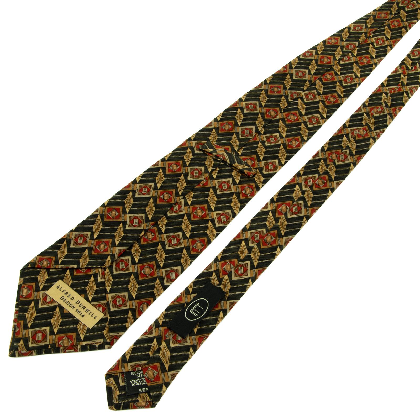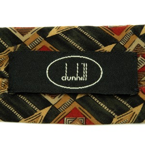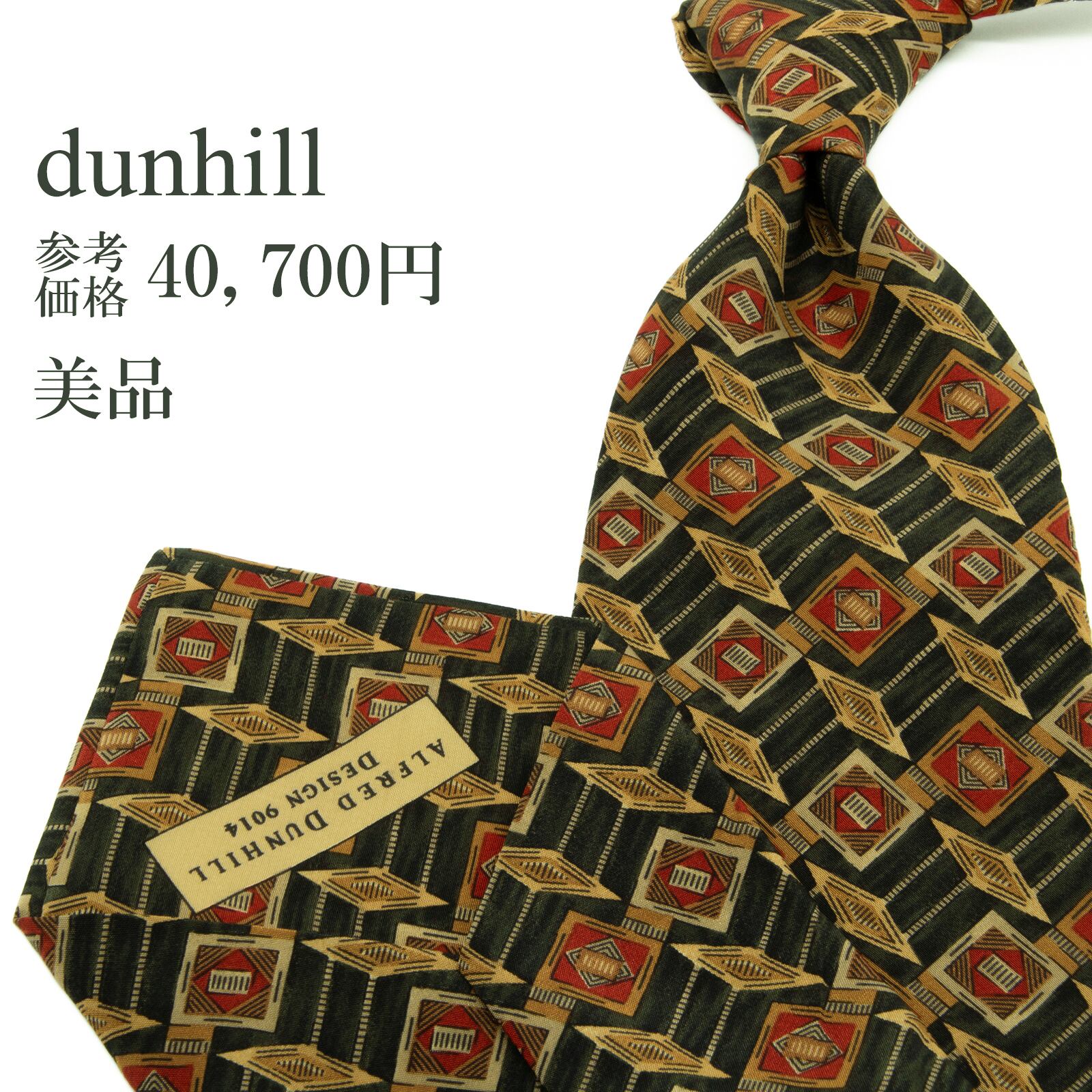 送料無料 ダンヒル ネクタイ シルク 深緑色 赤 レッド 茶色 ブラウン 総柄 Y2K ひし形 四角 幾何学模様 ハイブランド イタリア製 綺麗 P636