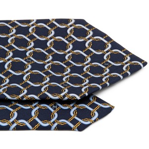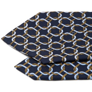 約9.5センチの重厚感ある大剣幅と、ネイビーに浮かび上がるチェーンやココマークの総柄デザインが、知的でエレガントな大人の余裕をより一層引き立てております。