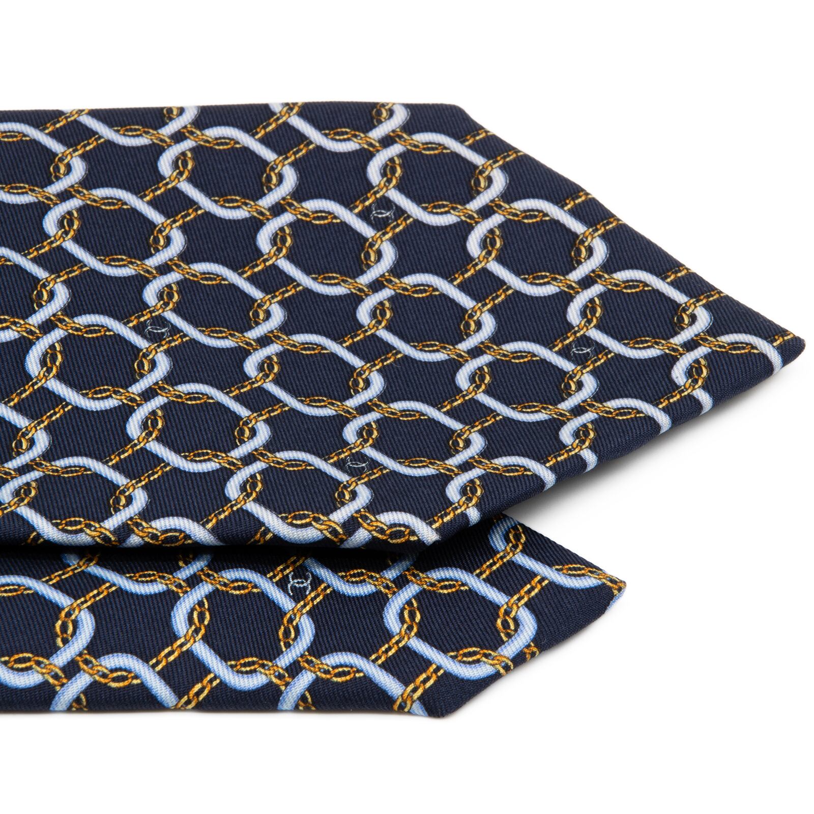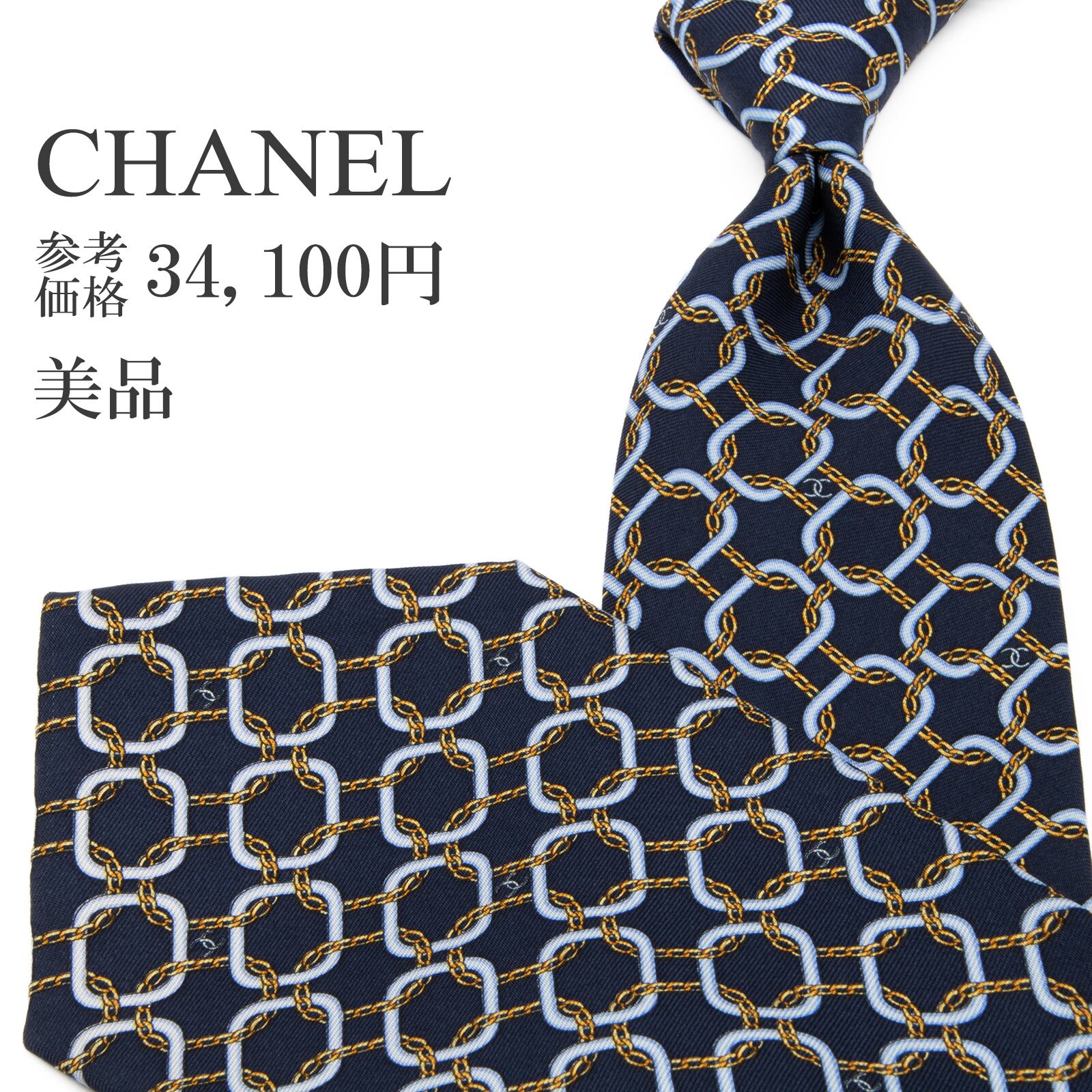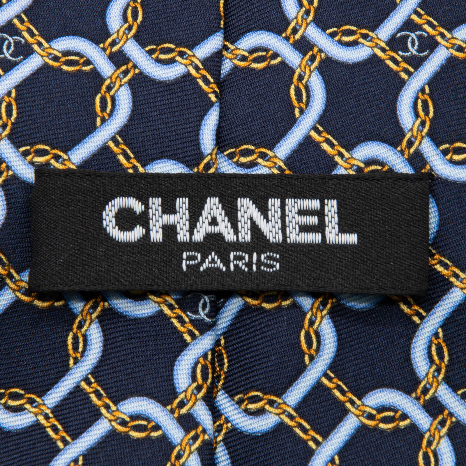 送料無料 シャネル ネクタイ シルク ネイビーブルー 水色 黄色 総柄 マイクロココマーク 鎖 チェーン ハイブランド イタリア製 綺麗 P821
