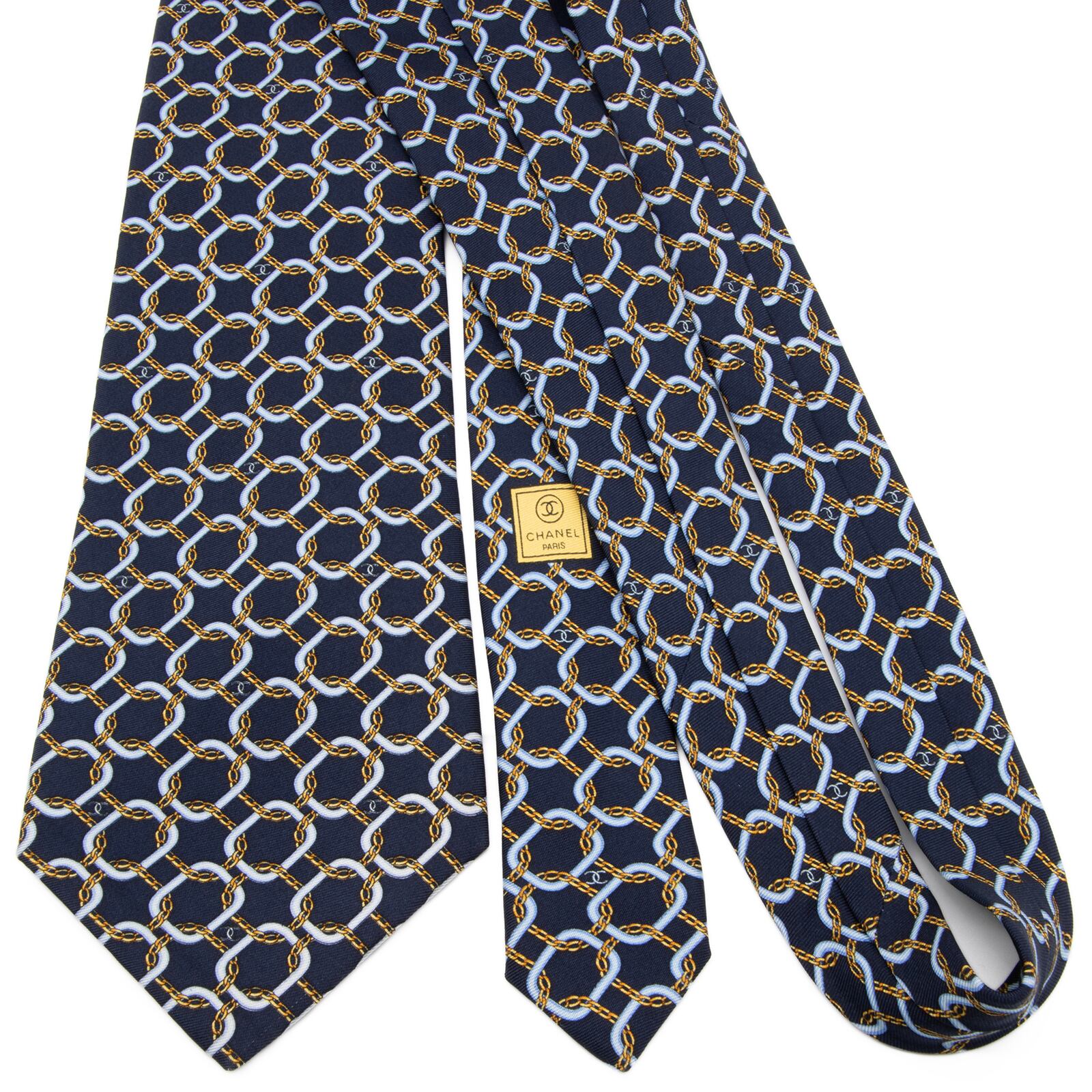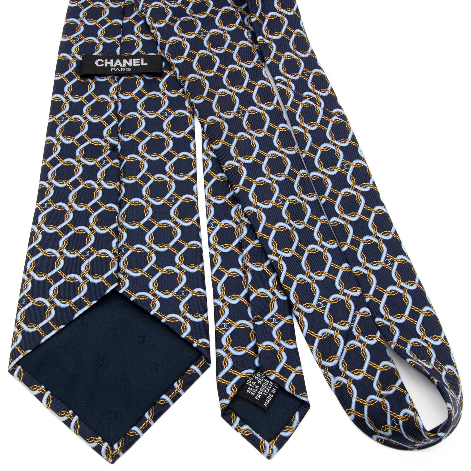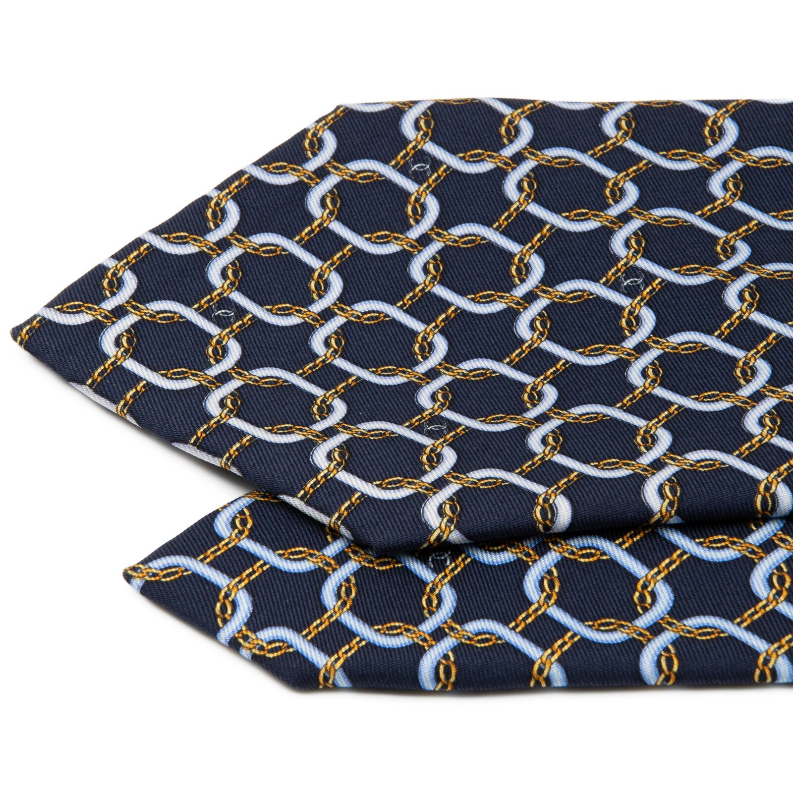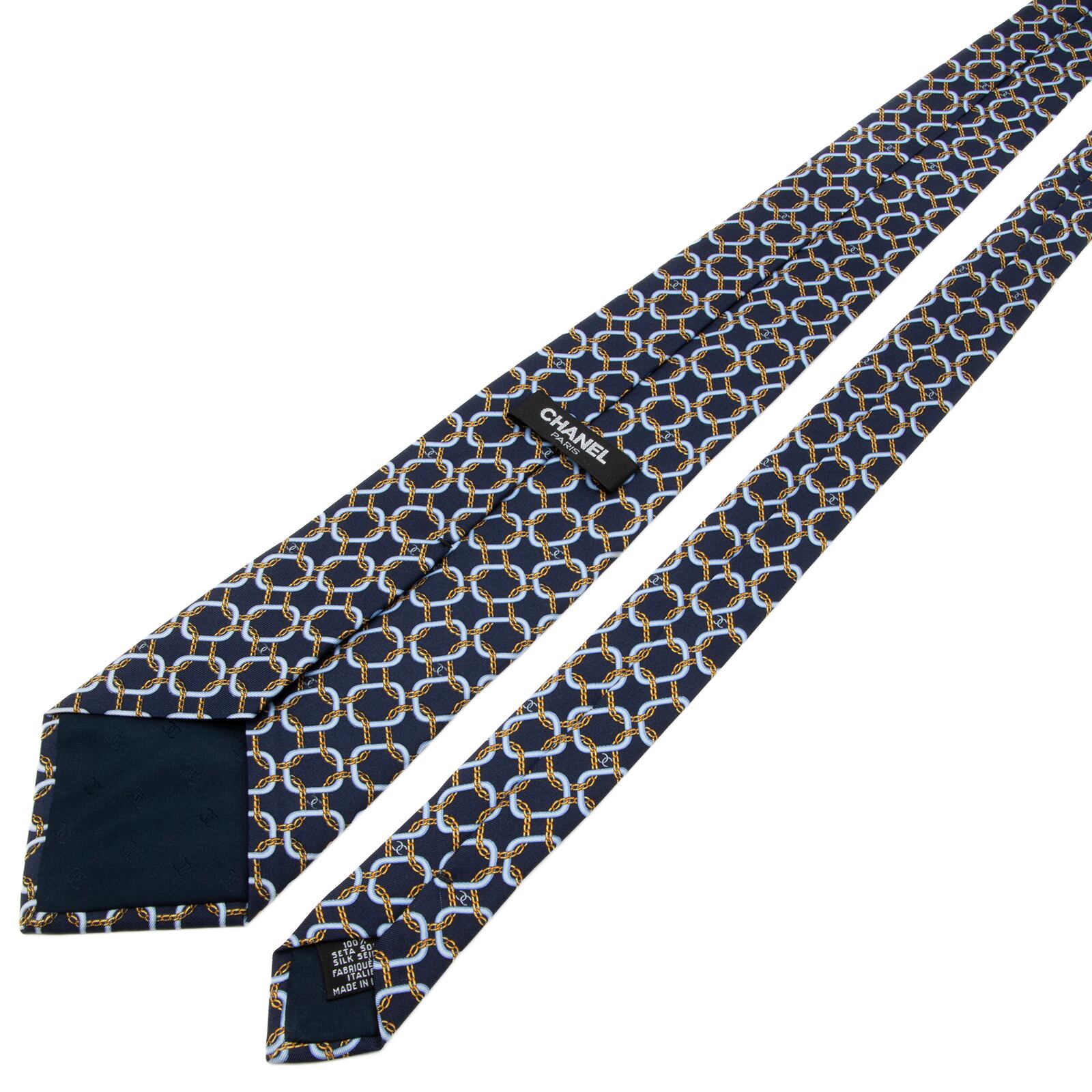 送料無料 シャネル ネクタイ シルク ネイビーブルー 水色 黄色 総柄 マイクロココマーク 鎖 チェーン ハイブランド イタリア製 綺麗 P821