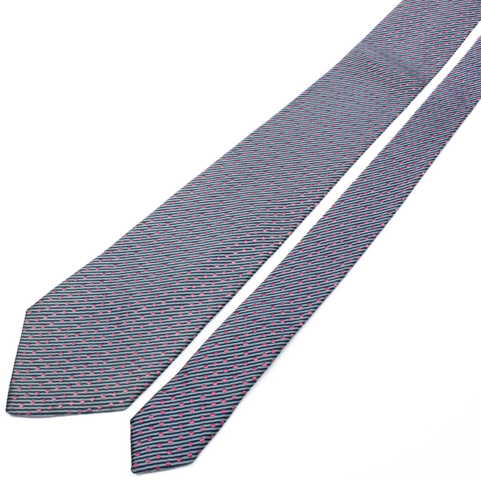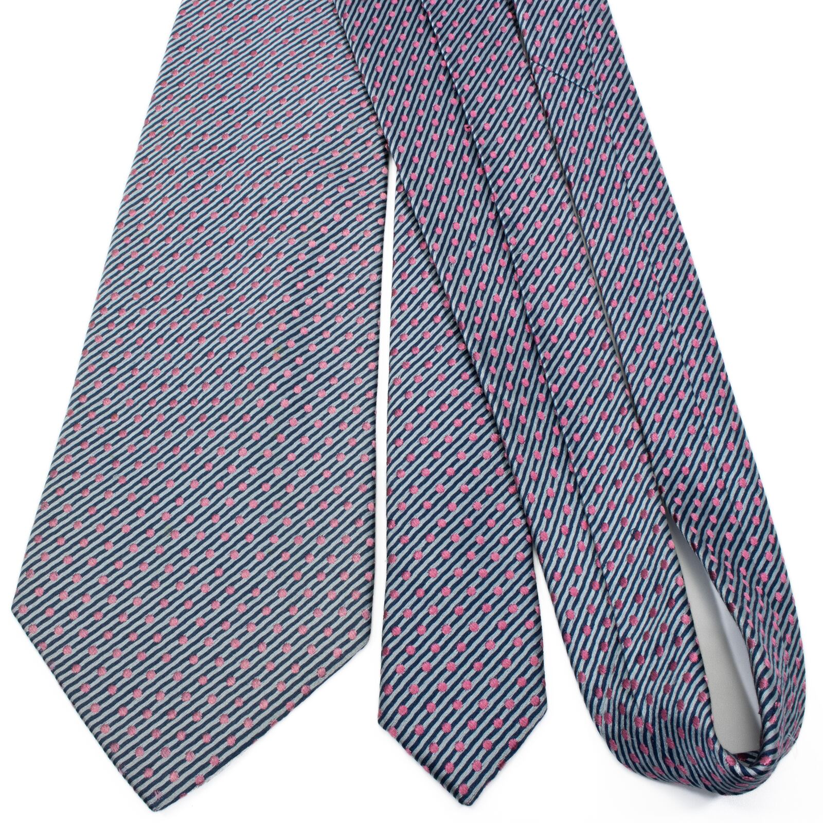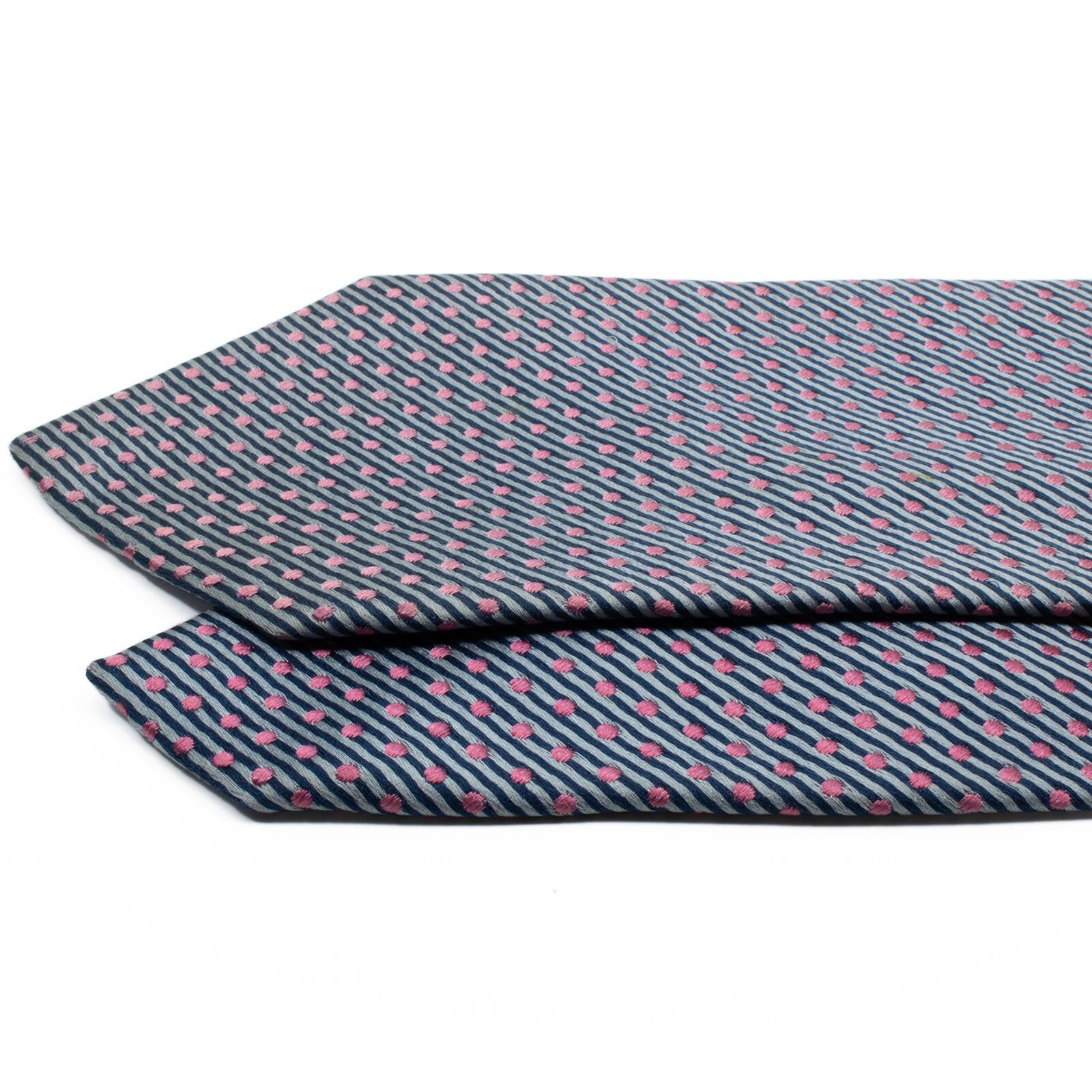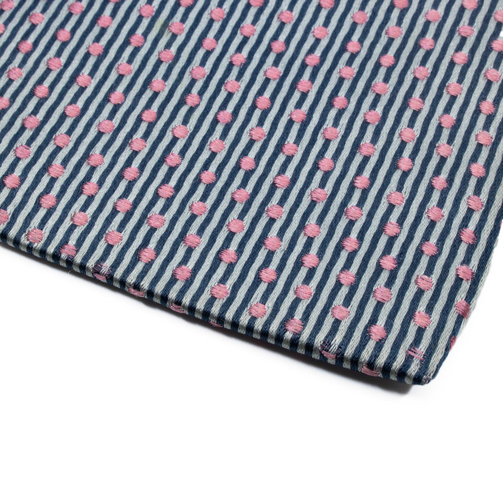 ネイビーブルーとグレーブルーが織りなす洗練されたストライプを背景に、ピンクのドット柄が規則正しく配置され、Vゾーンに絶妙なアクセントを与えてくれます。
