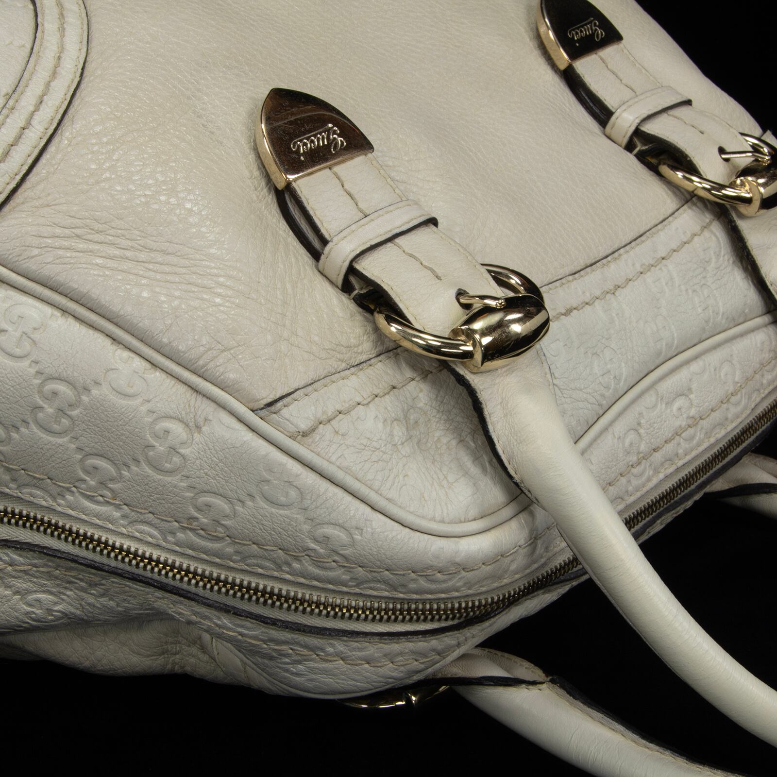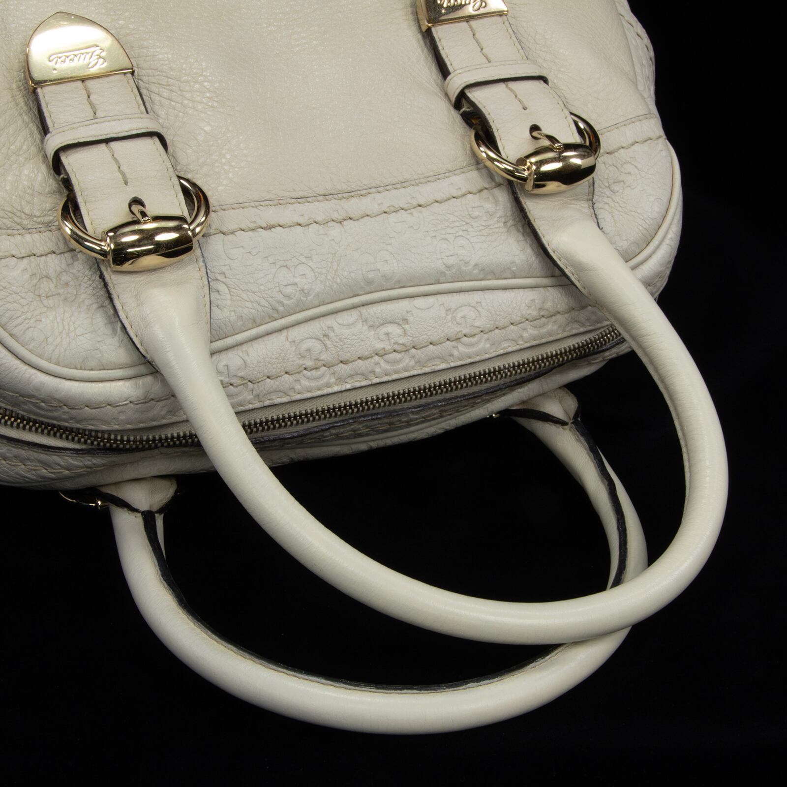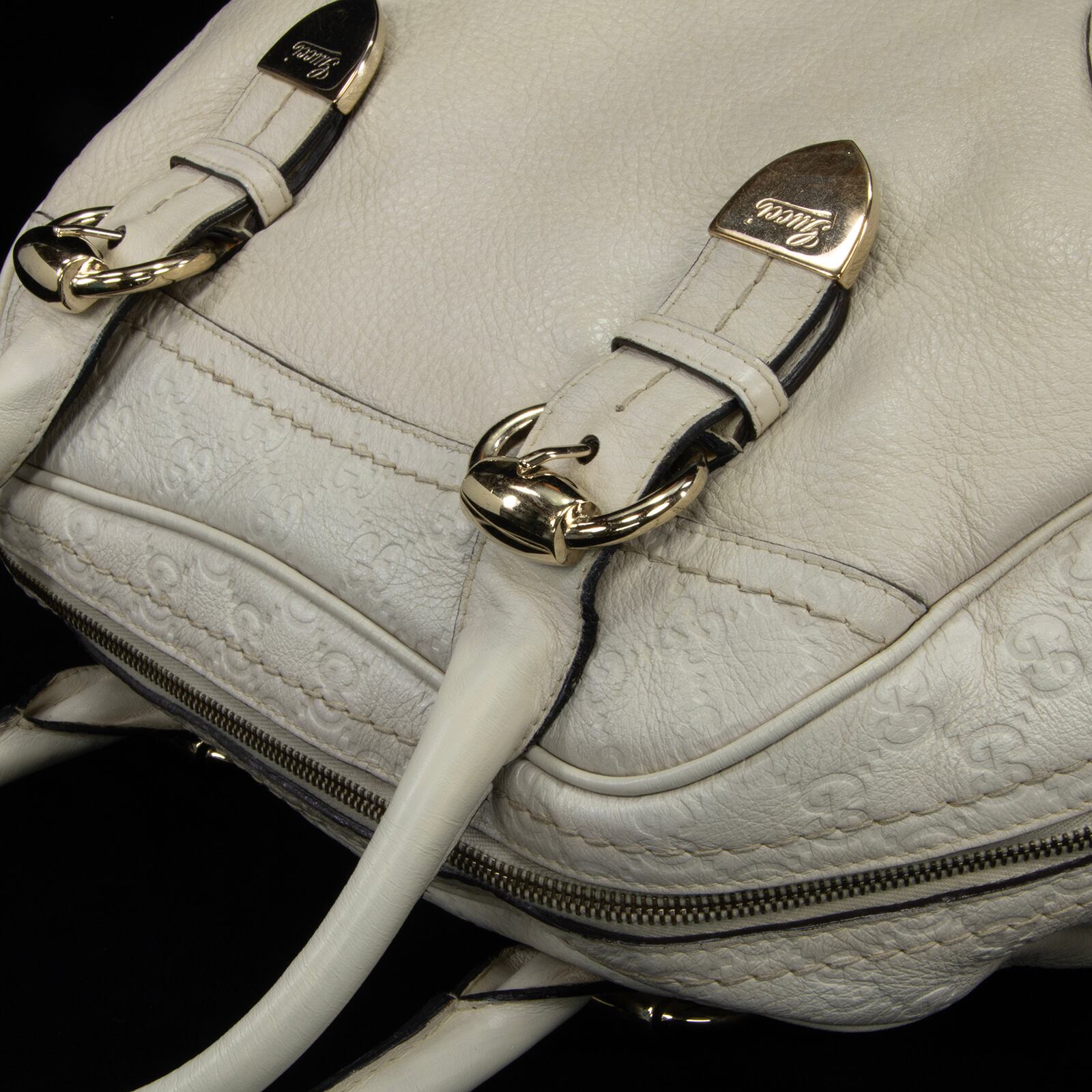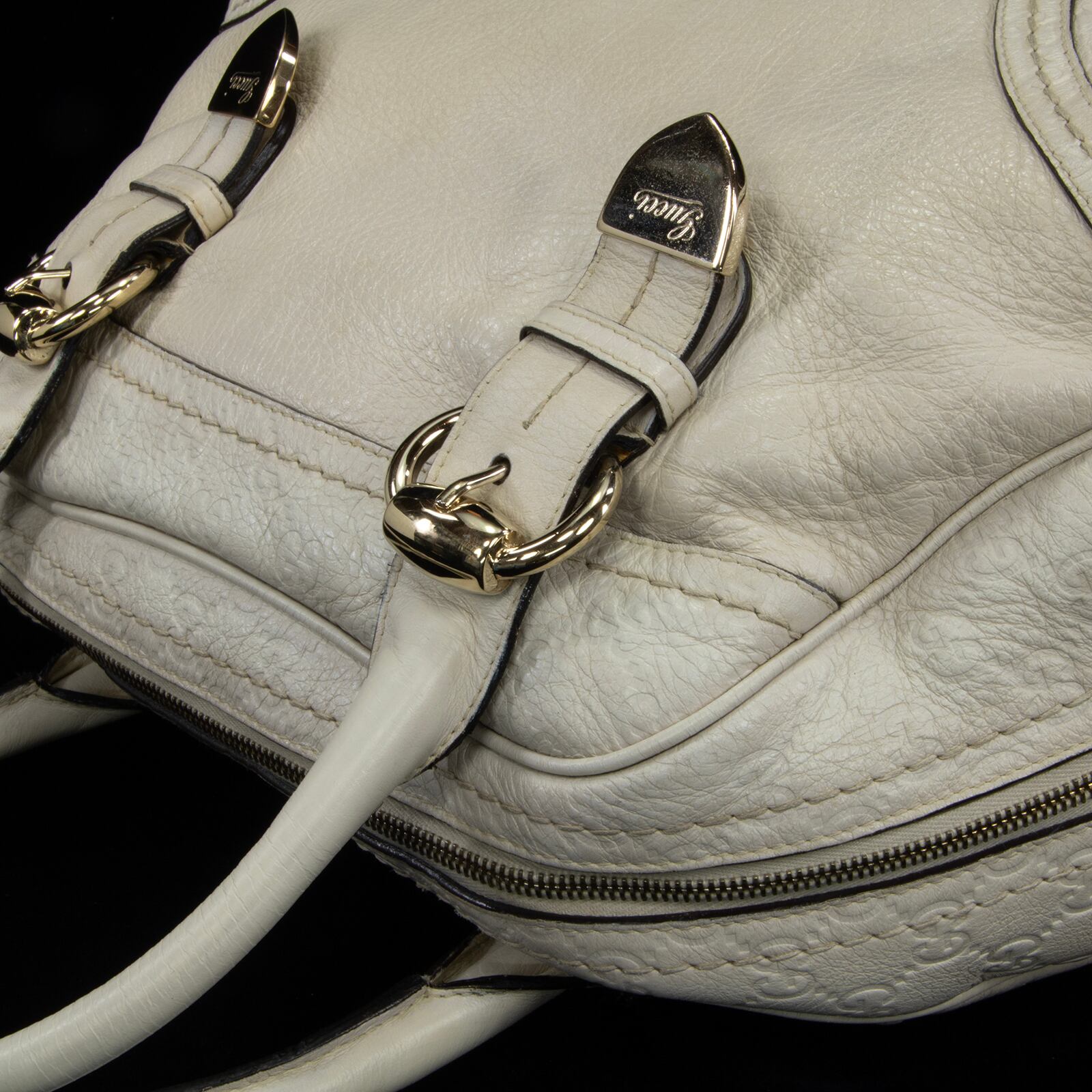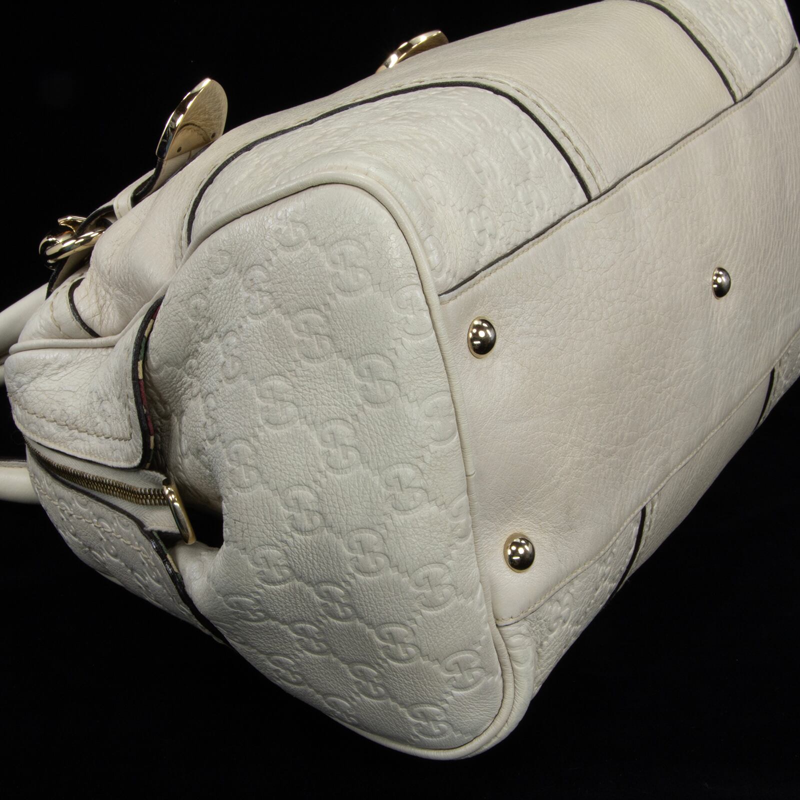 こちらは、洗練された白のレザーに馬具のモチーフが映える、グッチのシニョーリア・ラージ・グッチシマ・ハンドバッグでございます。