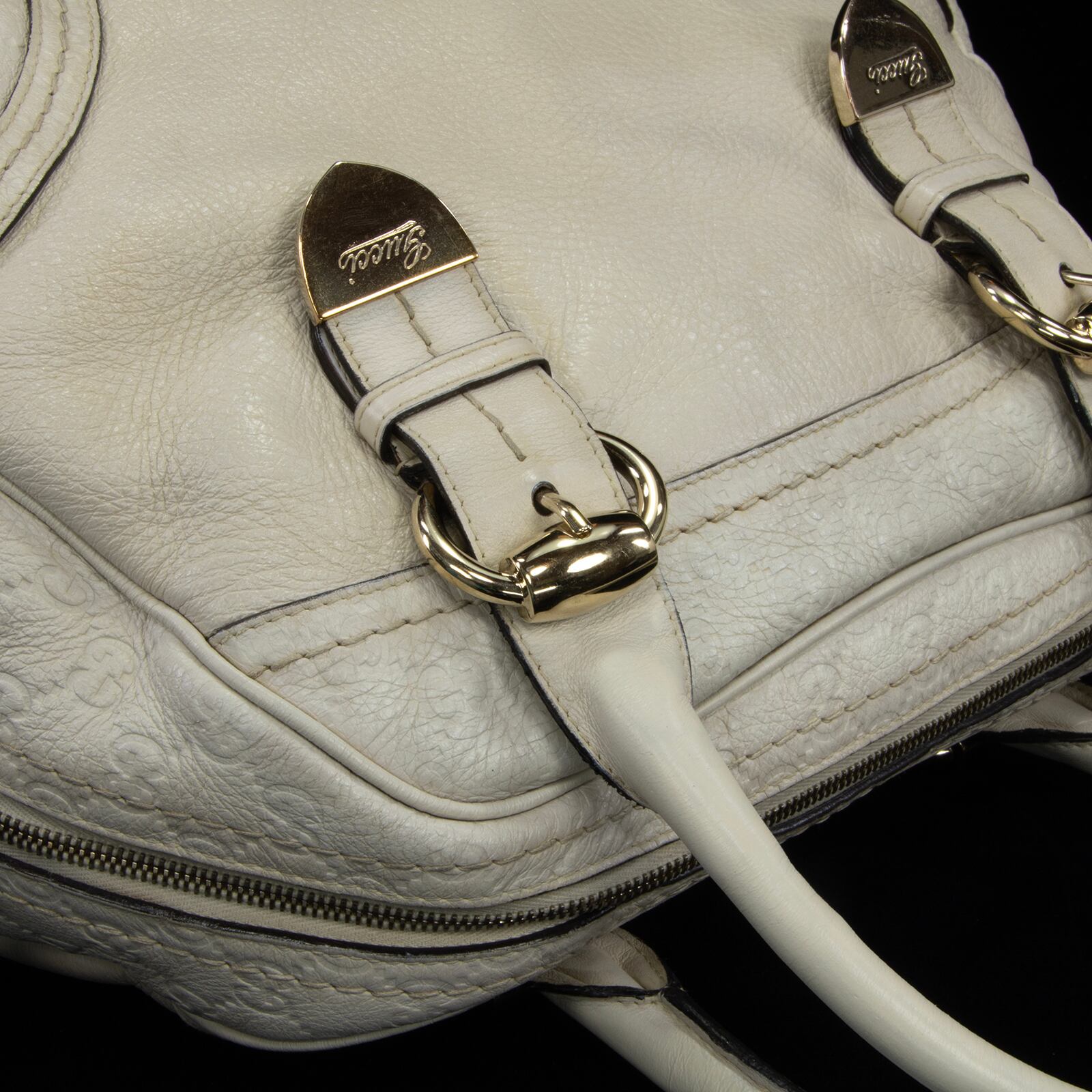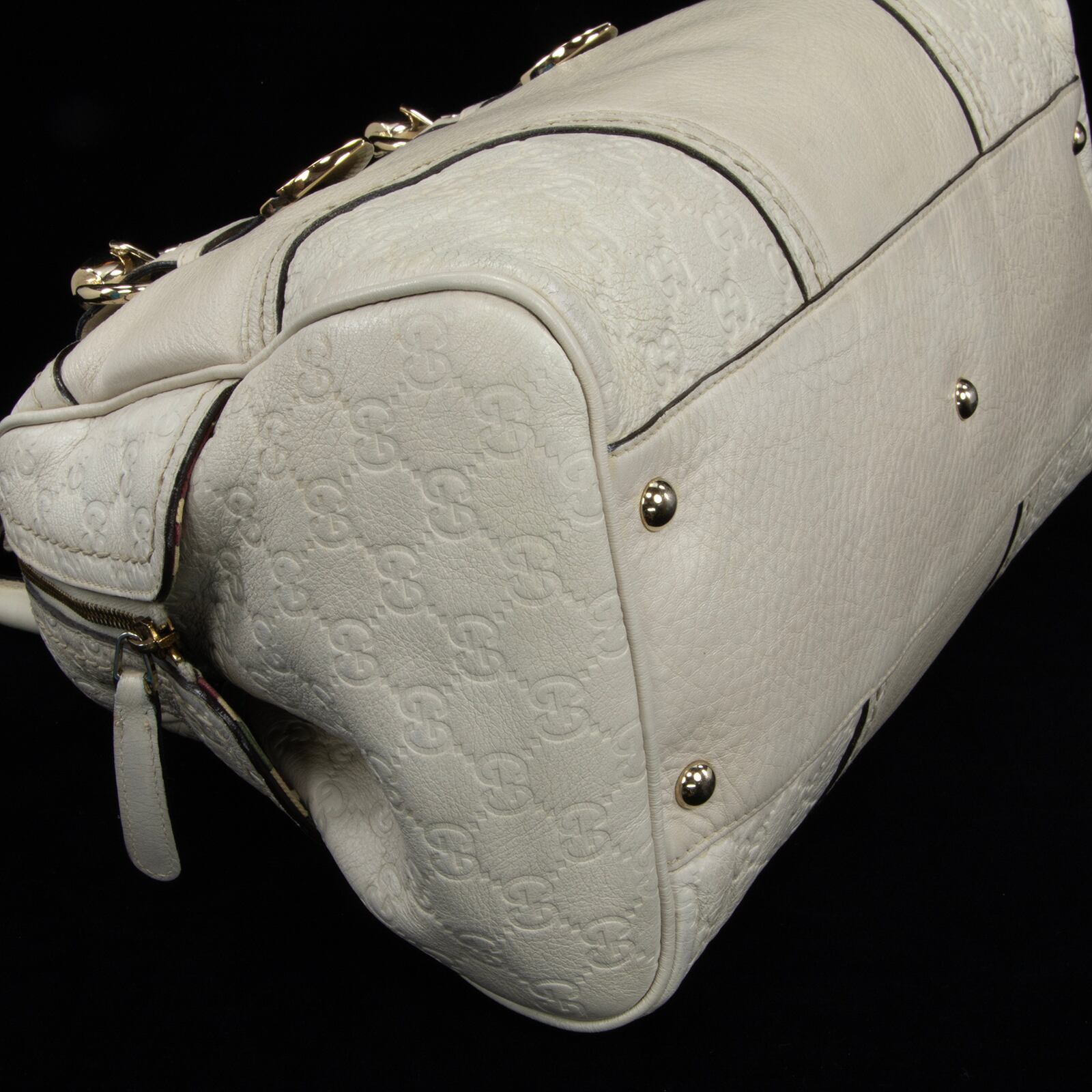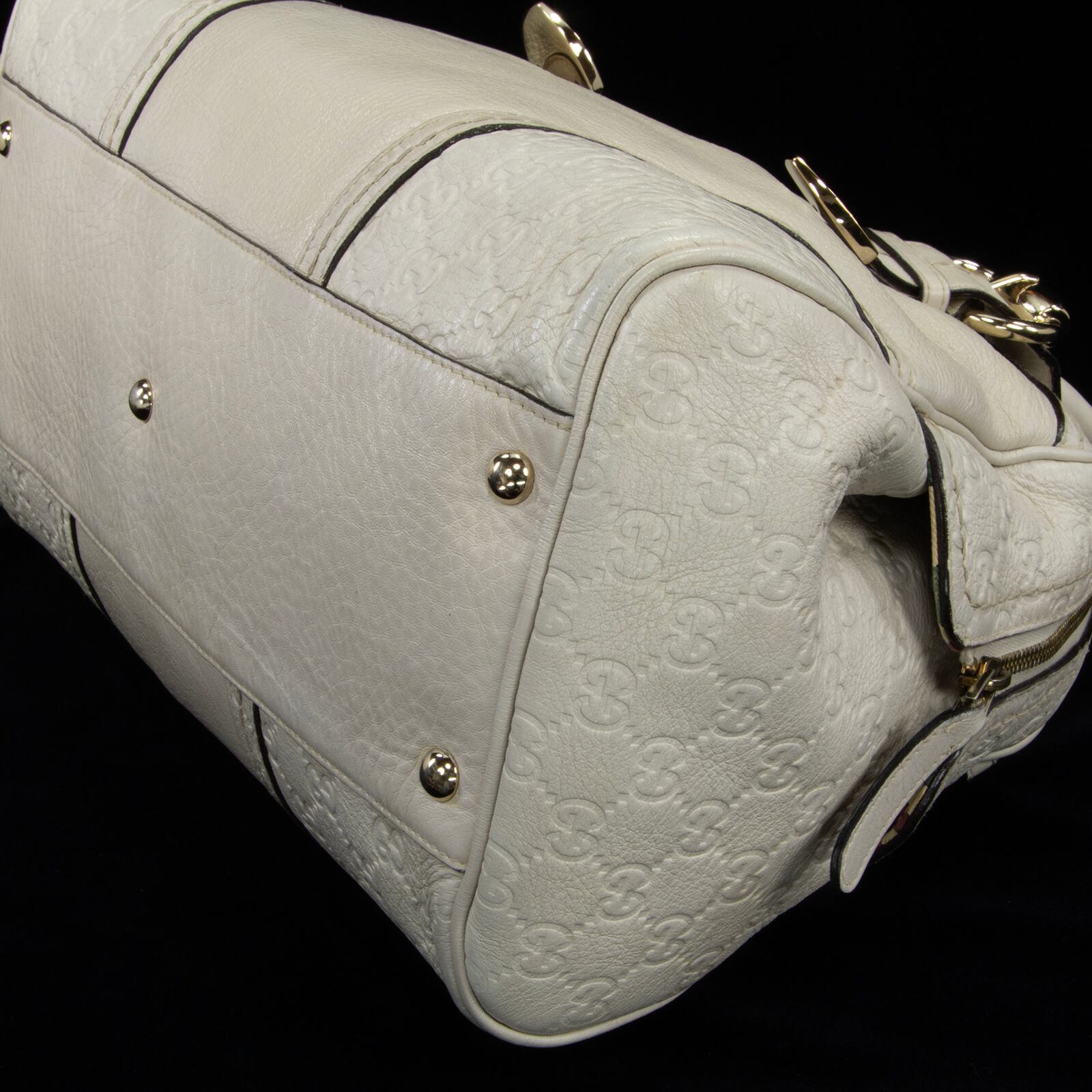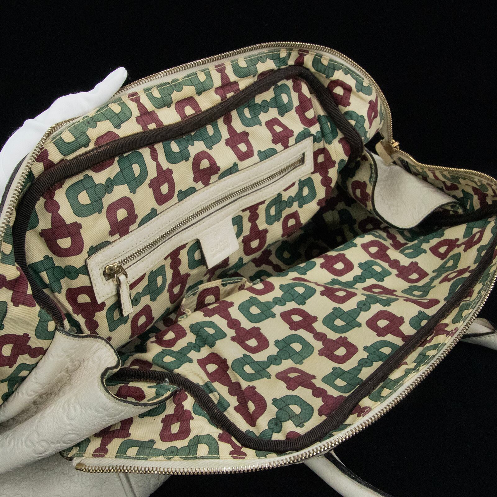 こちらは、洗練された白のレザーに馬具のモチーフが映える、グッチのシニョーリア・ラージ・グッチシマ・ハンドバッグでございます。