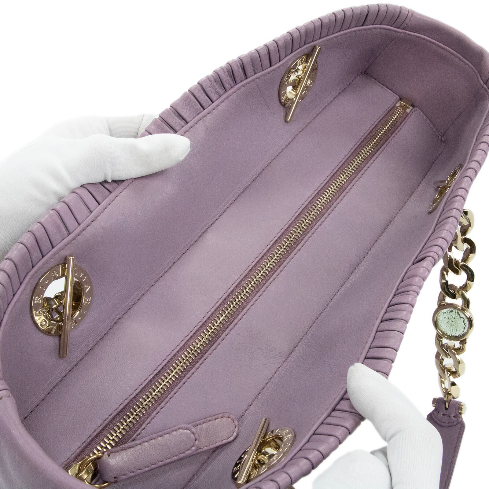 本物 送料無料 ブルガリ ハンドバッグ ショルダーバッグ レディース モネーテ 紫色 レア ゴールドチェーン ロゴ マーク 革 鞄 バック E481