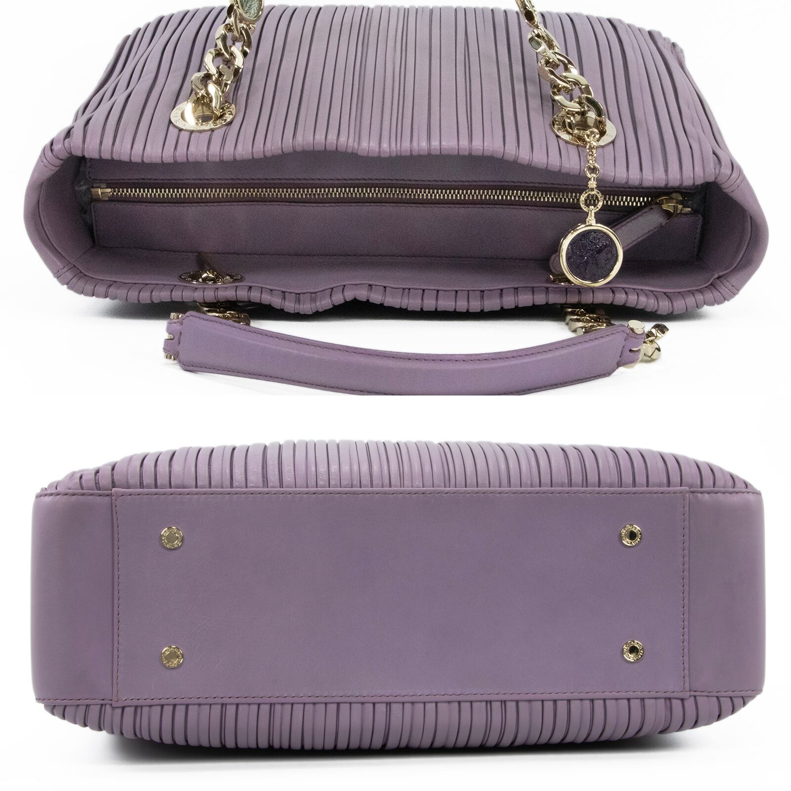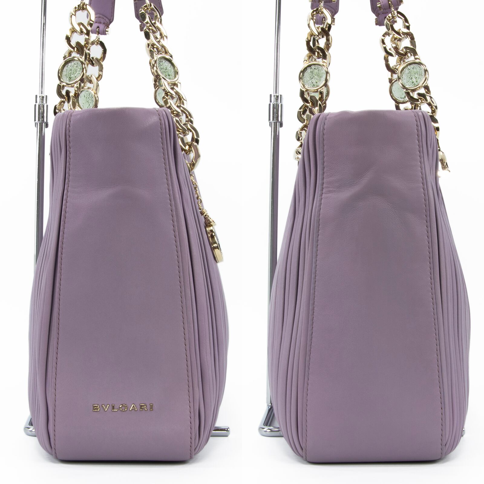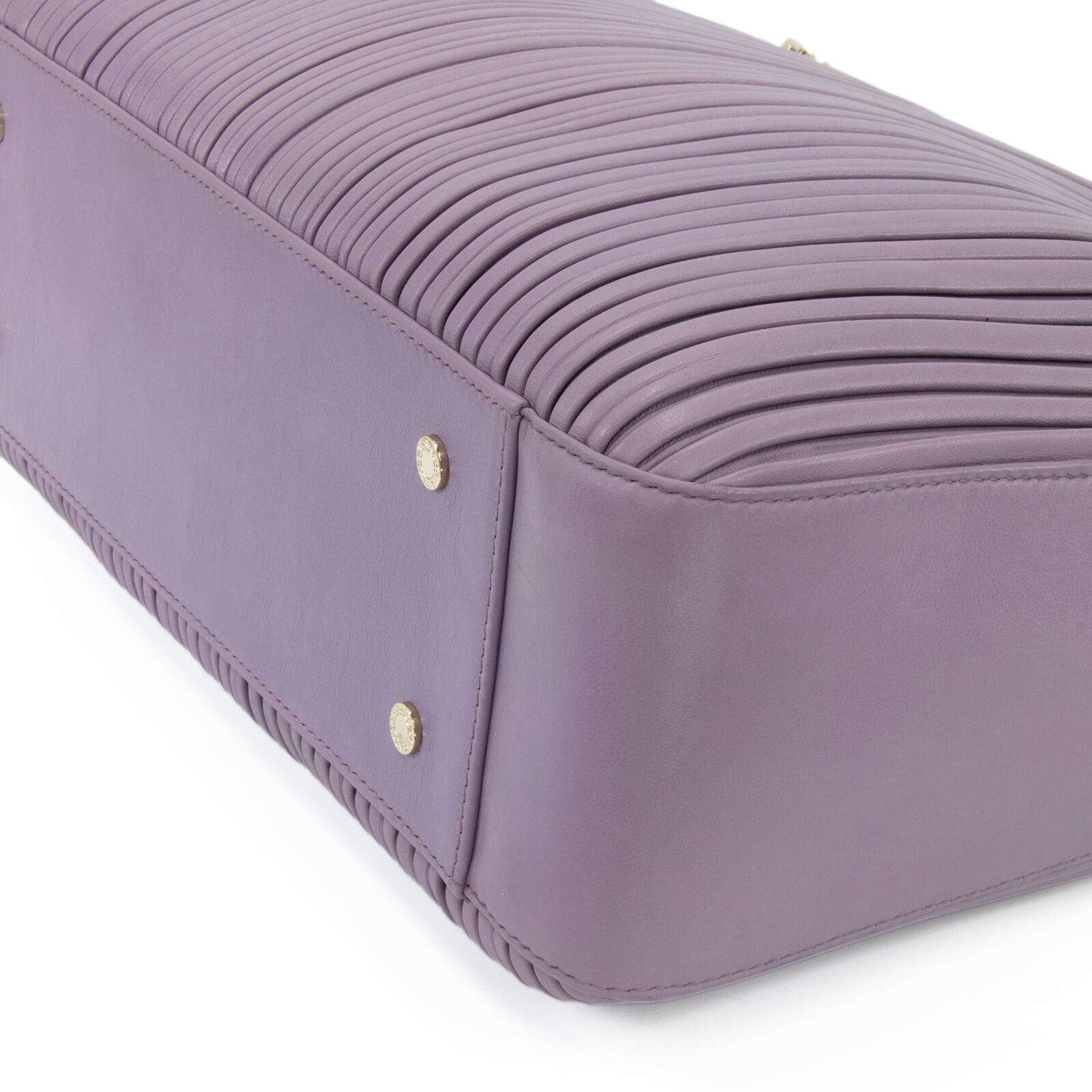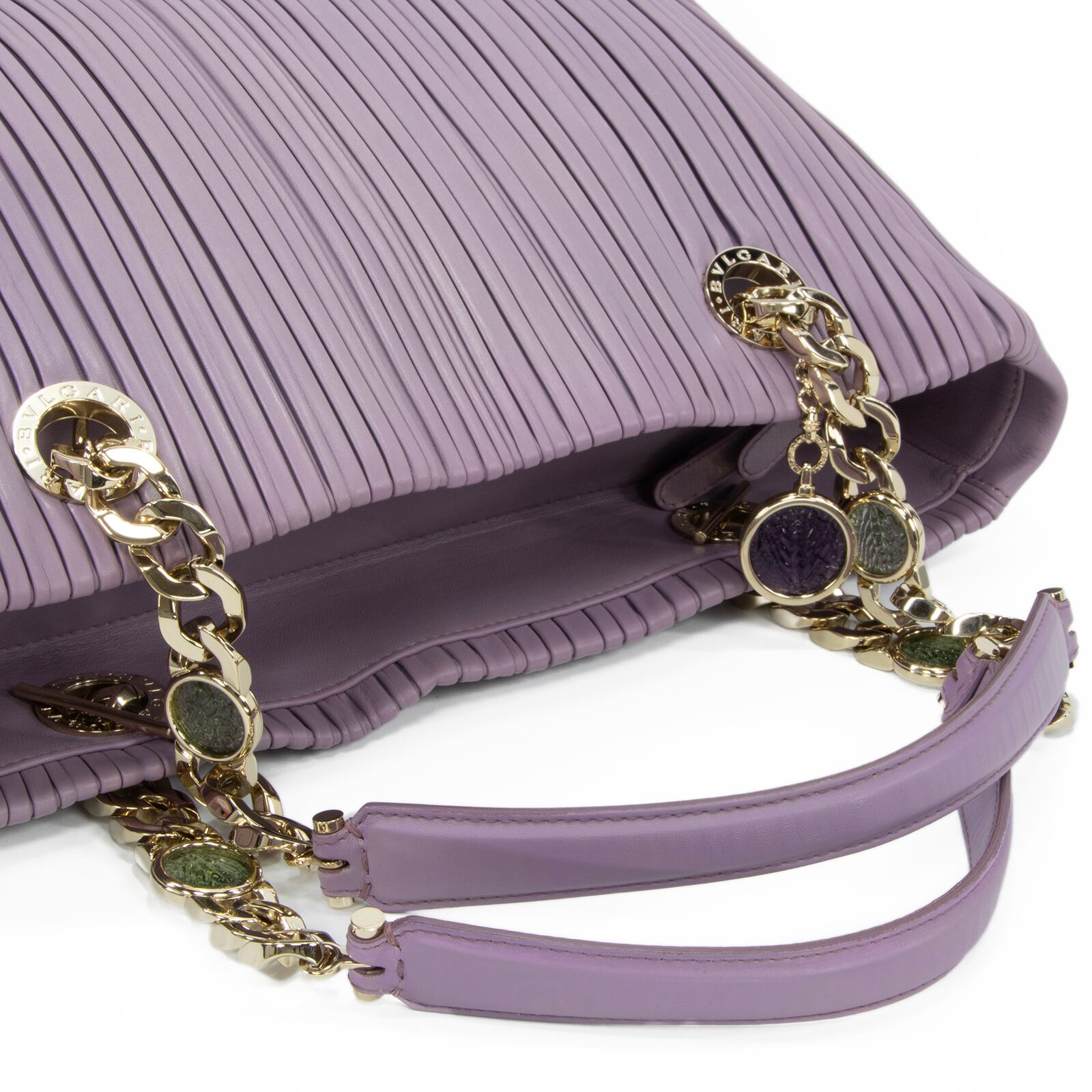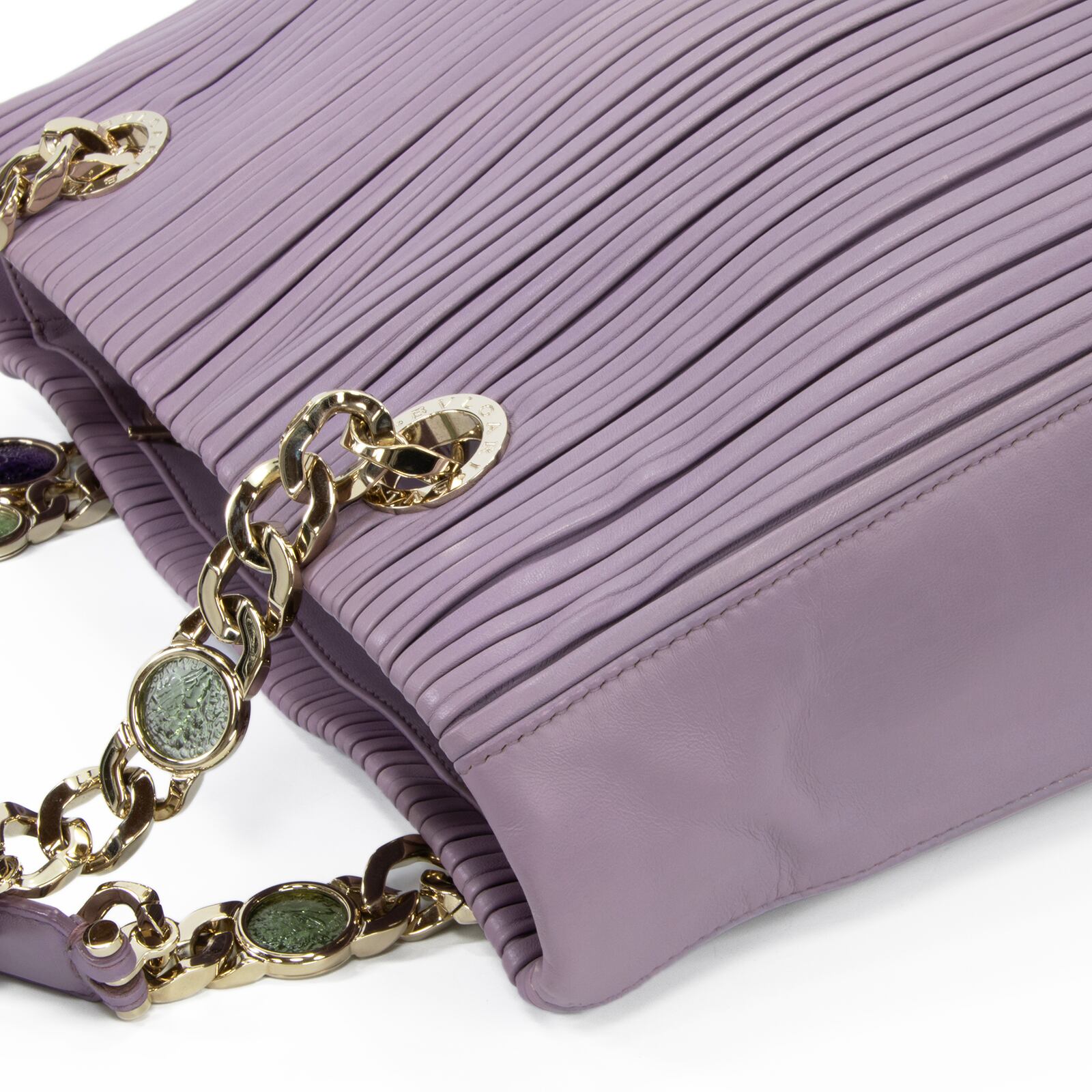 こちらは、古代コインの神秘的な輝きと繊細なプリーツが調和いたしました、ブルガリのモネーテ ナッパプリセ・ハンドバッグでございます。