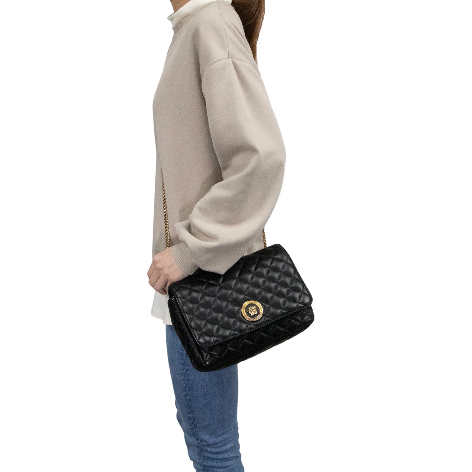 一目でヴェルサーチェとわかる前面のメドゥーサの存在感と、チェーンショルダーの煌めきが、装い全体をラグジュアリーな雰囲気へと昇華させております。