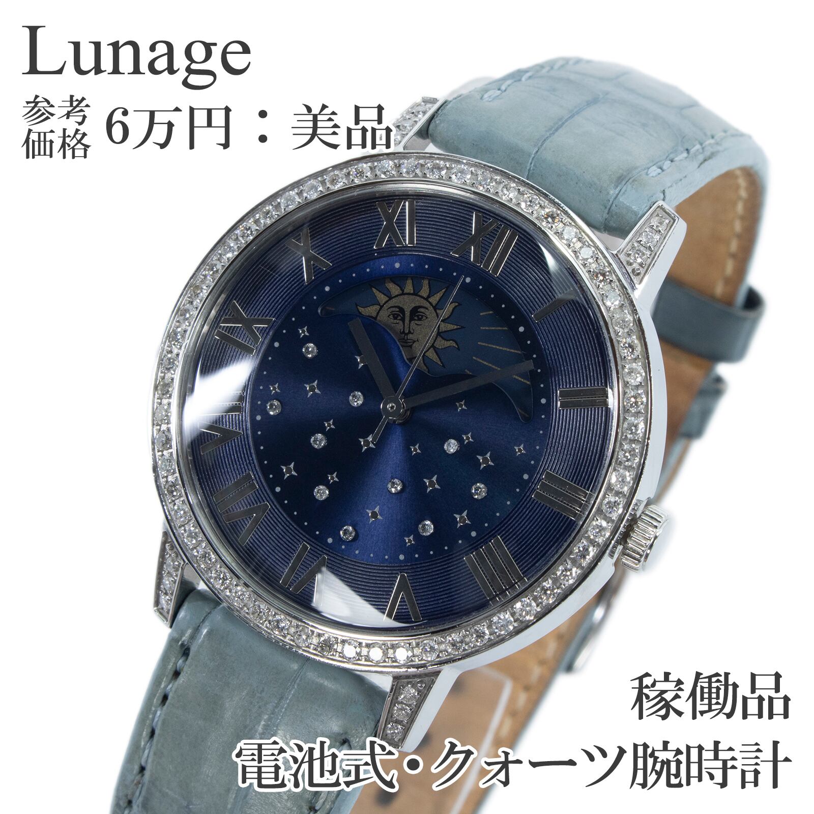稼働品 送料無料 Lunage ルナージュ 腕時計 クォーツ レディース クロコダイル ネイビーブルー 0.75ctダイヤモンド 革ベルト ブランド Q245