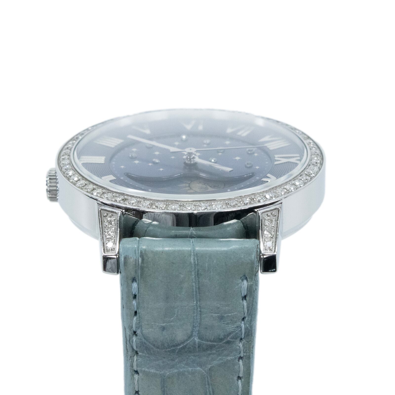 特徴:ダイヤモンドベゼル・合計0.75カラットダイヤ・派手・目立つ・ローマン文字・革ベルト・革バンド・エキゾチックレザー・ブランド・珍しい・人気・おしゃれ