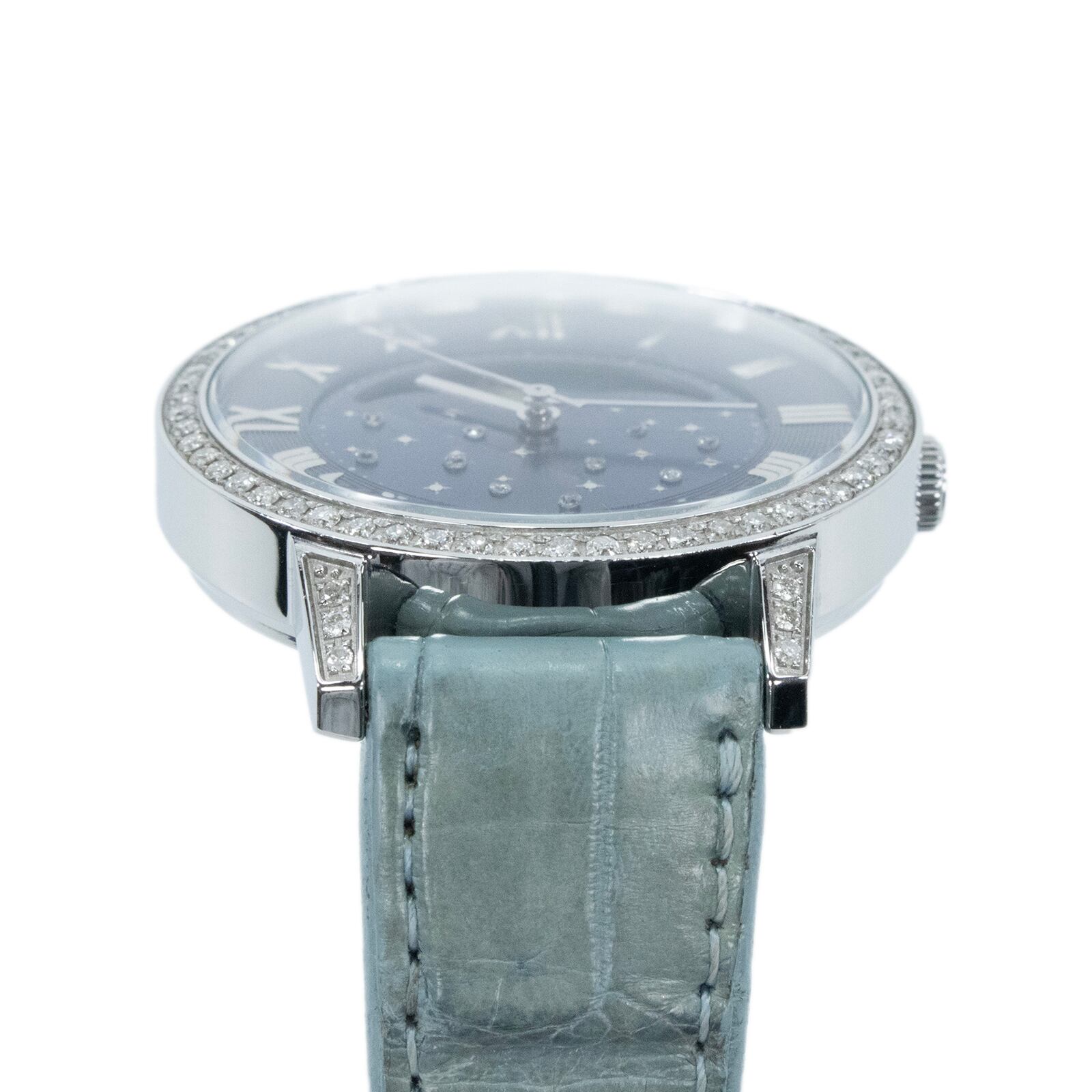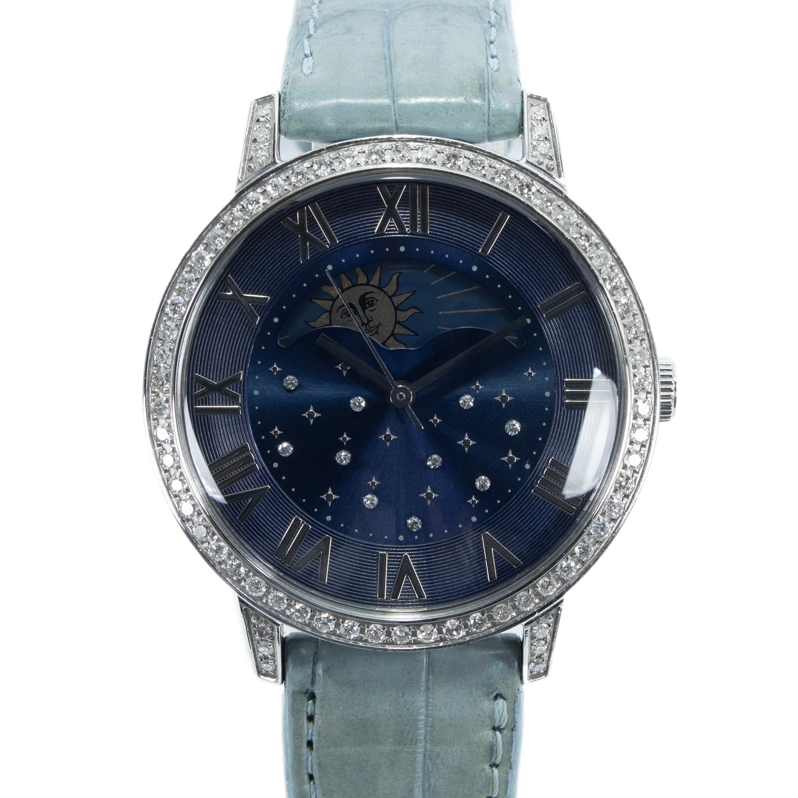 こちらは、夜空を思わせるネイビーブルーの文字盤に星々が瞬く、ルナージュの腕時計でございます。