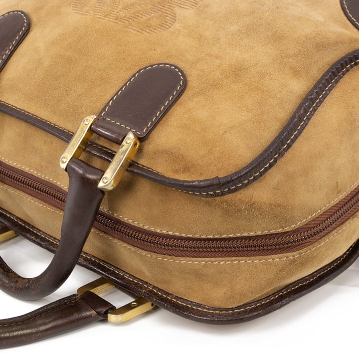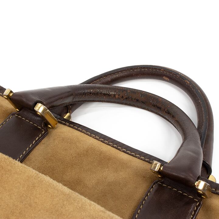 バッグの外側は、ハンドルなどのレザーに擦れ・角などのパイピングのレザーに若干のクラック・スエードなどに薄汚れや使用感などがございます。