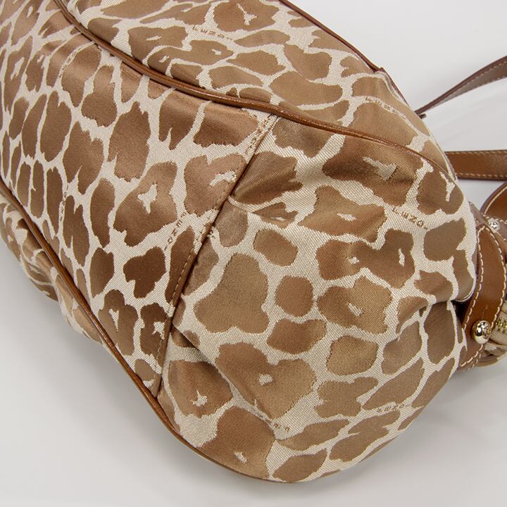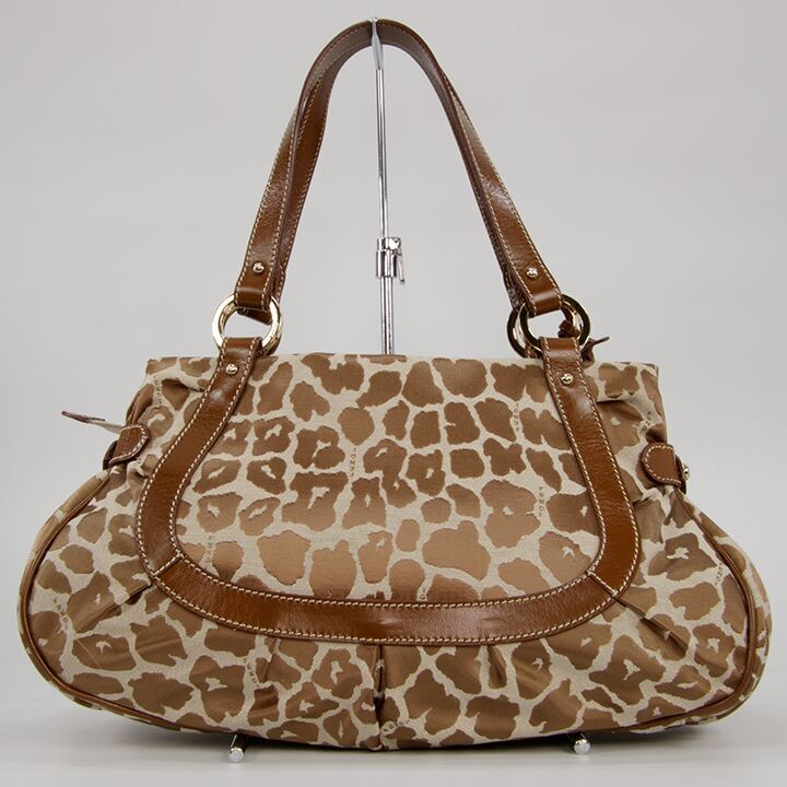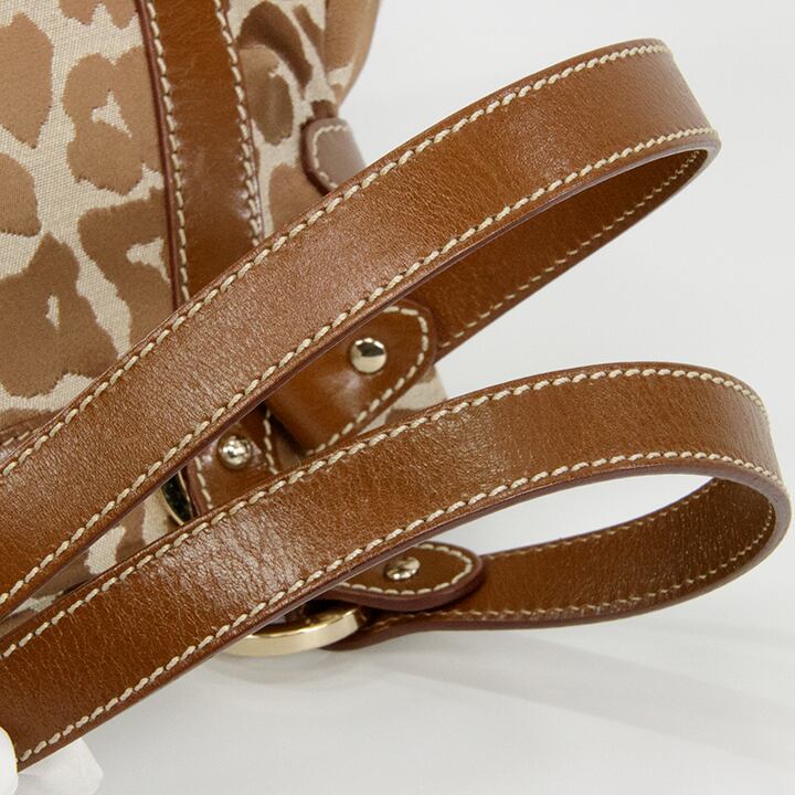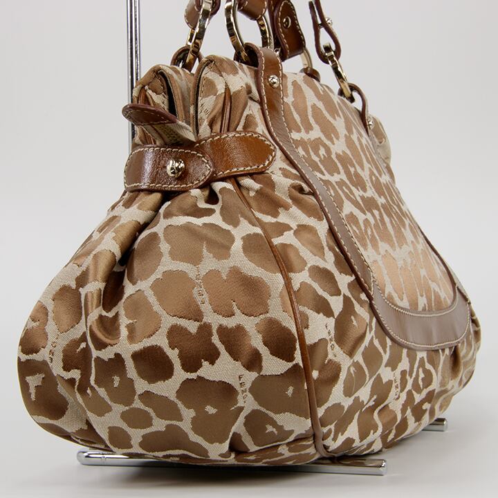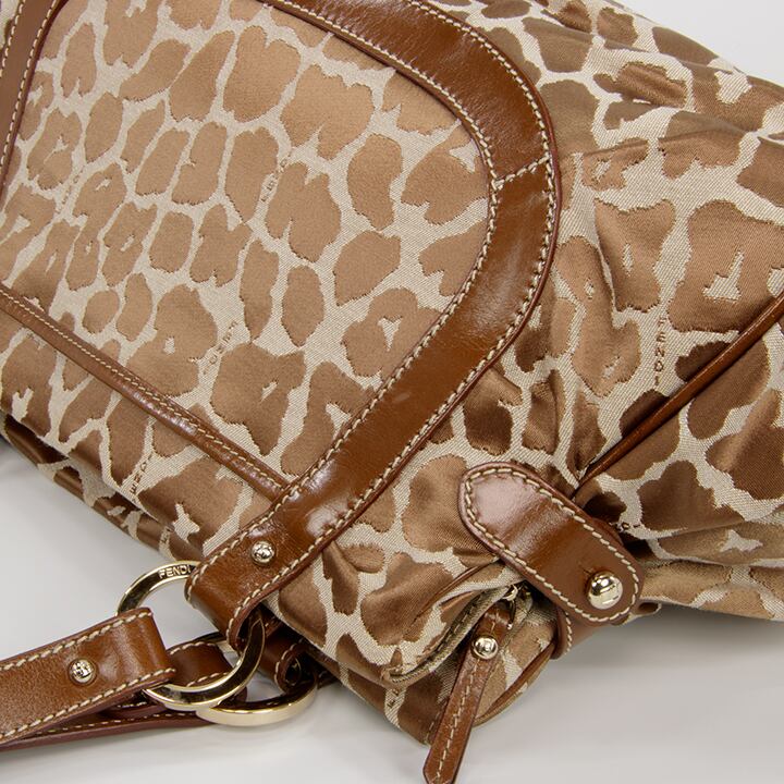 サテン・キャンバスのコンビデザインのレオパード柄と、バッグ全体とチャームの「FENDI」ロゴが、フェンディならではの存在感がございます。