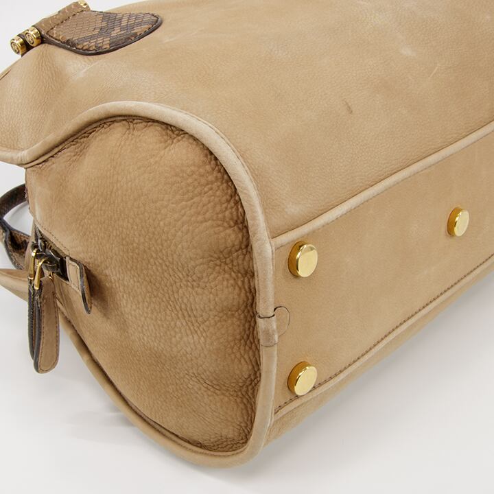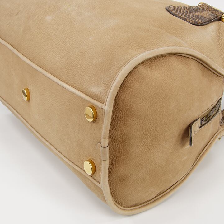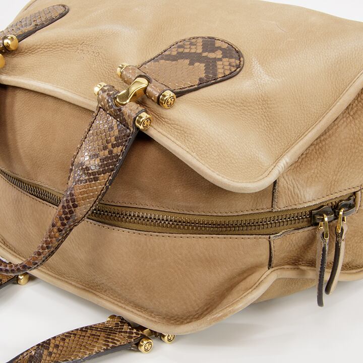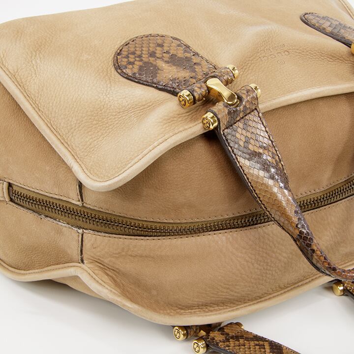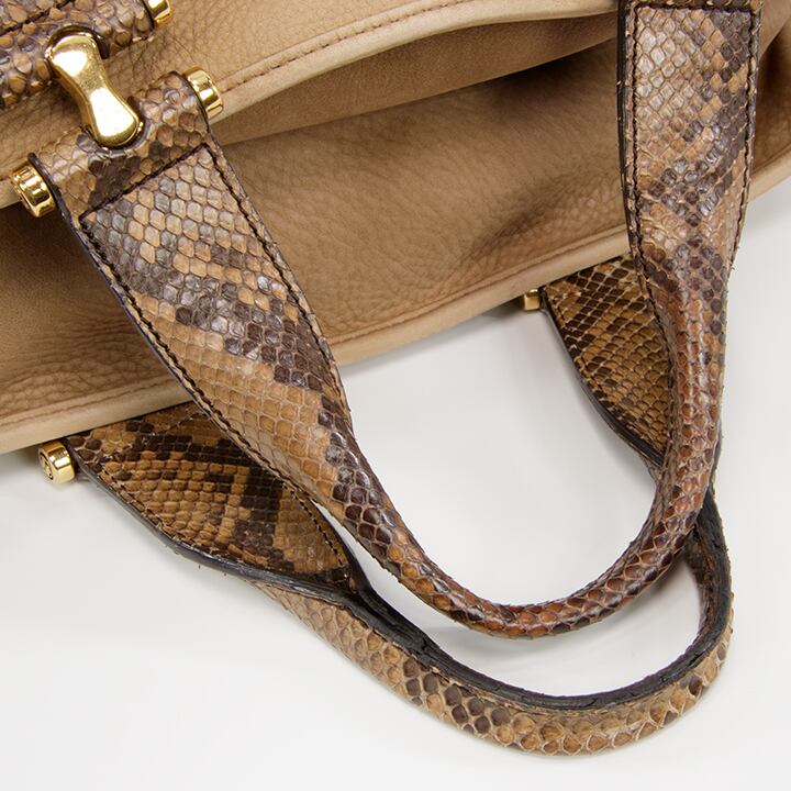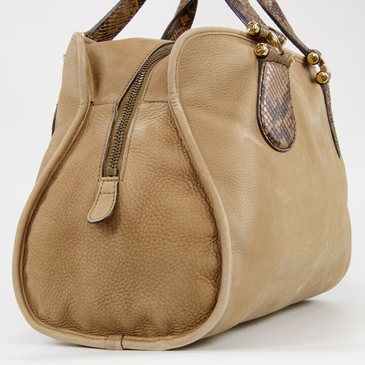 大量生産に走った時期とは違った、グッチの熟練の職人の技術力が随所に見られる逸品。最高級パイソンとヌバックの組み合わせが、高級皮革の深い味わいを引き立てています。
