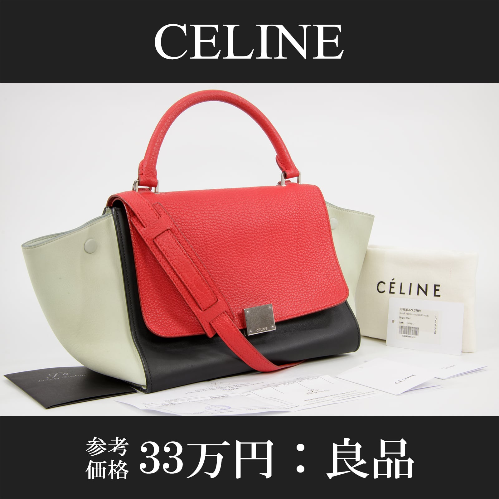 【本物・送料無料・良品】セリーヌ・2WAYショルダーバッグ(スモール トラペーズ・人気・珍しい・赤・グレー・黒・ブラック・A743)