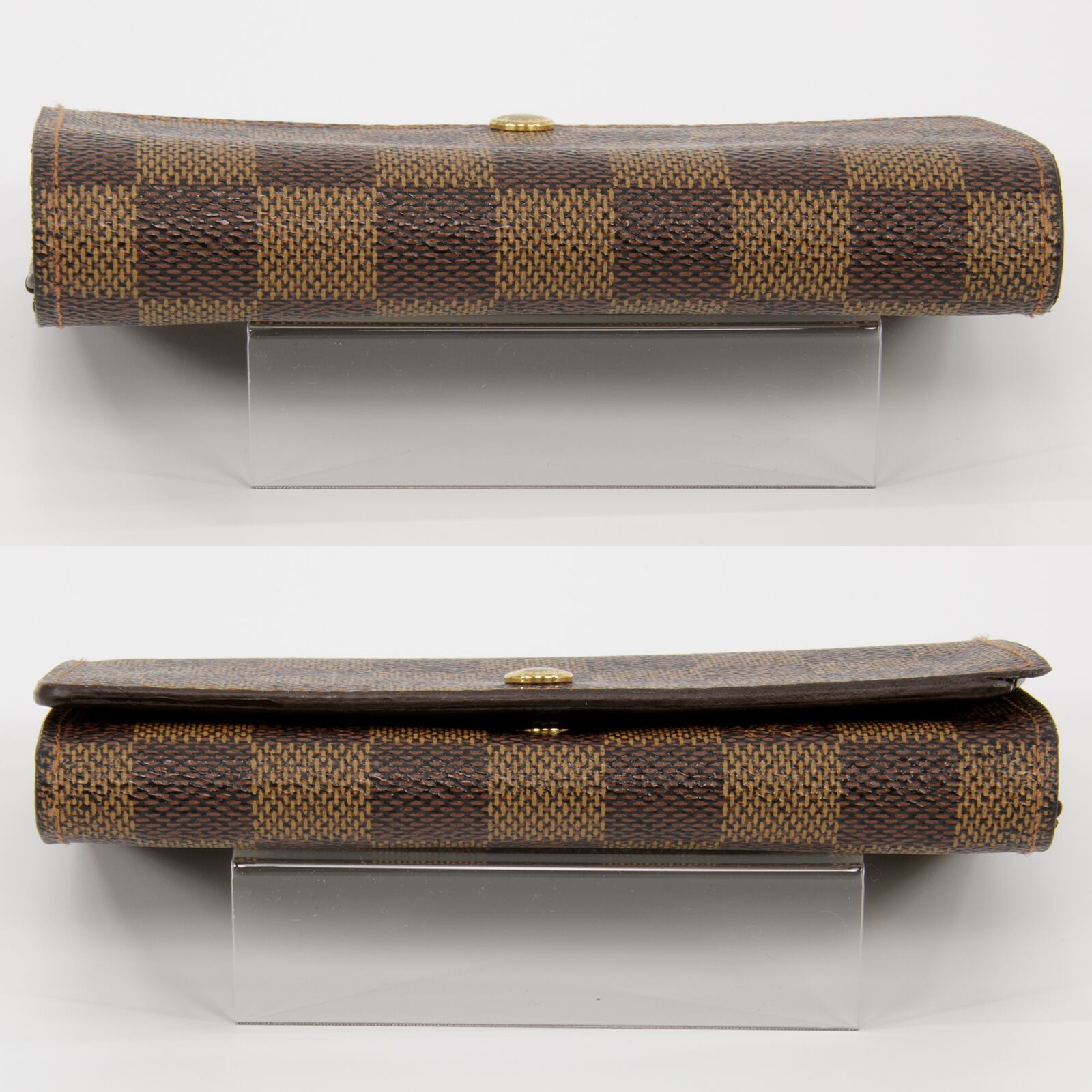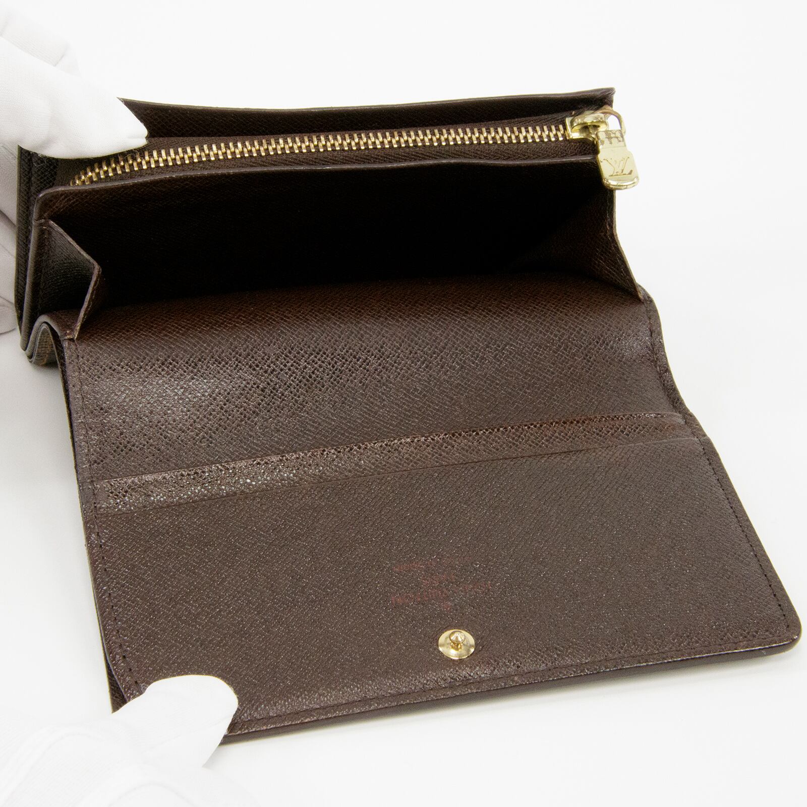 「ポルトフォイユ・トレゾール」と「ポルト・モネ・ビエ・トレゾール」の違いは、オープンポケットが2つか4つの違いで、こちらのお財布はオープンポケットが2つの比較的スマートなタイプで、ヴィトンの伝統的なライン「ダミエ・エベヌ」ならではの、落ち着いた大人の魅力が感じられます。