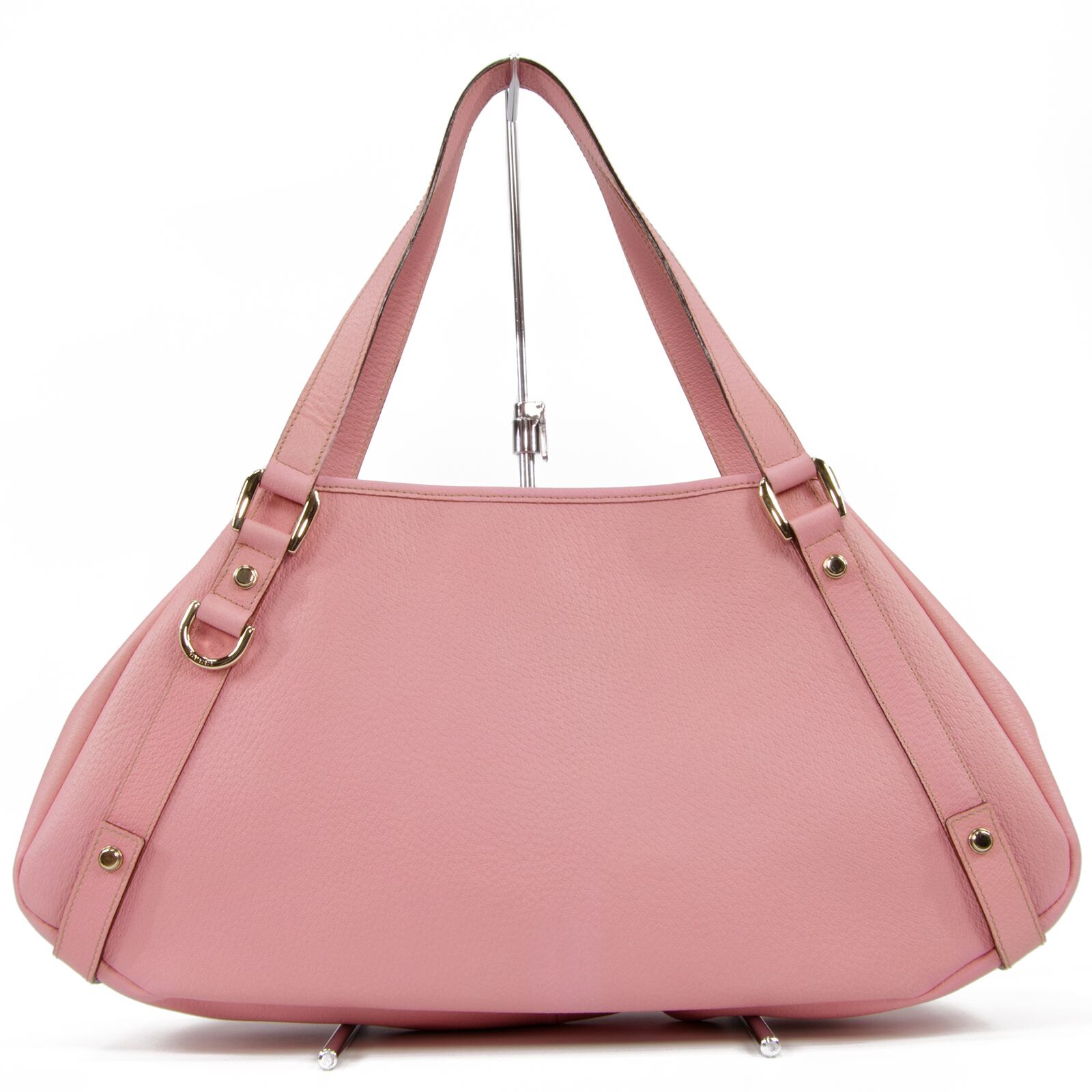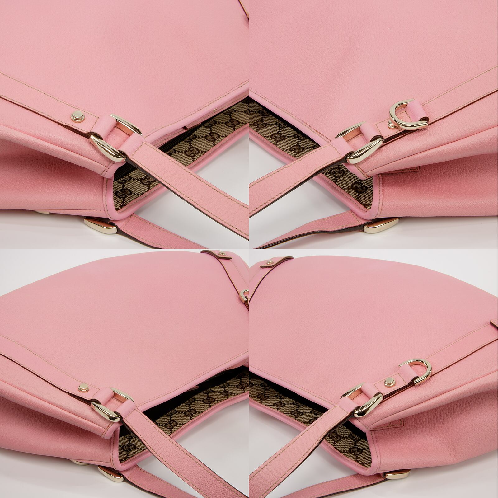 「GUCCI」が刻印されたDリング・リベット金具が特徴のアビー。2005年・日本限定ラインの特徴である厳選されたピンク系のピッグスキンが全面にあしらわれており、ゴールドカラーの金具と相まって、エレガントと可愛らしさが絶妙に感じられる逸品でございます。