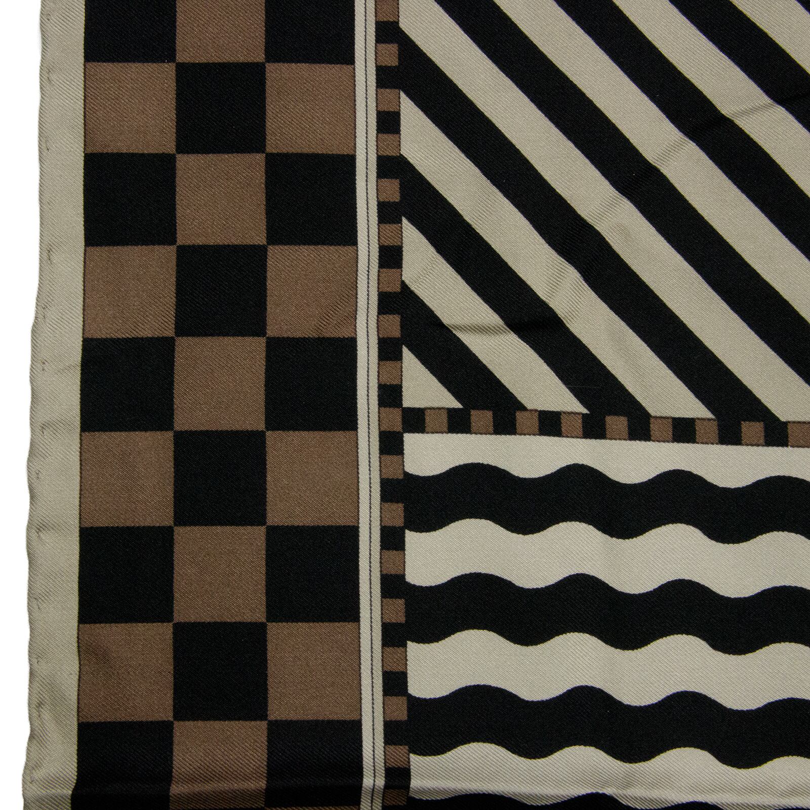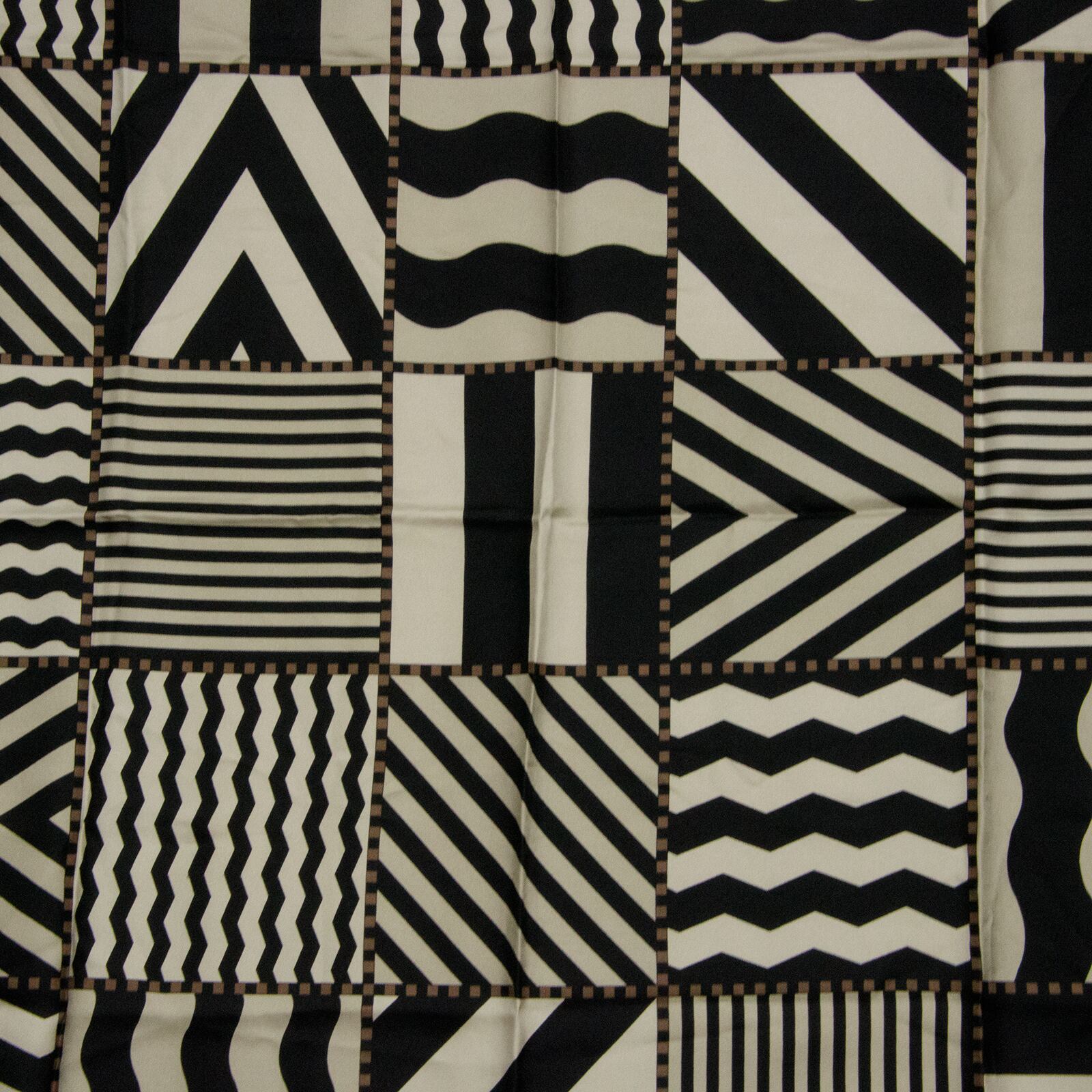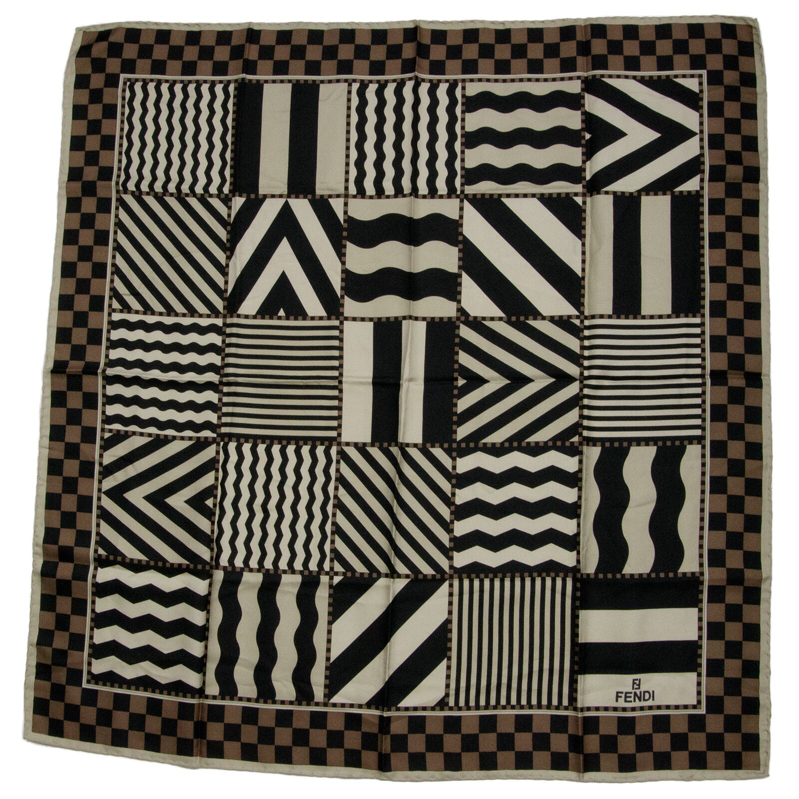 フェンディらしい配色のシルクで、スクエア柄やストライプ柄などが繊細に描かれた、セレブな大人の魅力を感じる逸品。ズッカなどのようなFF総柄は無く、ブランドアピールを控えめにしつつも、フェンディ独特の存在感を演出しております。