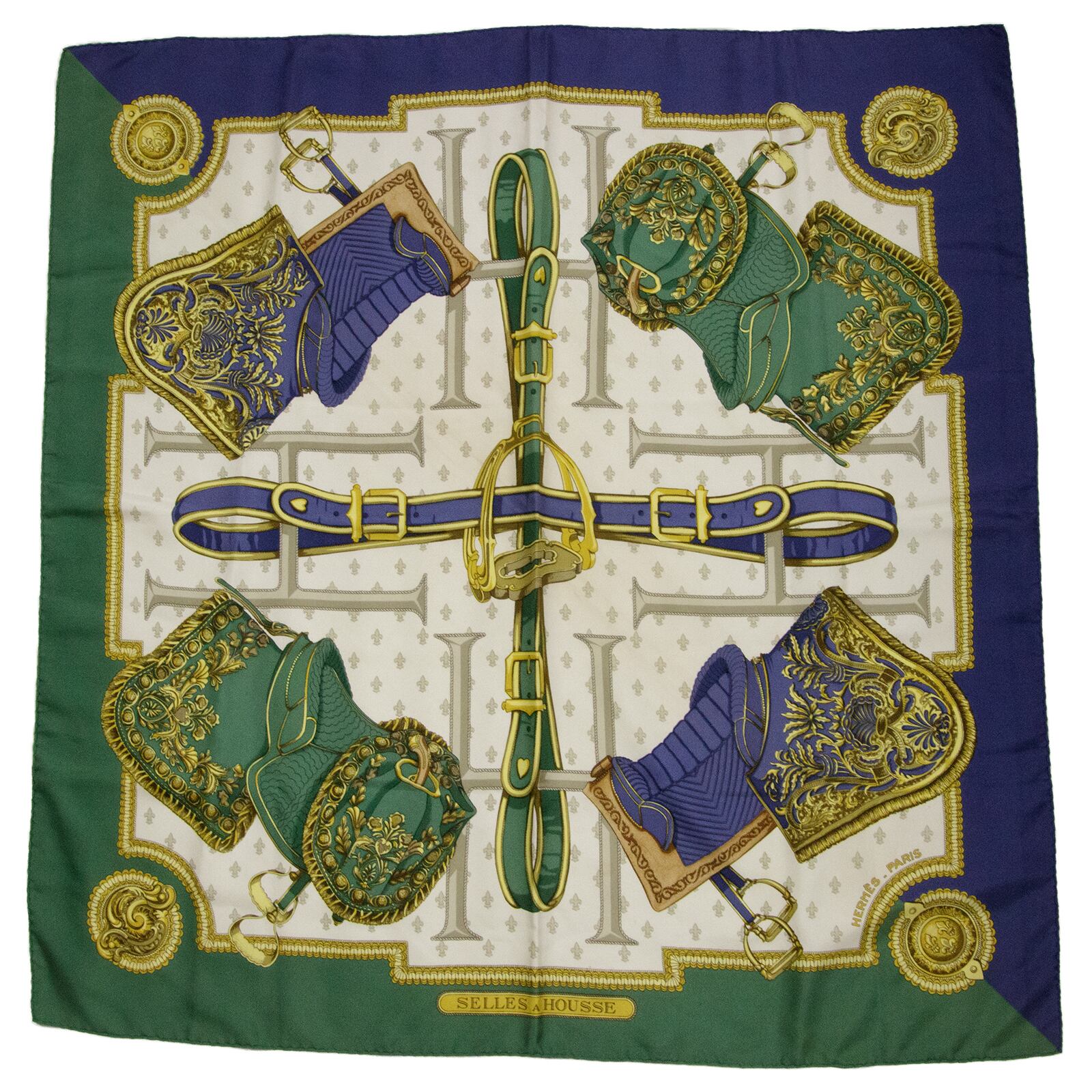 全面に気品溢れる馬具・装飾・フランス王室の紋章(フルール・ド・リス:アイリスの様式化)が繊細に描かれており、エルメスらしいエレガントな配色と相まってセレブな大人の魅力を感じさせる逸品。30年ほど前に海外で販売されていた希少なスカーフで、こちらのデザインをご存じの方は相当なエルメスのマニアかと存じます。
