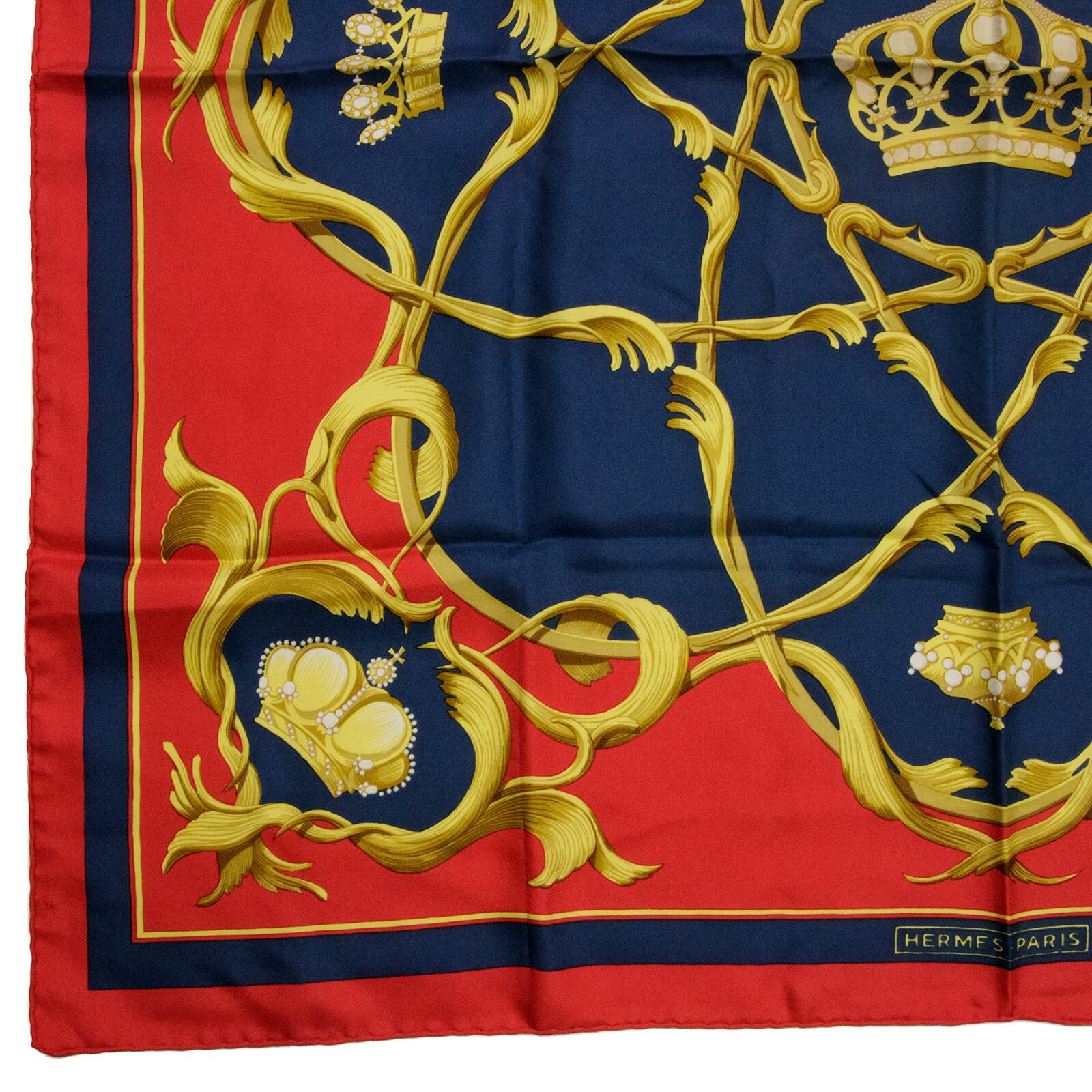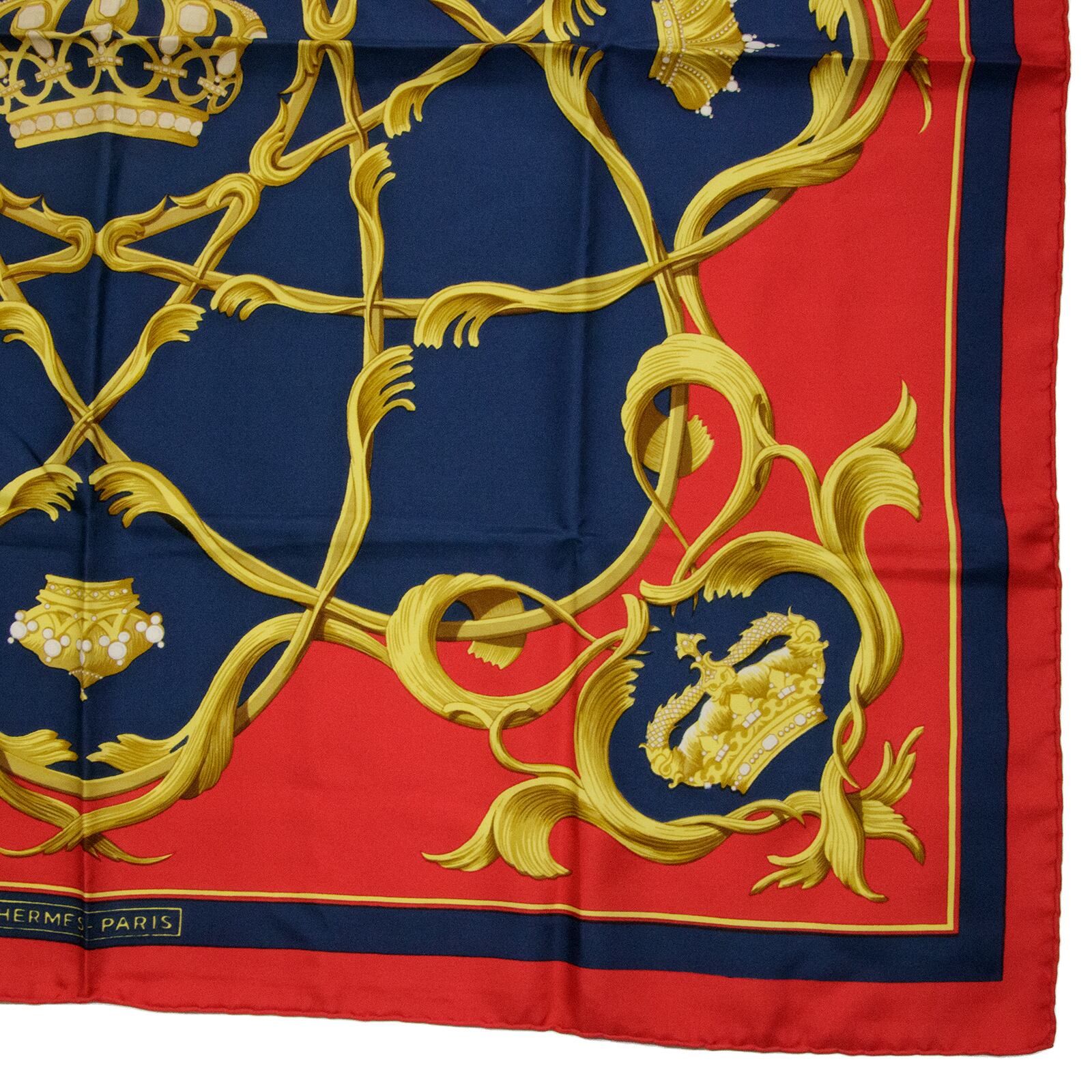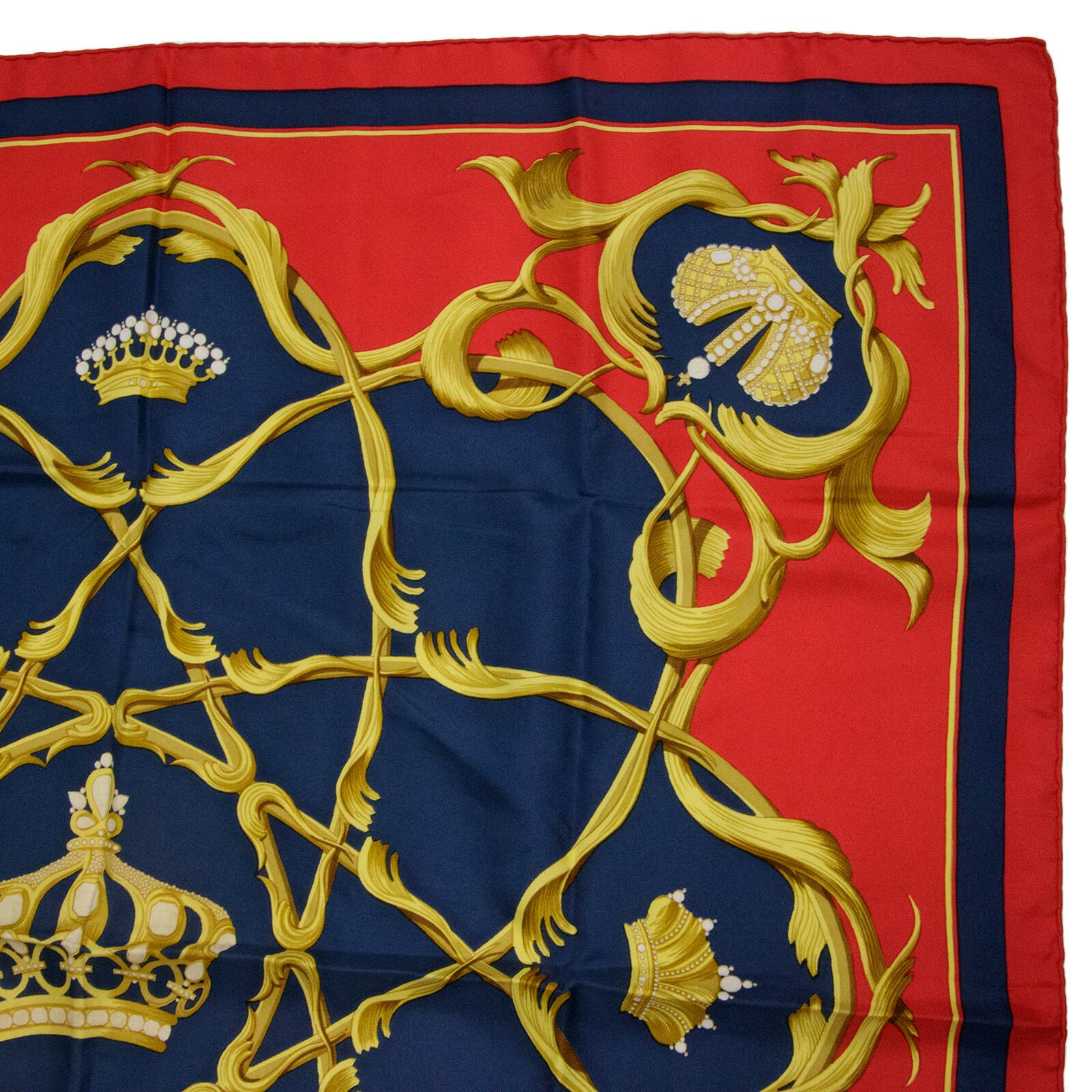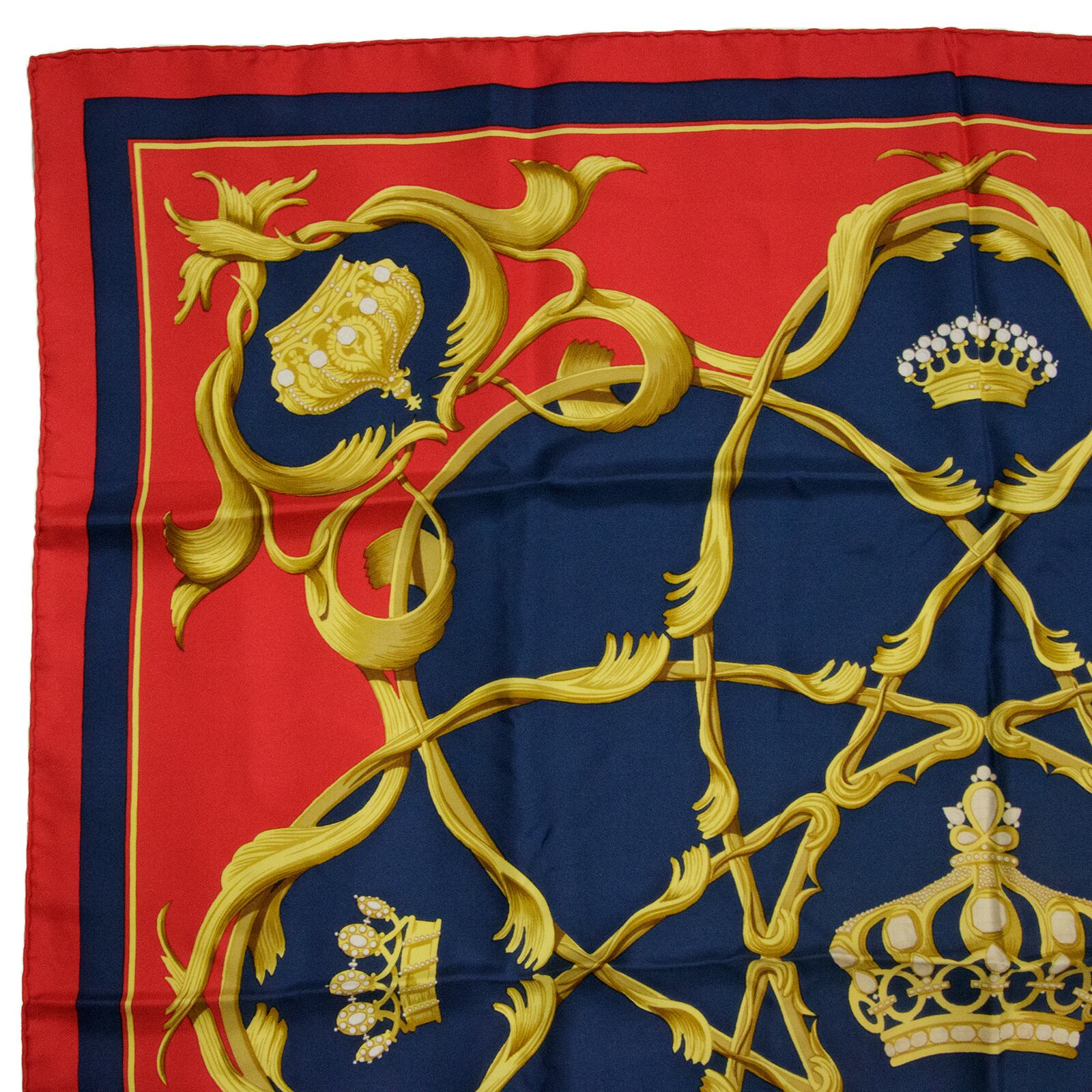 【本物・送料無料・極美品】エルメス・大判スカーフ(カレ90・Couronnes 王冠・シルク・綺麗・ゴールド・レッド・フランス・X025)
