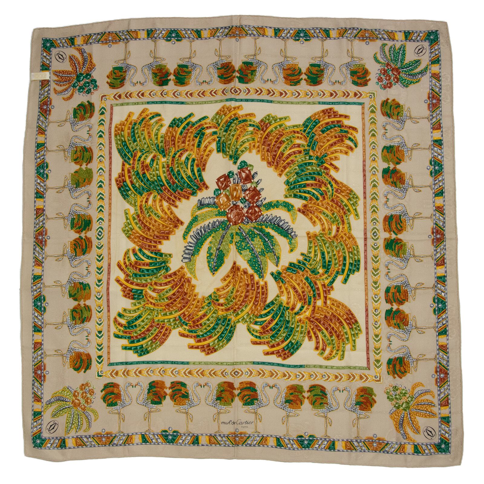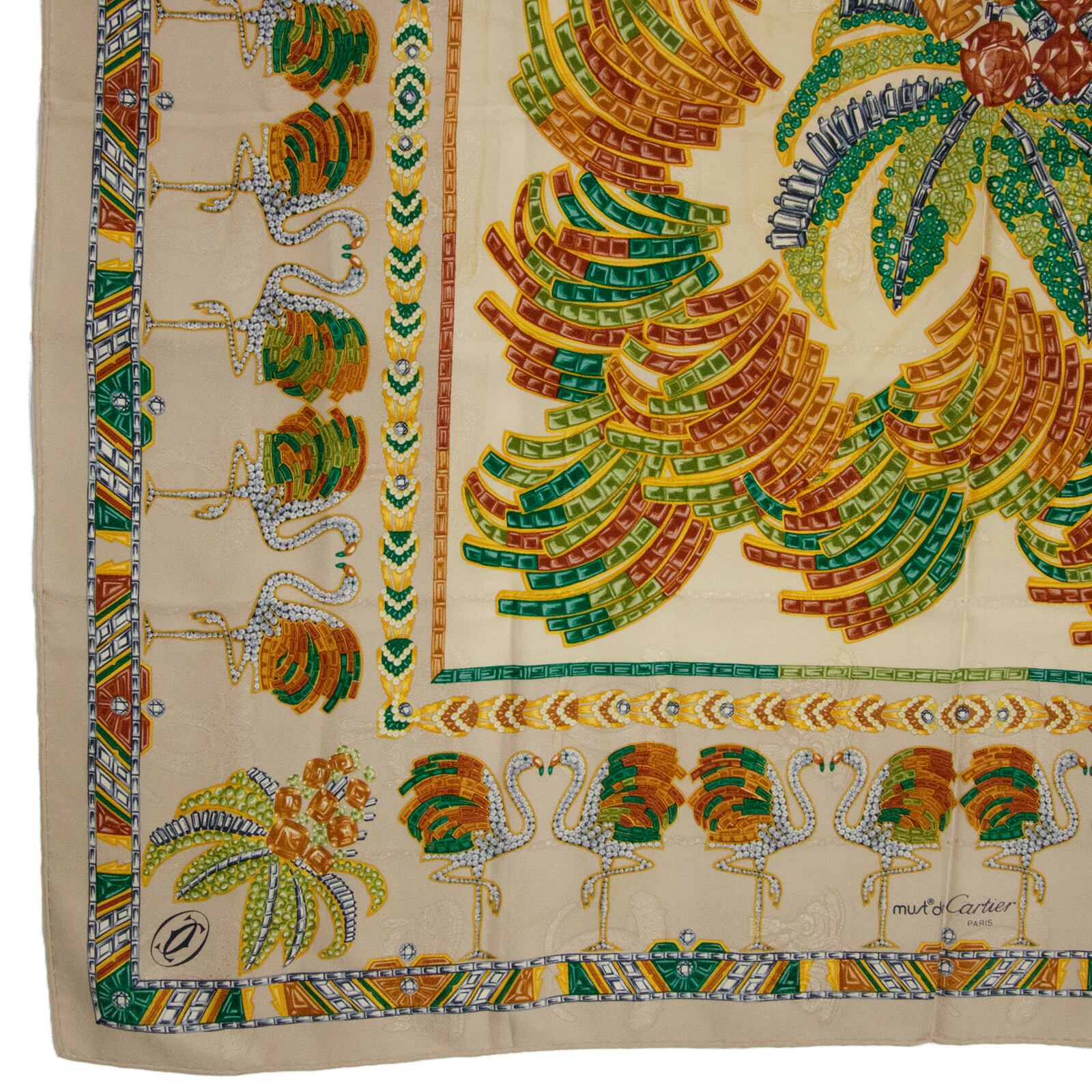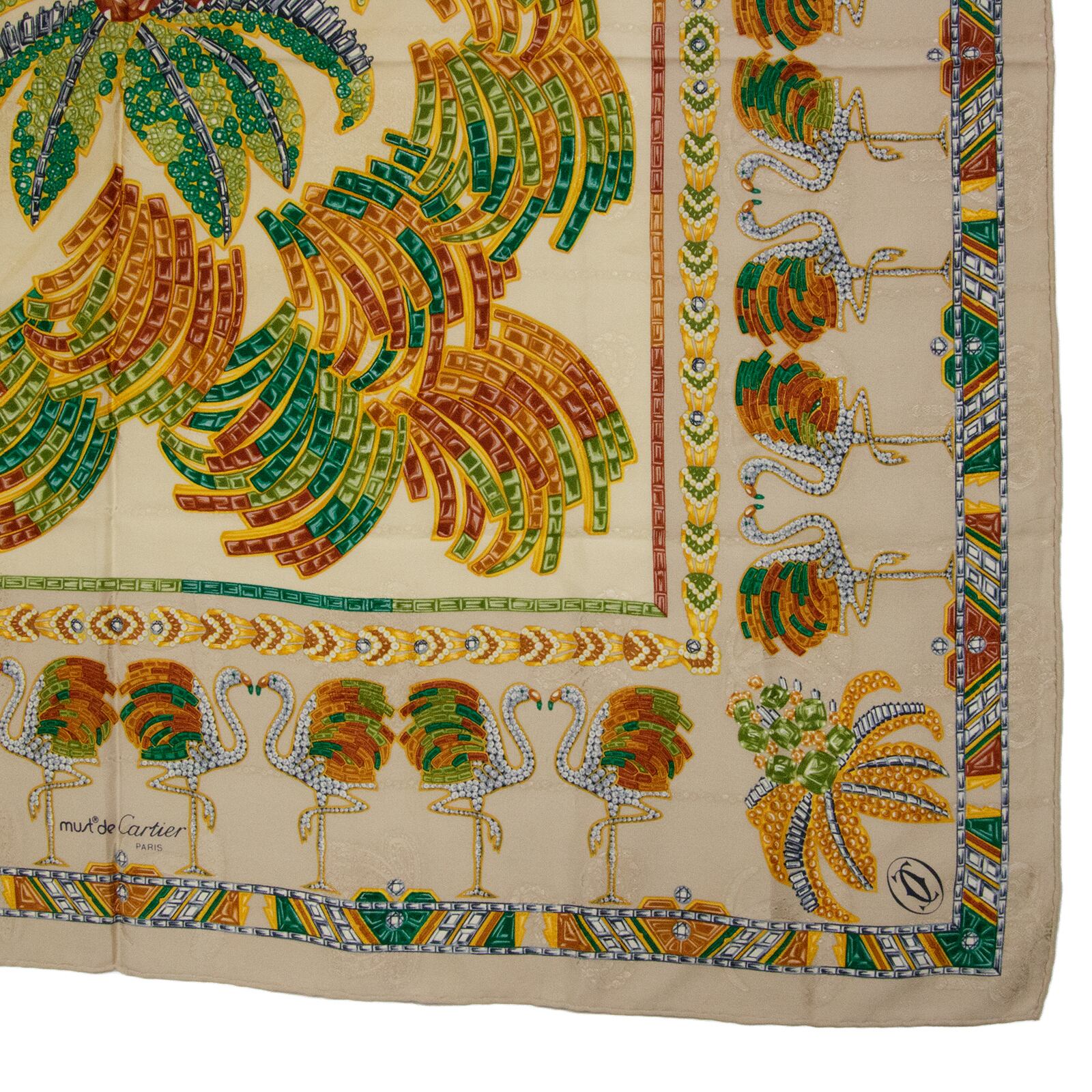 【本物・送料無料・良品】カルティエ・大判スカーフ(シルク・椰子の木・宝石・フラミンゴ・ベージュ・緑色・レア・珍しい・X029)