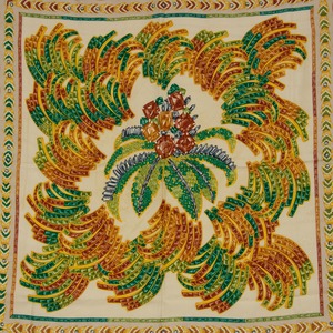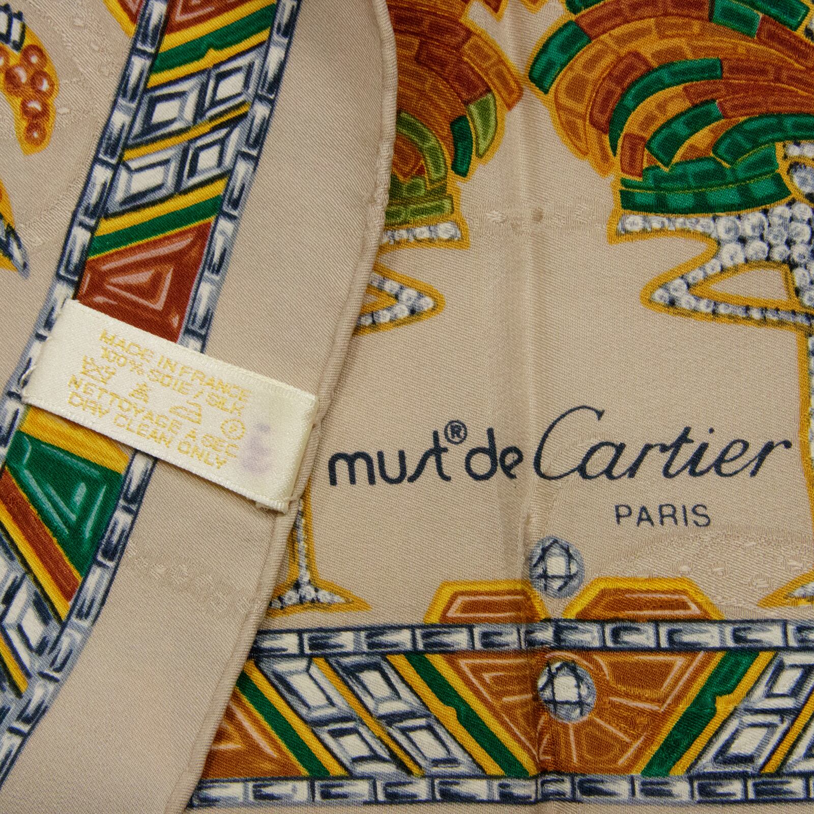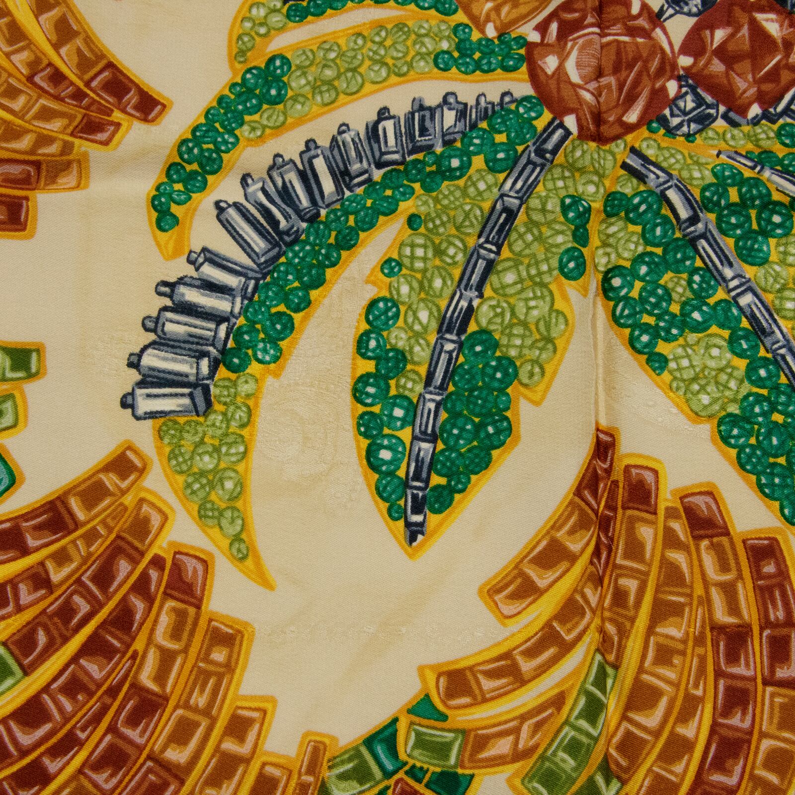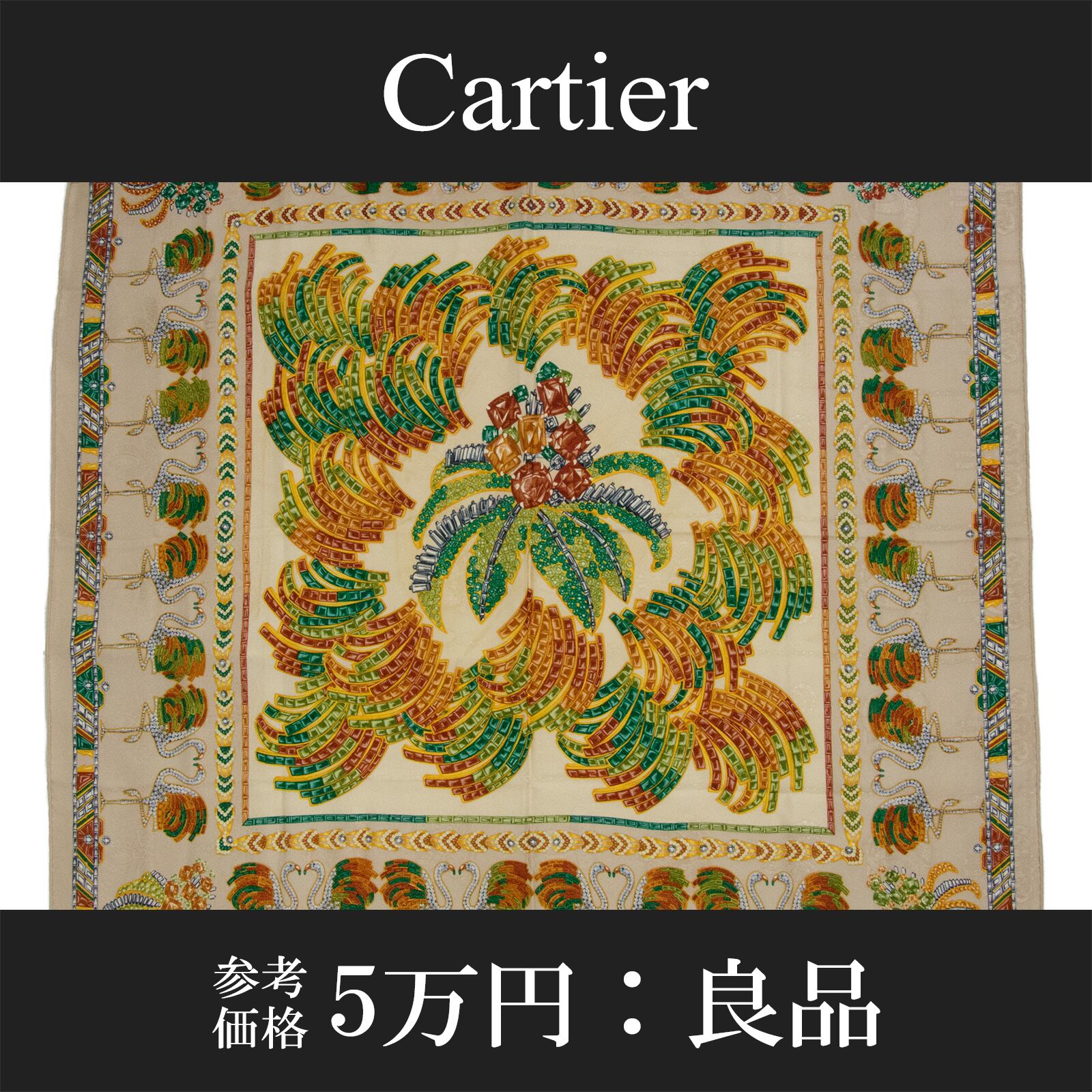 【本物・送料無料・良品】カルティエ・大判スカーフ(シルク・椰子の木・宝石・フラミンゴ・ベージュ・緑色・レア・珍しい・X029)