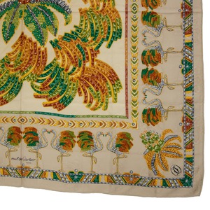 椰子の木に宝石やフラミンゴが繊細に描かれている、カルティエらしい存在感があるスカーフ。全体的に落ち着いた配色でありながら、贅沢で華やかな雰囲気にうっとりさせられます。