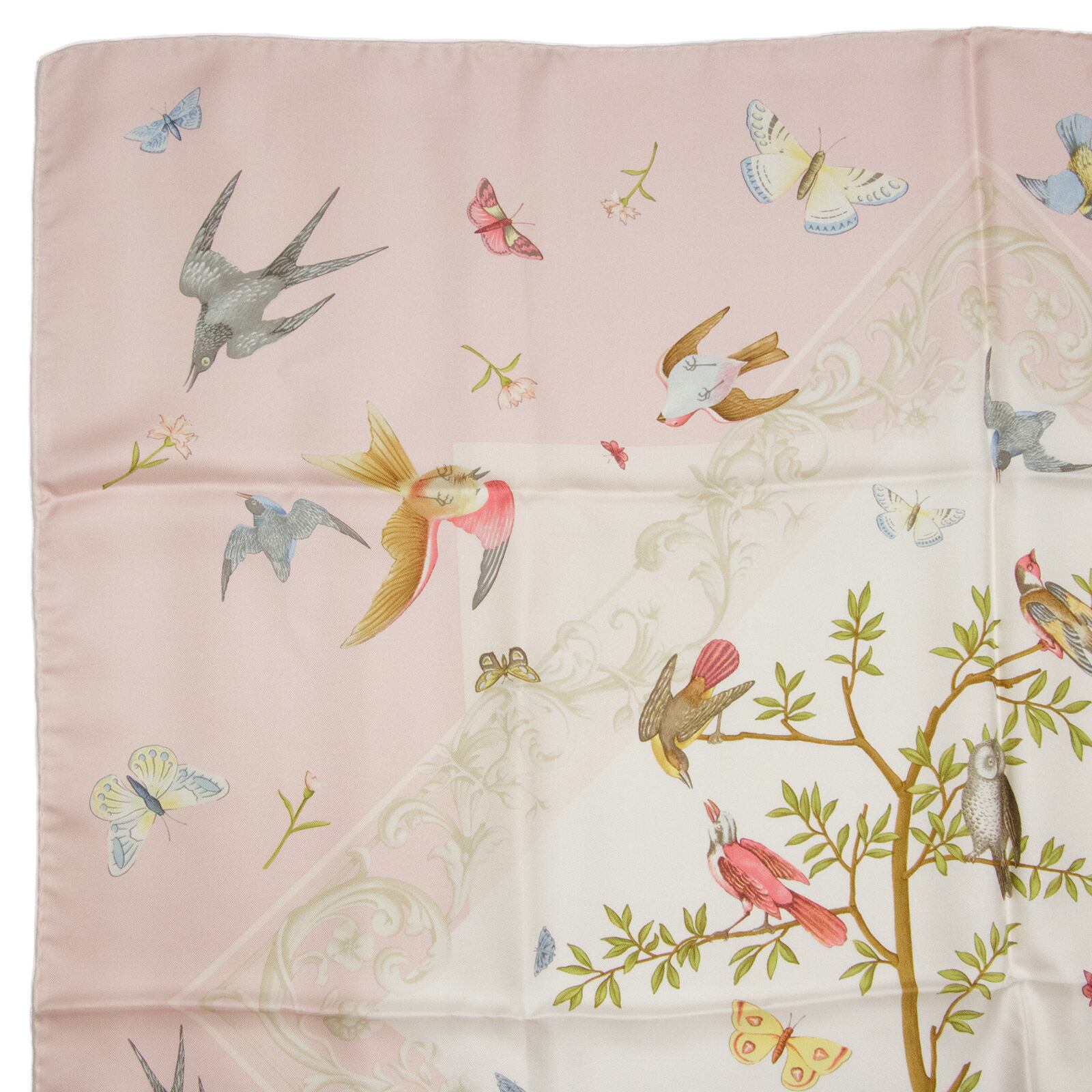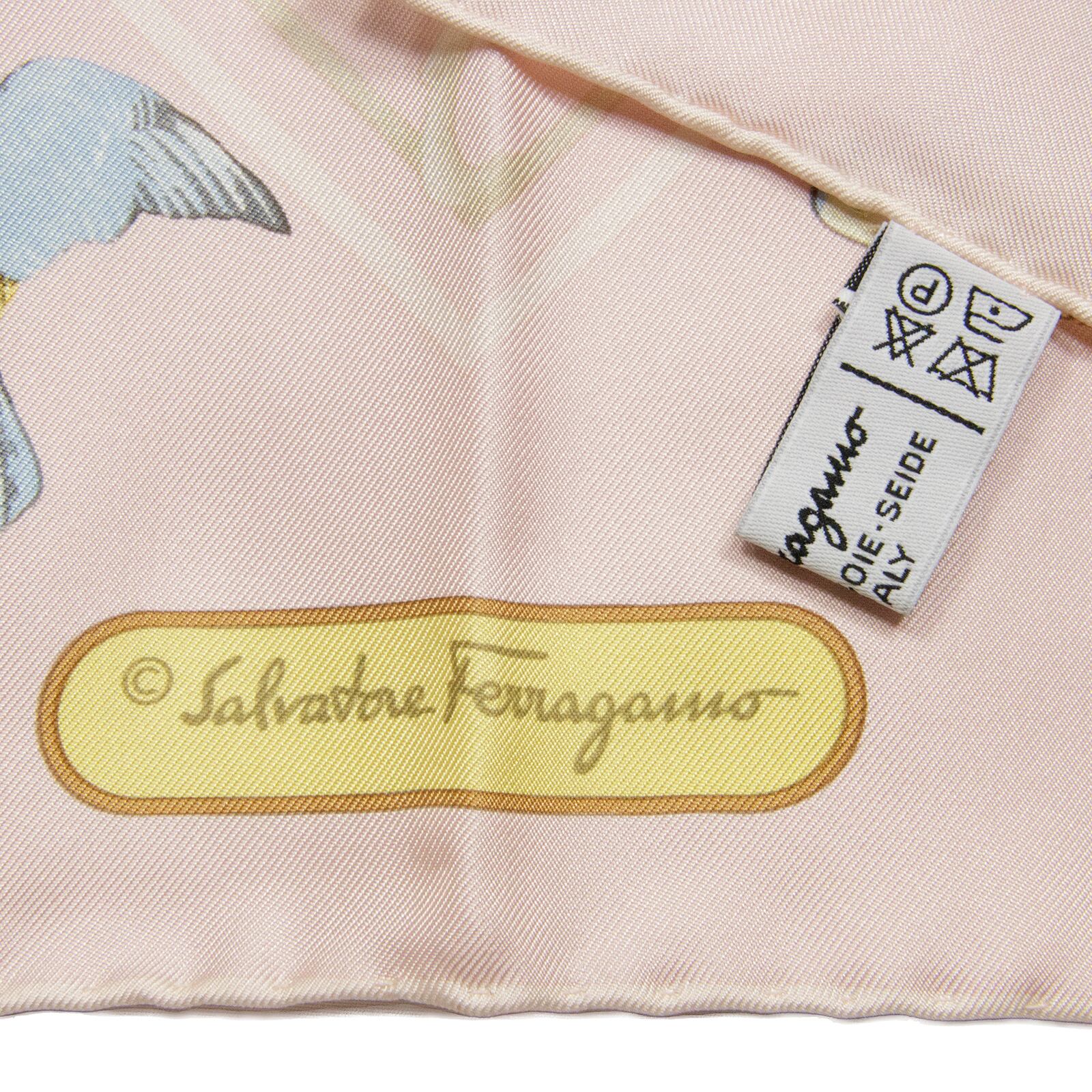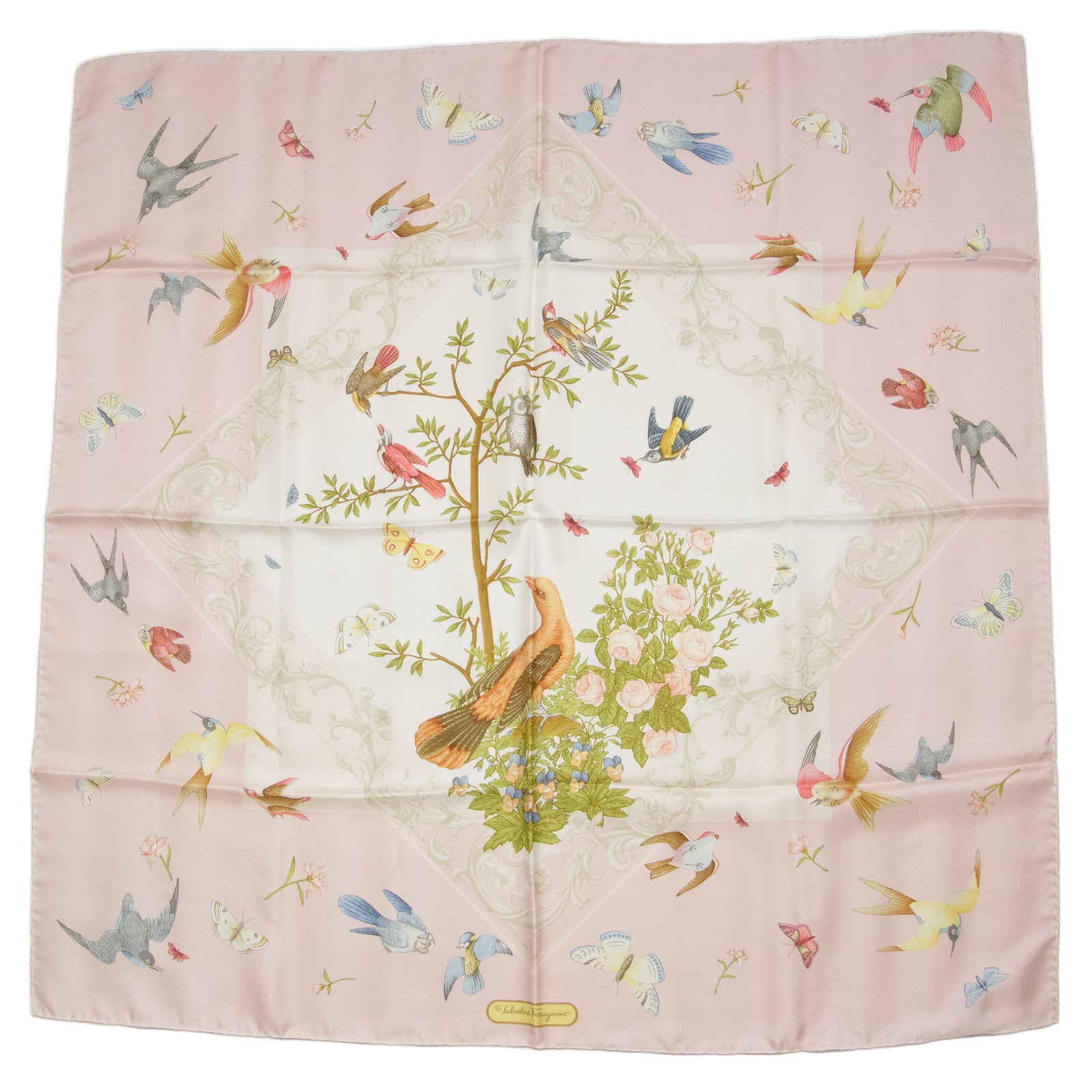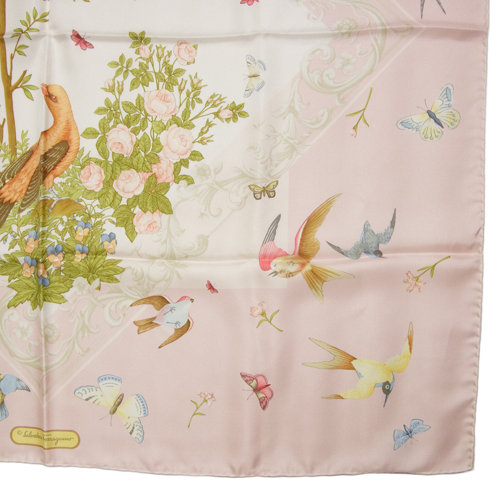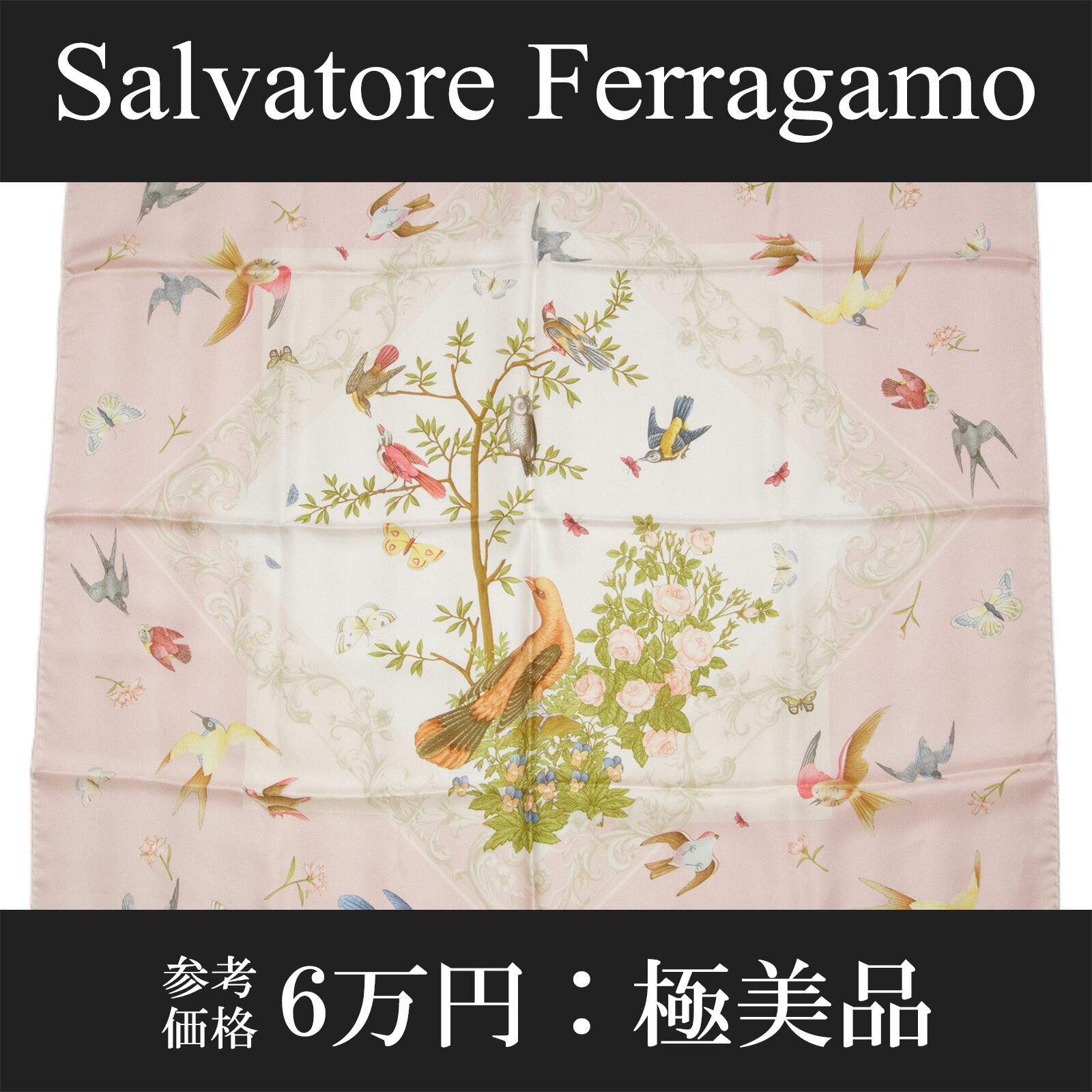 【本物・送料無料・極美品】フェラガモ・大判スカーフ(シルク・綺麗・鳥・蝶々・花・ピンク・白・ホワイト・レア・珍しい・X031)