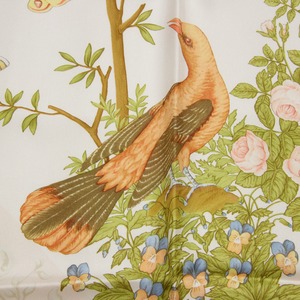 色とりどりの鳥・蝶・花が繊細に描かれており、フェラガモらしい優しい色使いで、まるで楽園のような自然の美しさと穏やかで優雅な雰囲気にうっとりさせられる逸品でございます。