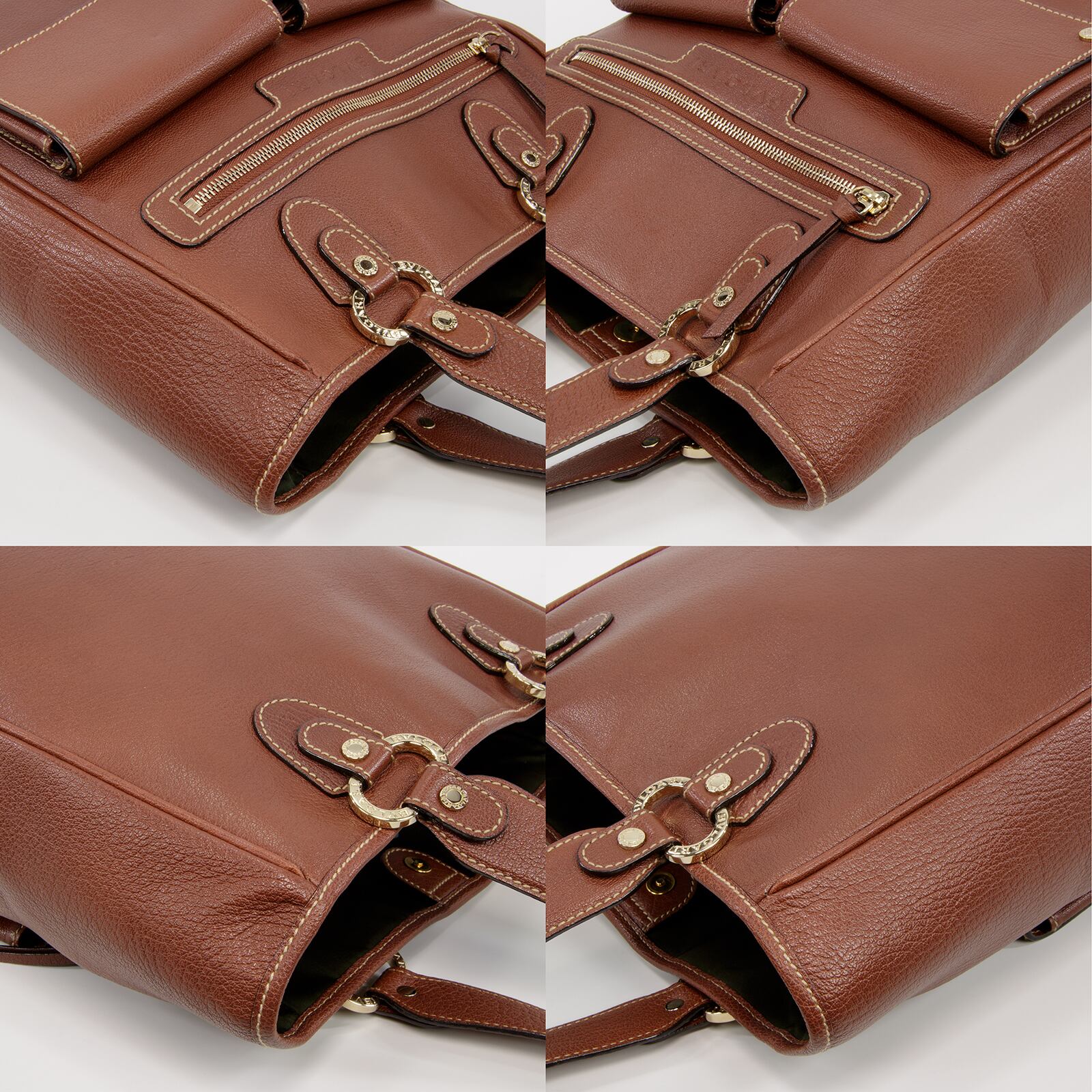 20個のゴールドカラーの金具すべてに「BVLGARI」が刻印されており、全体的に落ち着いた配色でありながら、一目でブルガリとわかる存在感とエレガントな大人の魅力が感じられる逸品でございます。